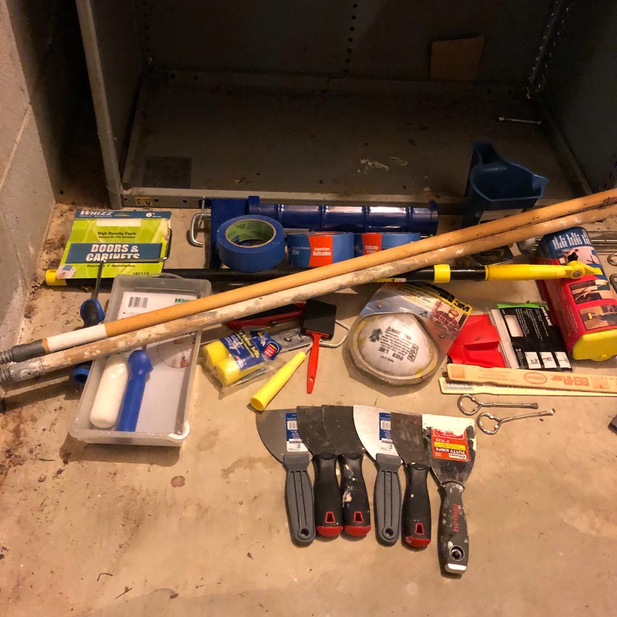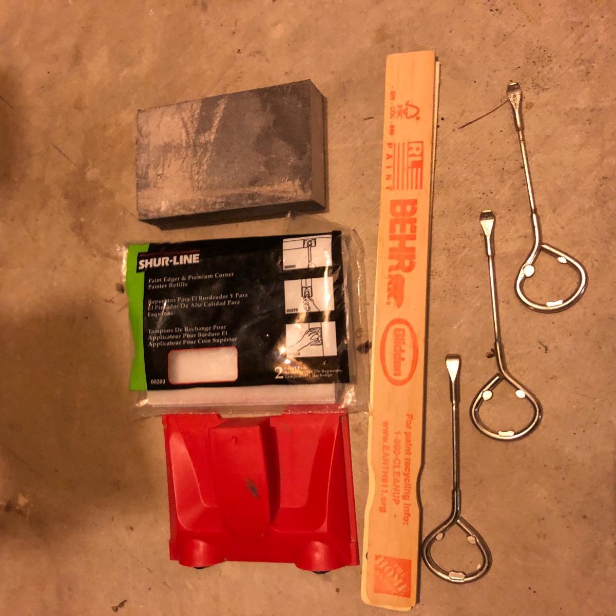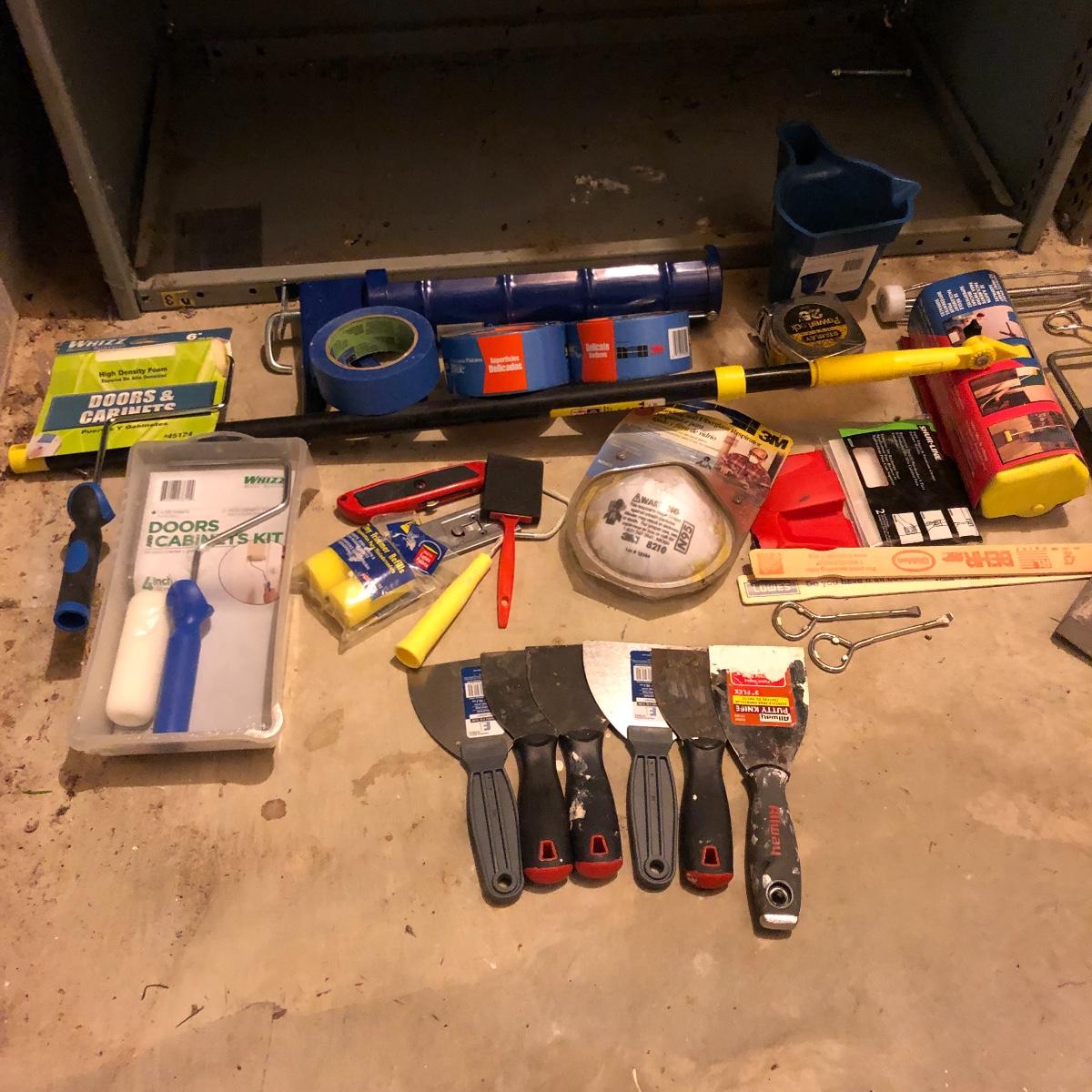 Spruce up your home with this selection of painting supplies. Lot includes five putty knives, three rolls of painters tape, edge painter, large caulking gun, paint trim cup, two wooden handles and more.