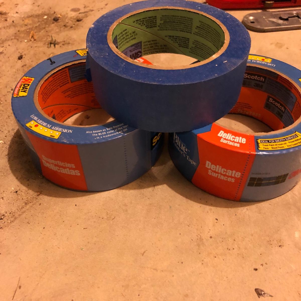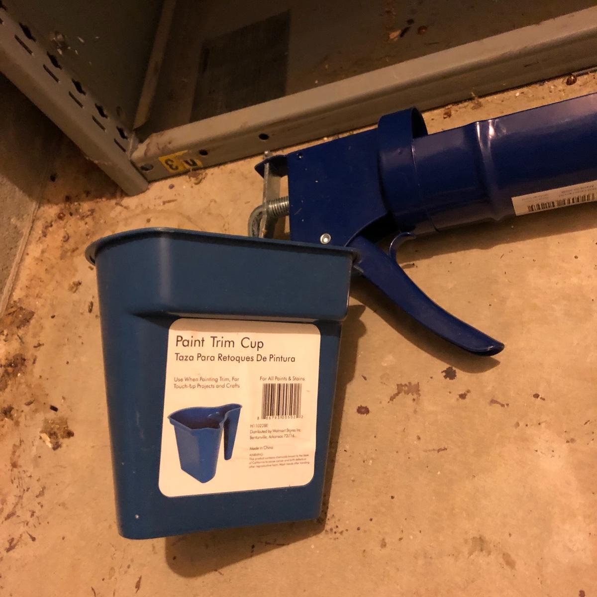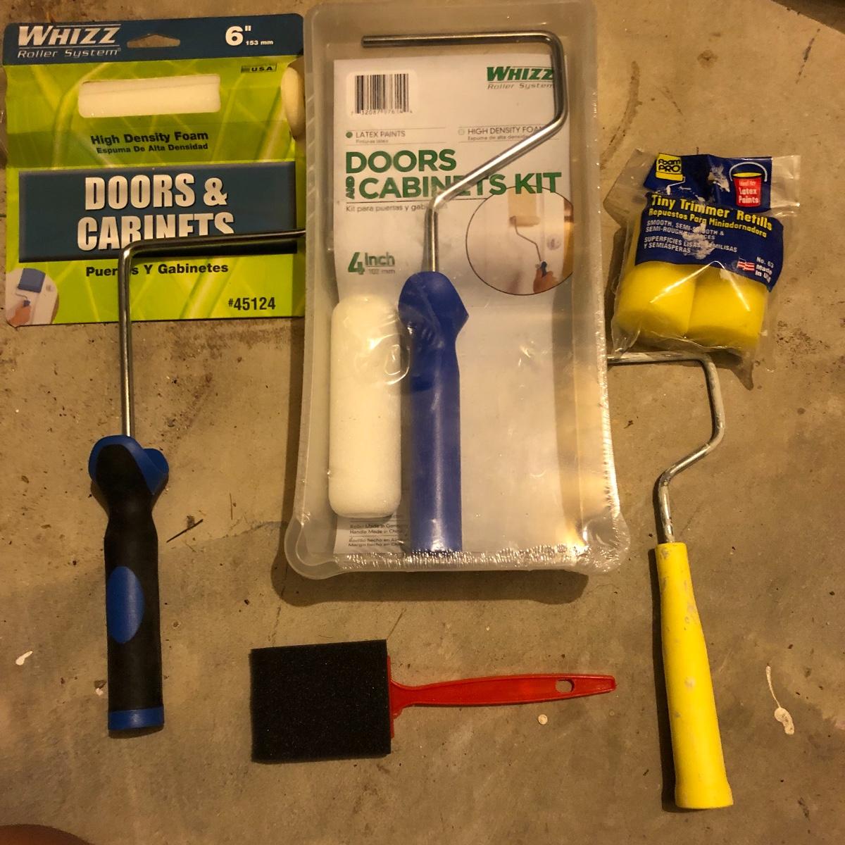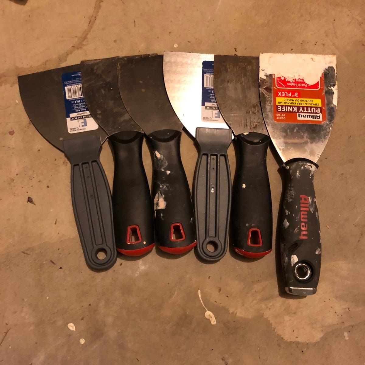 Spruce up your home with this selection of painting supplies. Lot includes five putty knives, three rolls of painters tape, edge painter, large caulking gun, paint trim cup, two wooden handles and more.