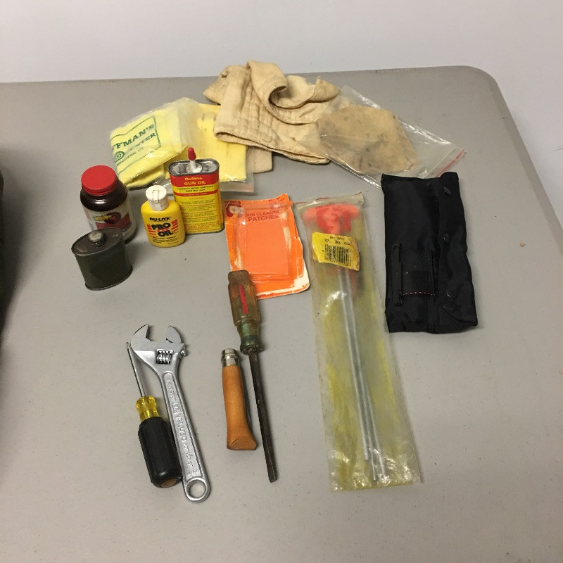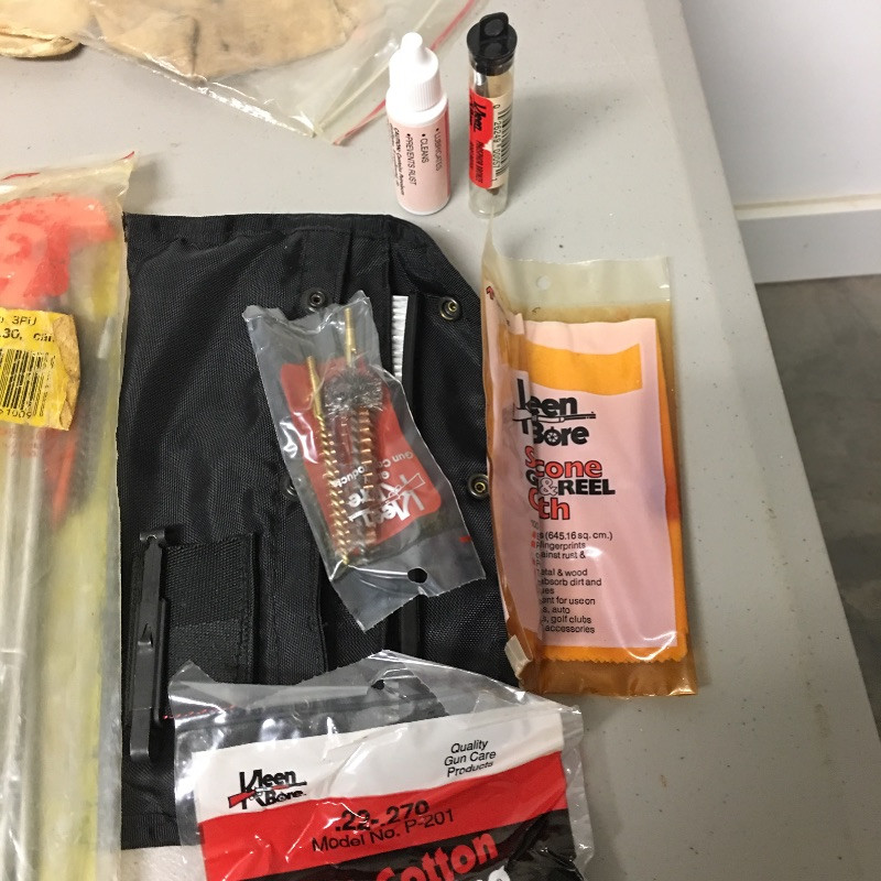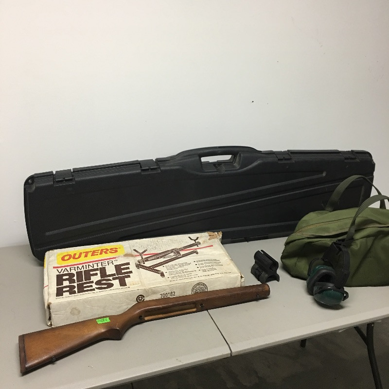 Rifle case, rifle cleaning materials, rifle stock, Outers rifle rest and ear protection. Keep your weapon clean and safe with this nice case and cleaning materials.