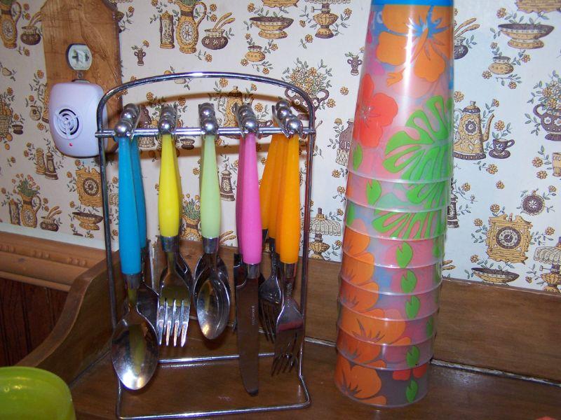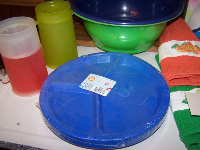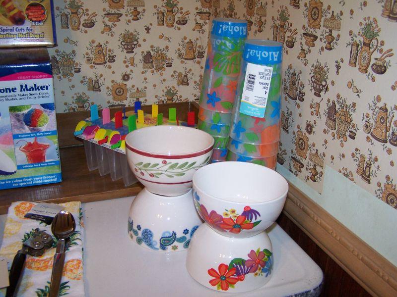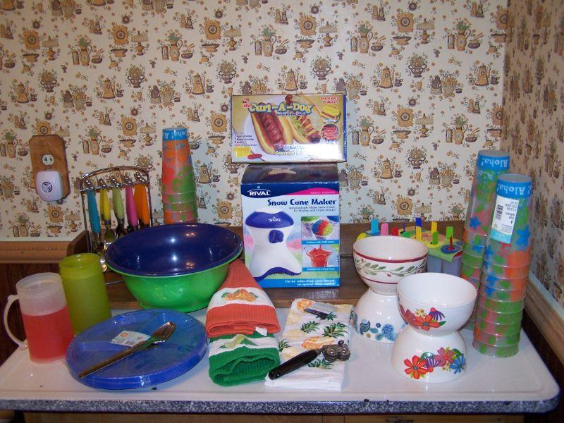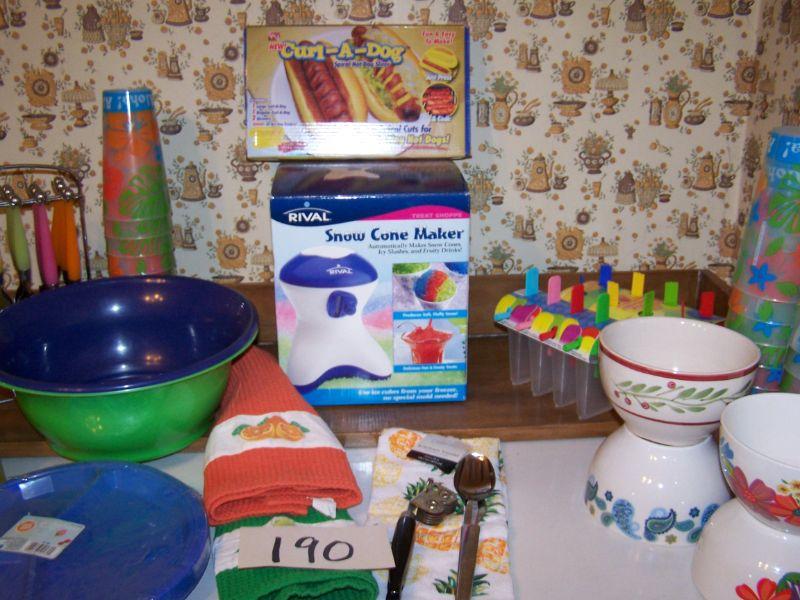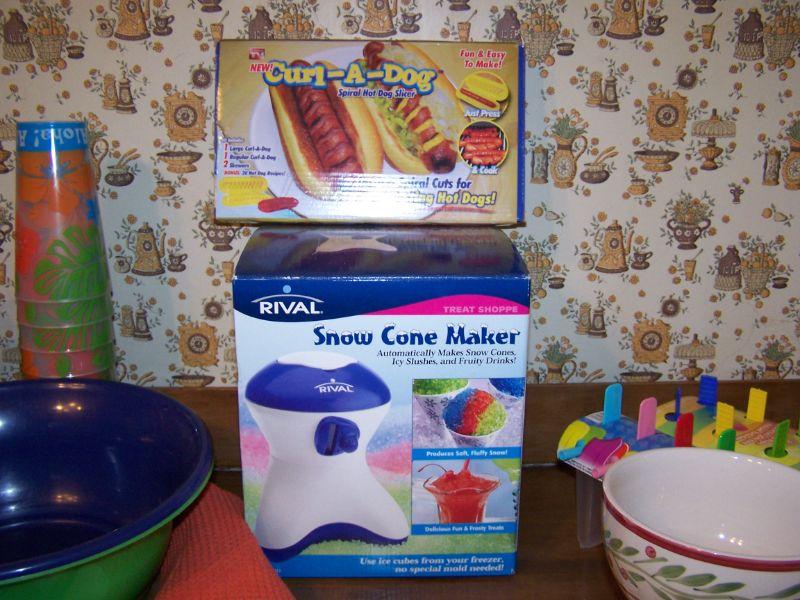 SNOW CONE MAKER, CURL-A-DOG, COLORFUL SUMMERTIME DISHES, SILVERWARE, CUPS, BOWLS, POPCYCLE MAKERS AND MORE INCLUDES LARGE LIDDED WICKER BASKET.