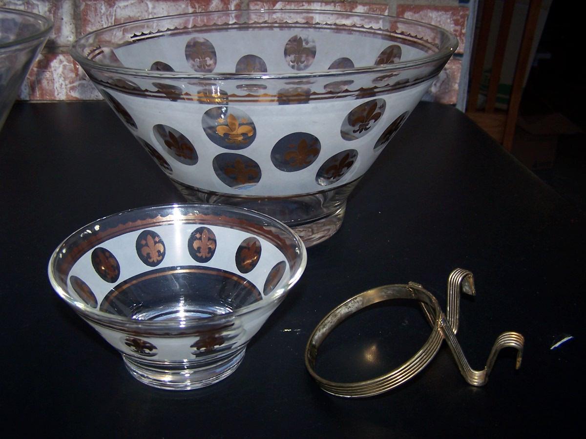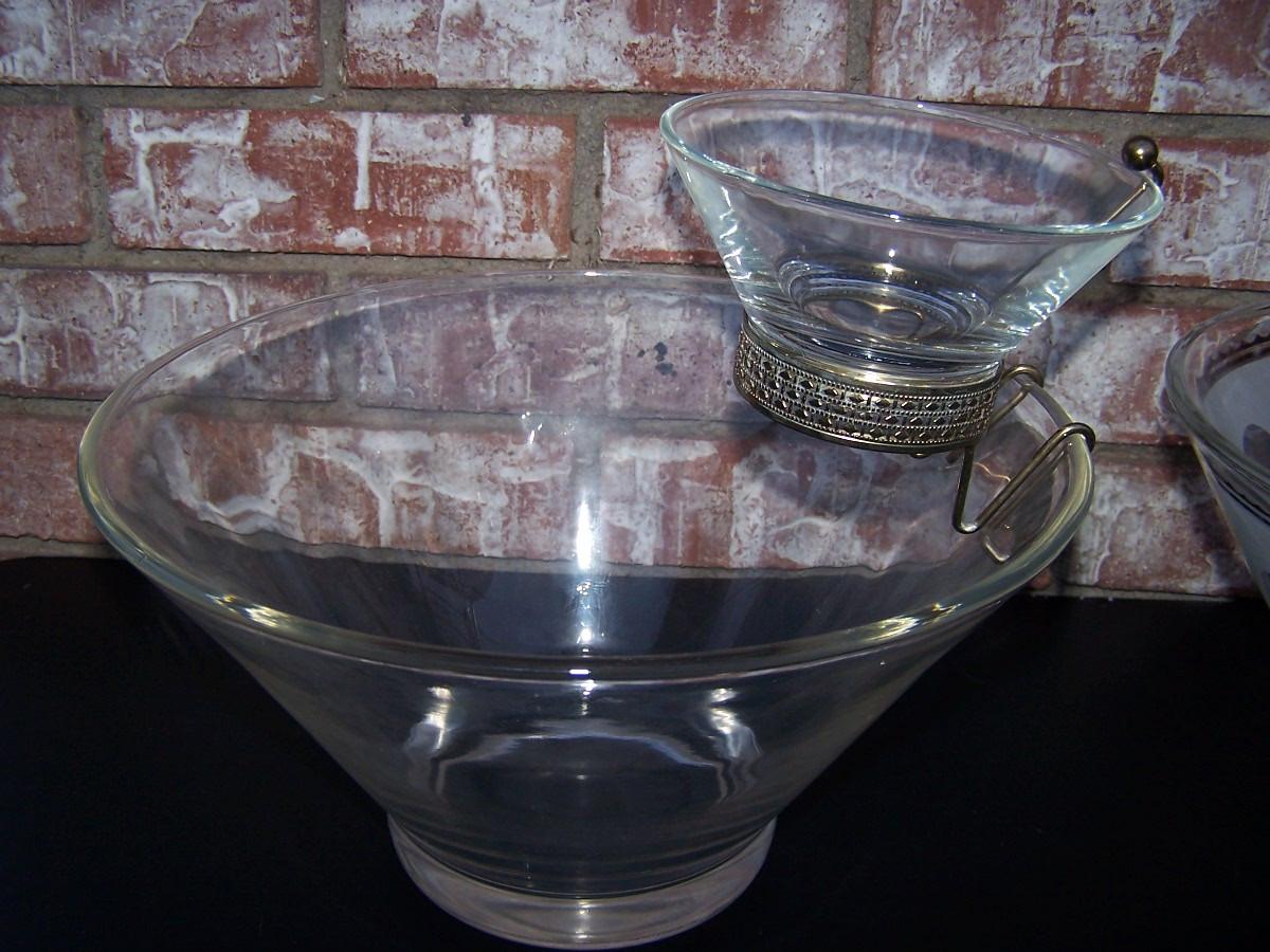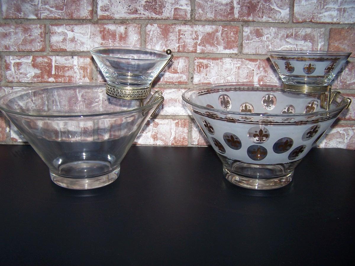 THESE ARE SUPER MID-CENTURY CHIP/DIPS SETS!!! THEY ARE GLASS WITH METAL HOLDERS... UNMARKED... THE LARGE BOWL IS 6'' TALL... SLIGHT WEAR....