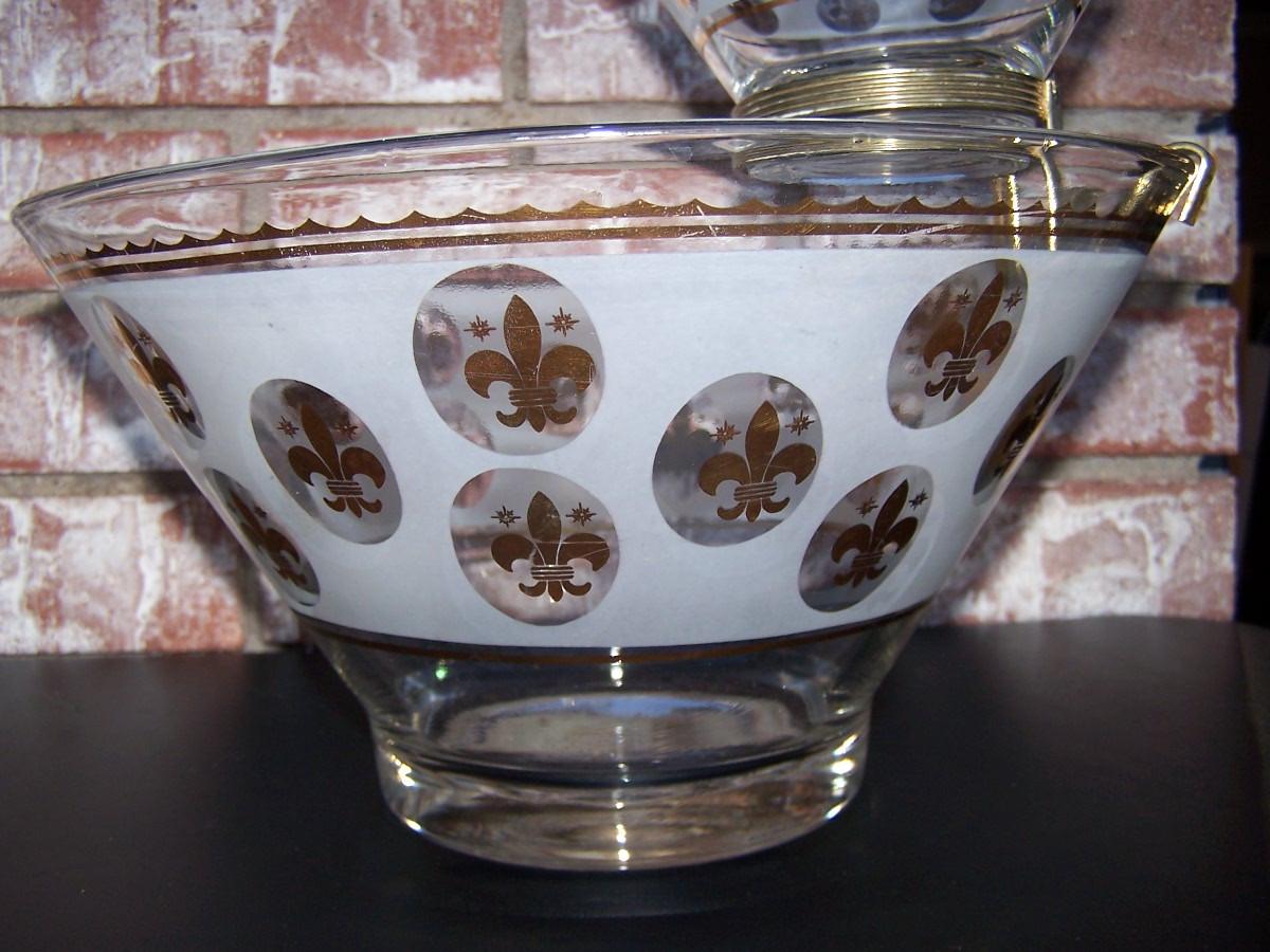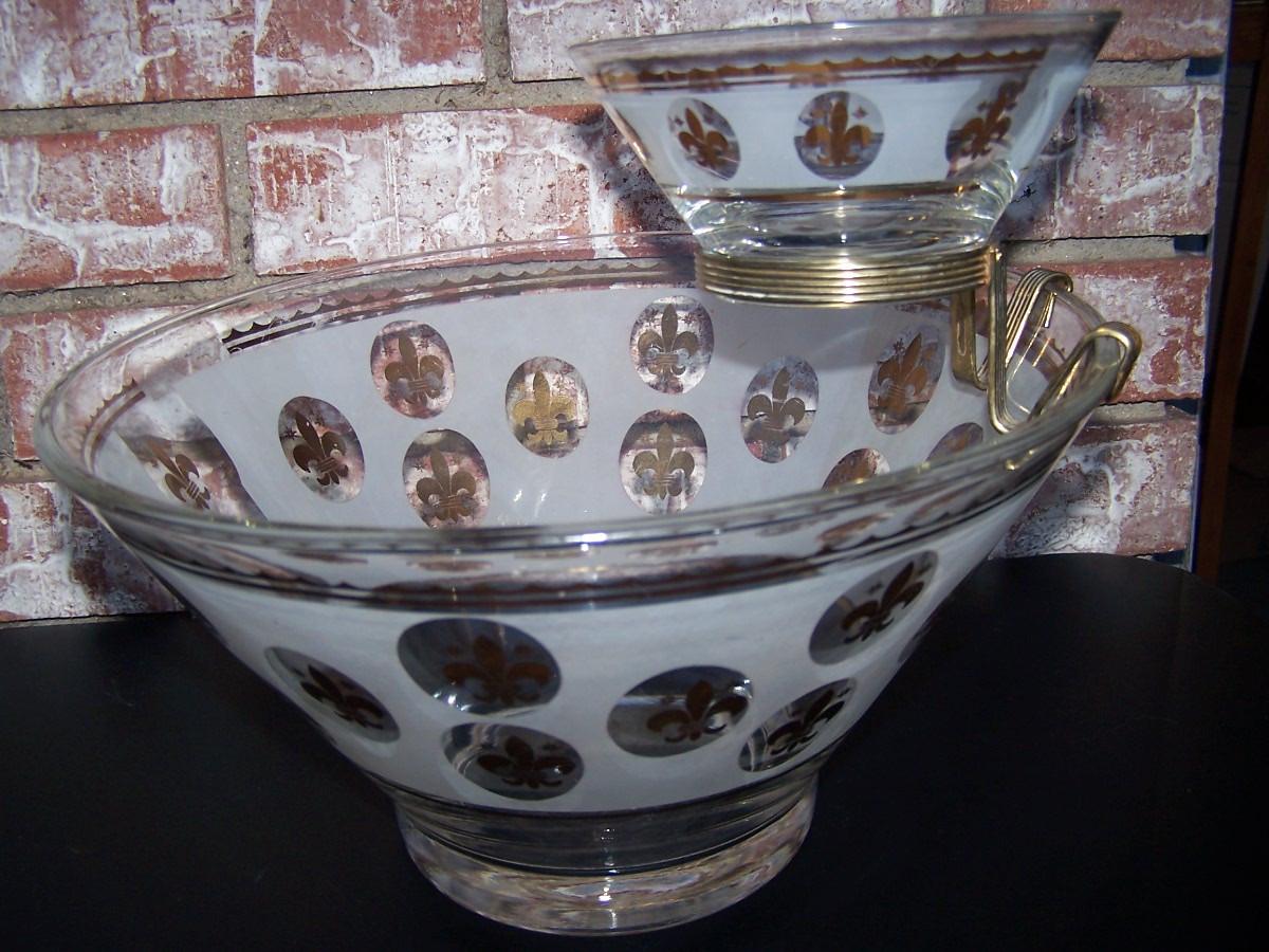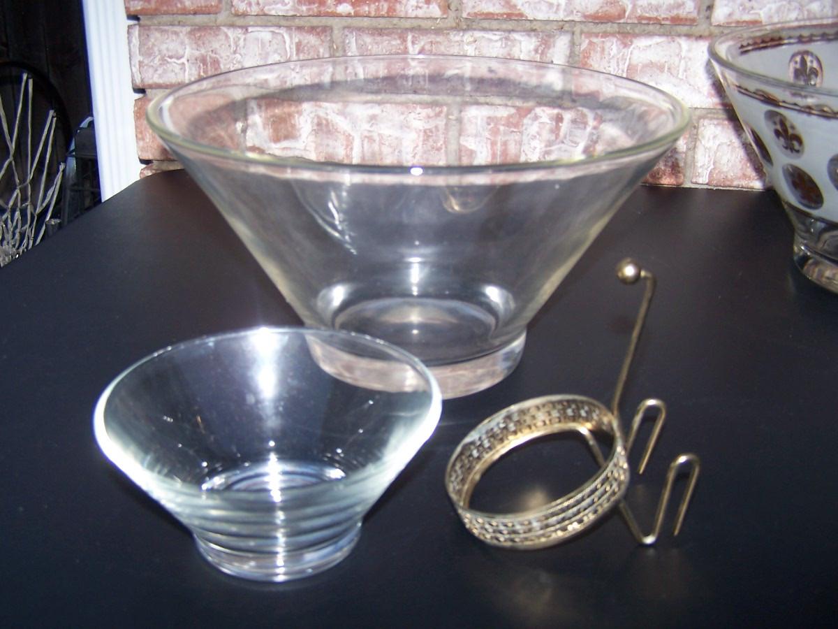 THESE ARE SUPER MID-CENTURY CHIP/DIPS SETS!!! THEY ARE GLASS WITH METAL HOLDERS... UNMARKED... THE LARGE BOWL IS 6'' TALL... SLIGHT WEAR....