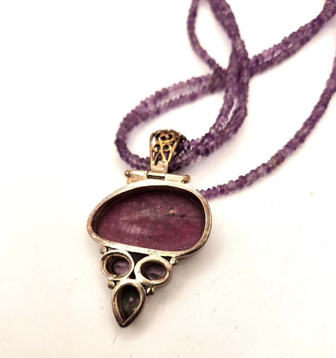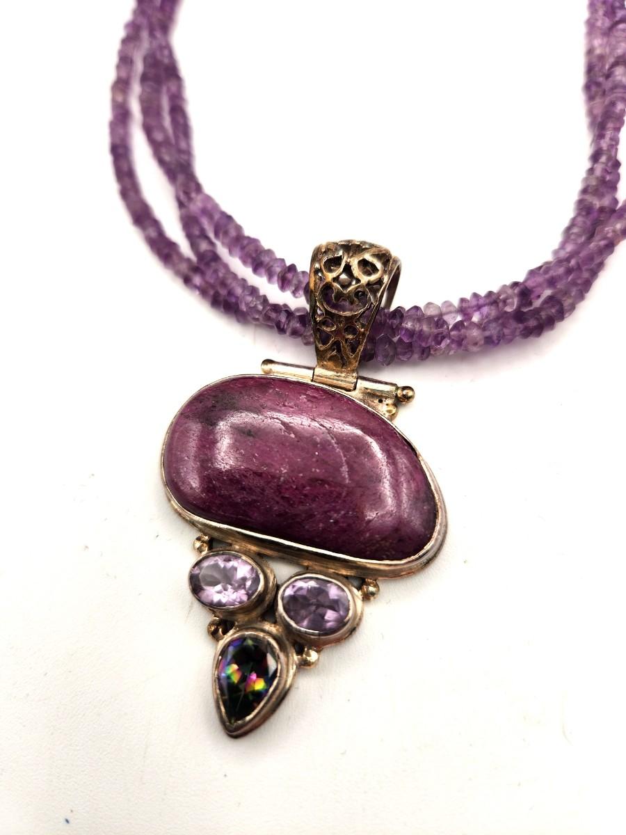 Artisan three strand (chip amethyst) necklace with cabochon amethyst set in sterling silver along with 3 faceted amethysts. An intriguing design that would look great with a crisp white linen blouse.