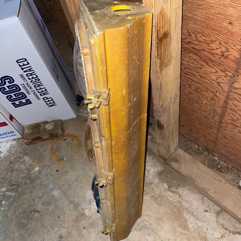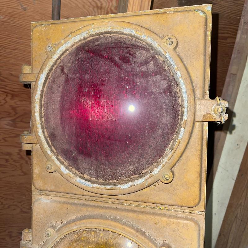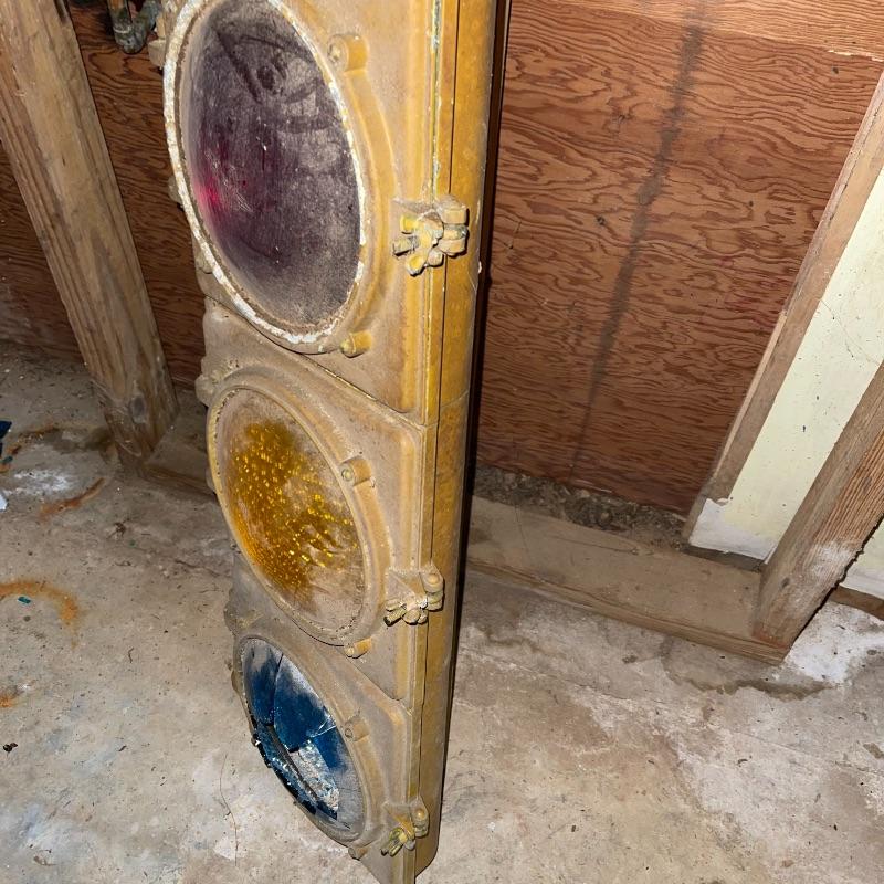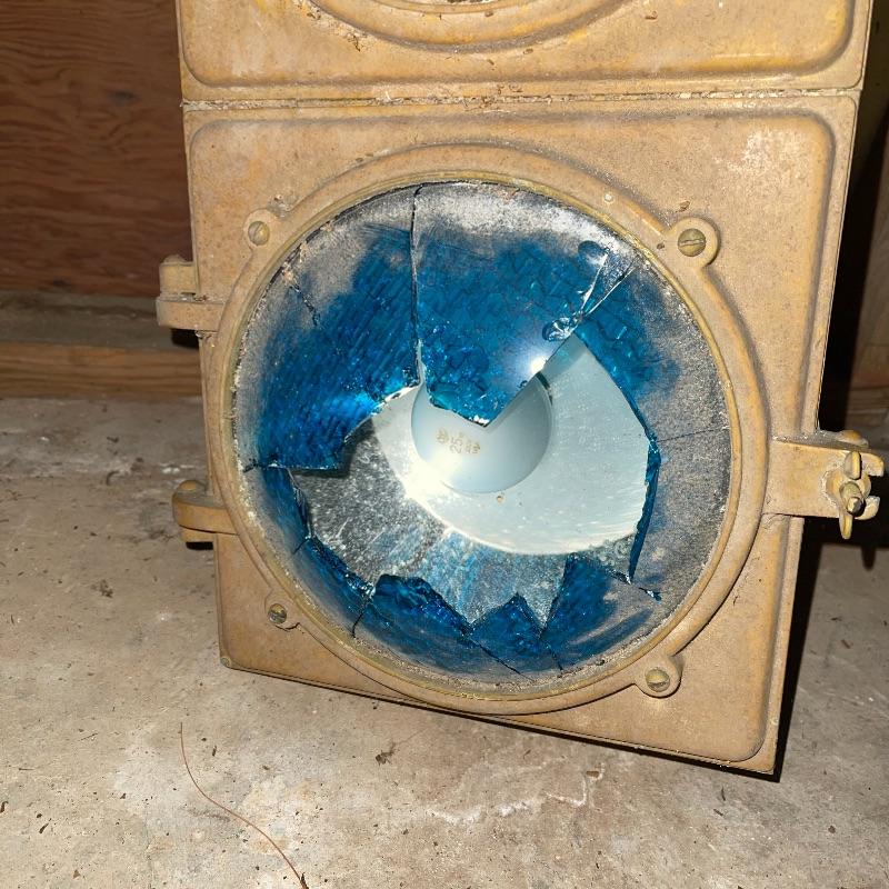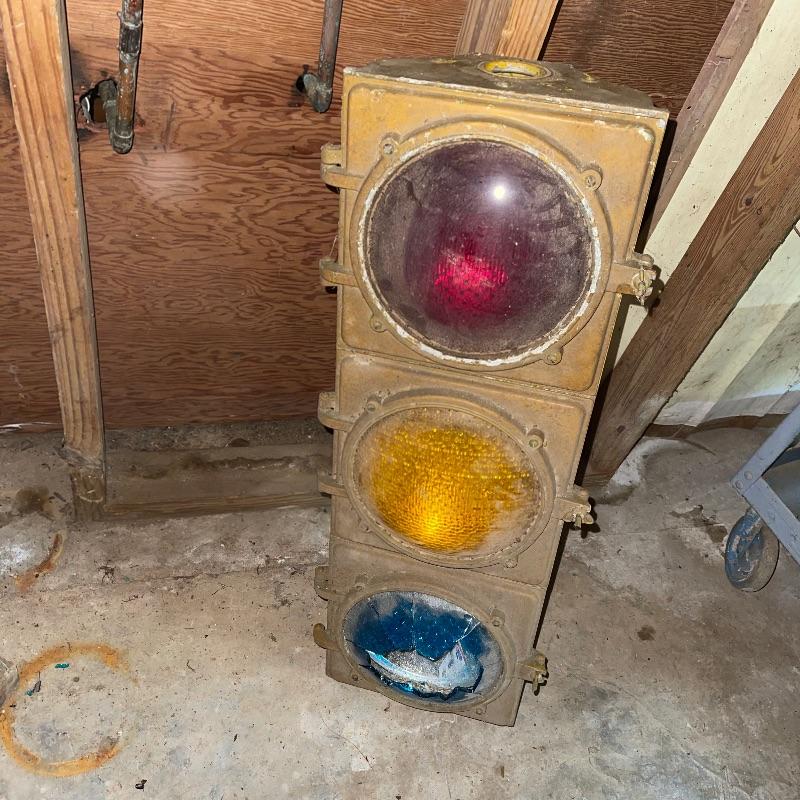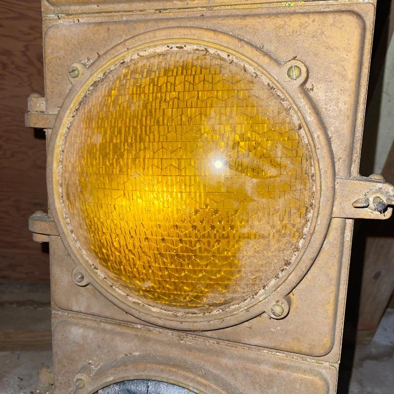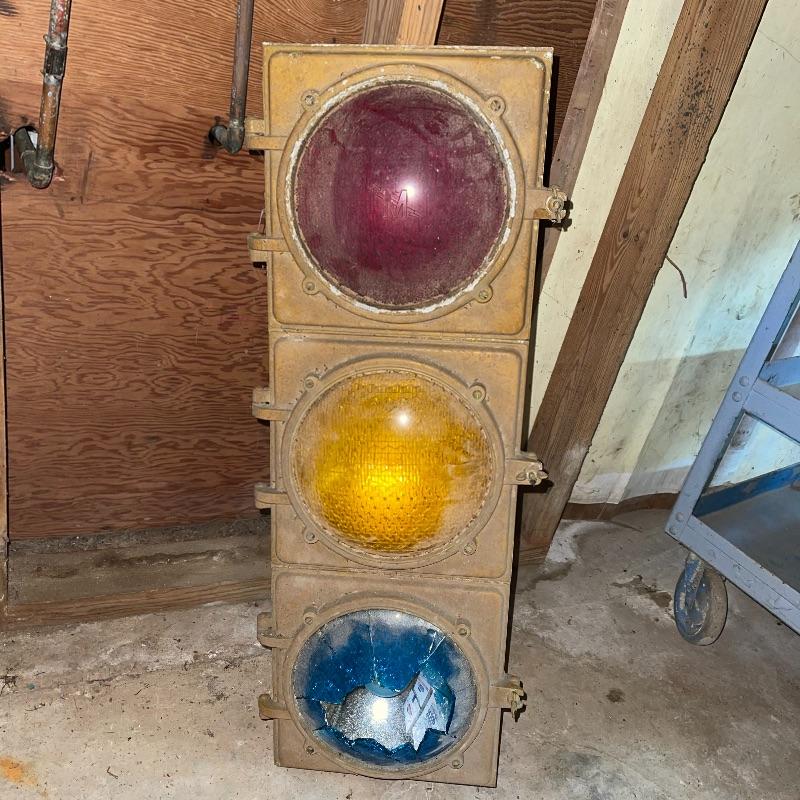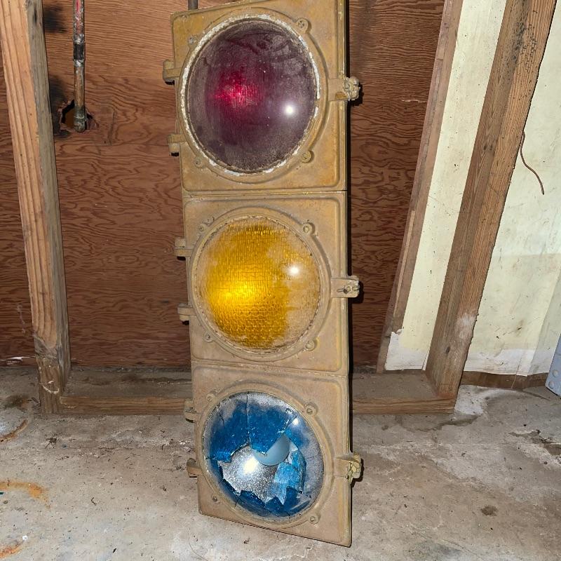 Traffic light with intact yellow and red lights, blue glass on bottom light is broken. A little over 30 inches tall. Unsure about working conditions, no cords. Fun wall hanging conversation piece though, huh?