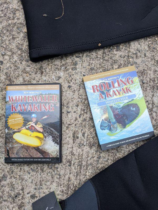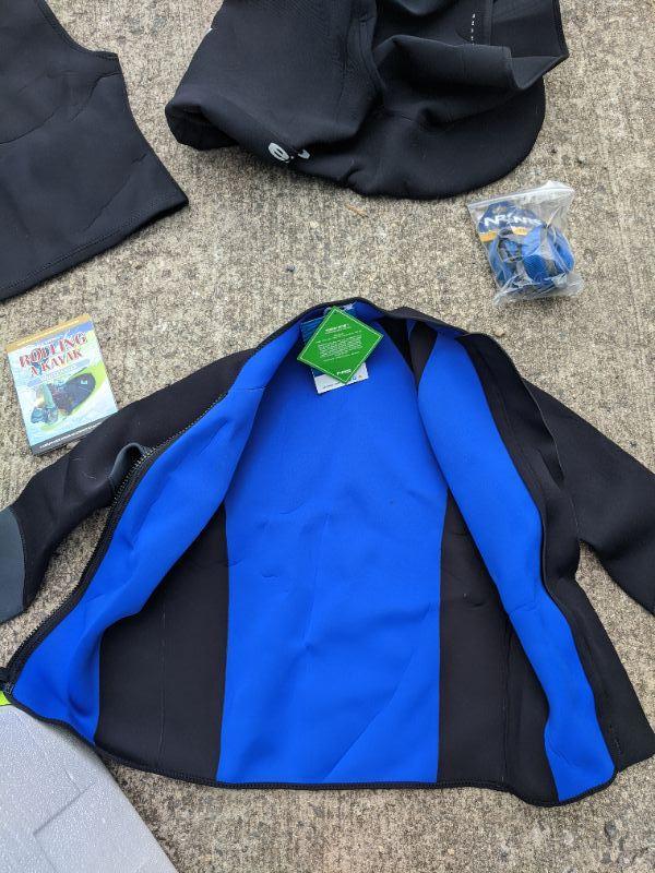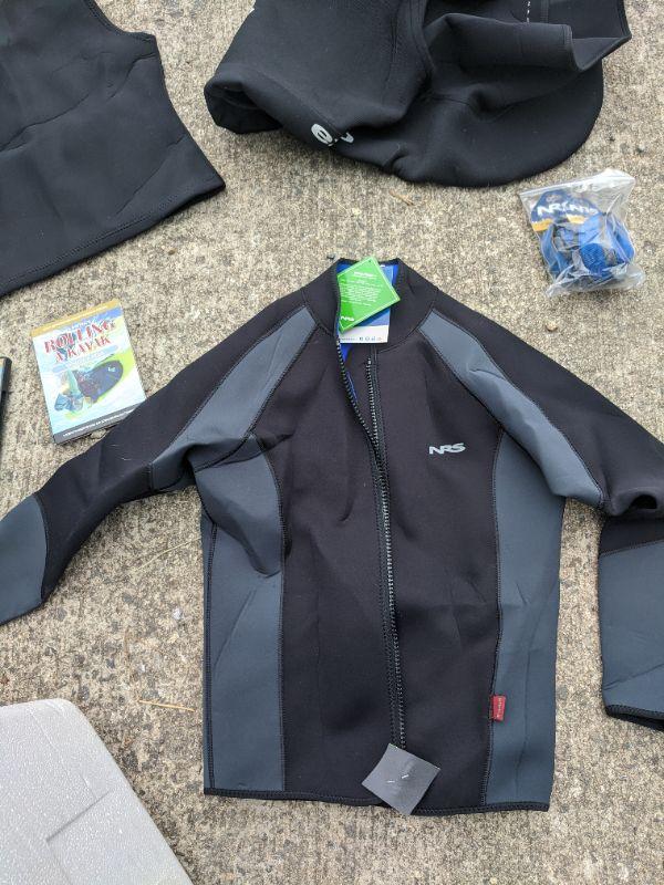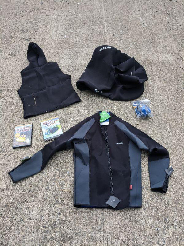 This lot has 6 items. The first is a kayak Snap Dragon Cockpit Skirt, the size is unknown. The next is a XL NRS wetsuit jacket with no hood. Then a vest with a hood the size and brand is unknown. Also included in this lot are a pair of 1" NRS padded straps. Finally there is a DVD instruction set for new and experienced paddlers. Hit the river and start paddling your way to fun this summer through fall. Shipping available.