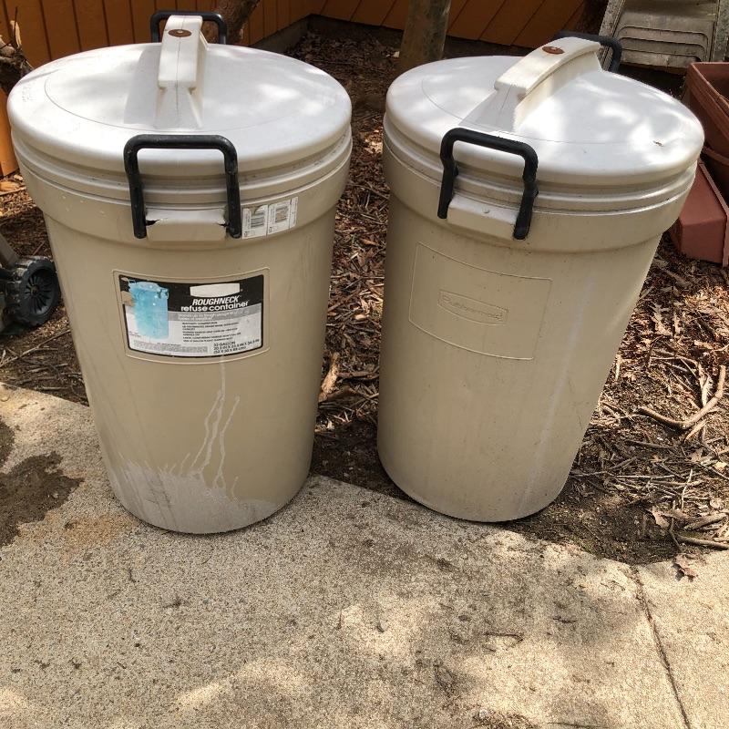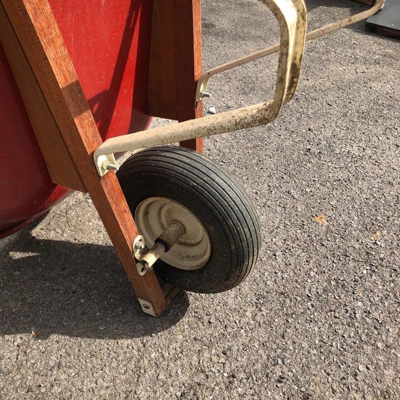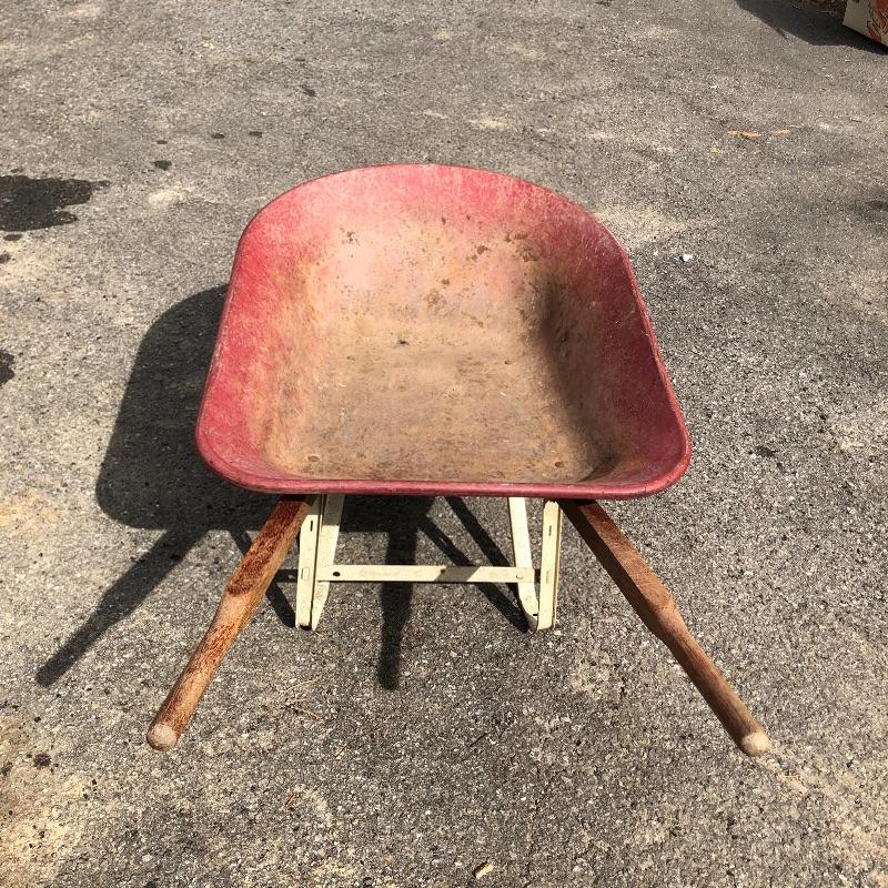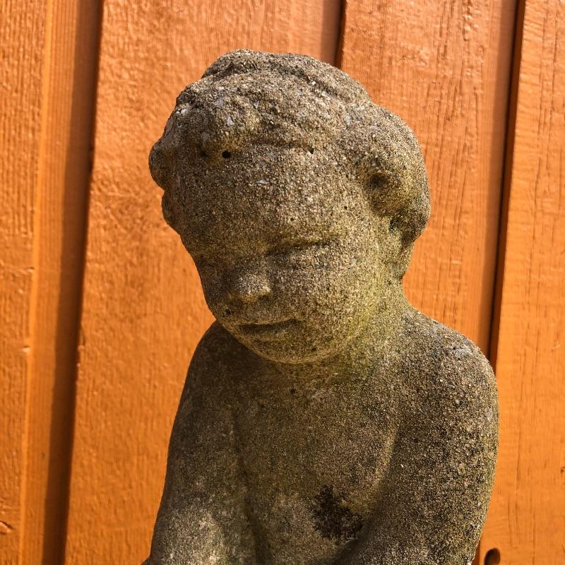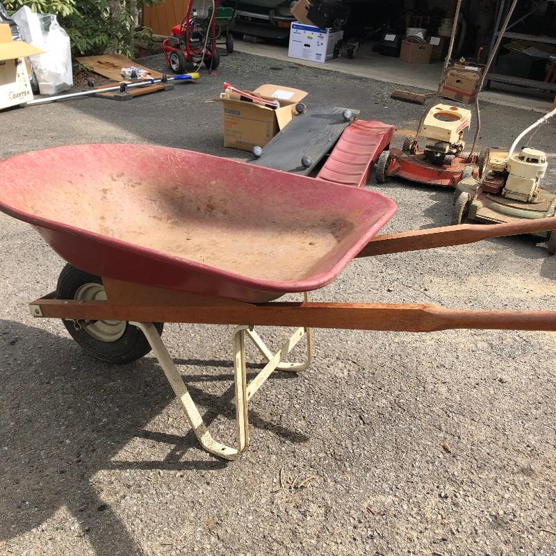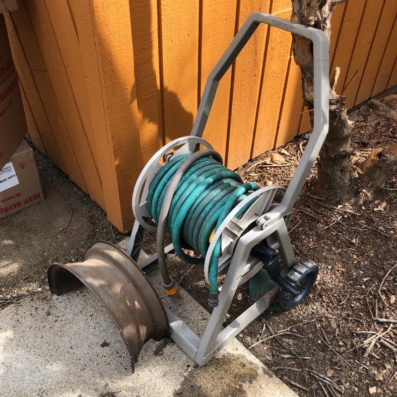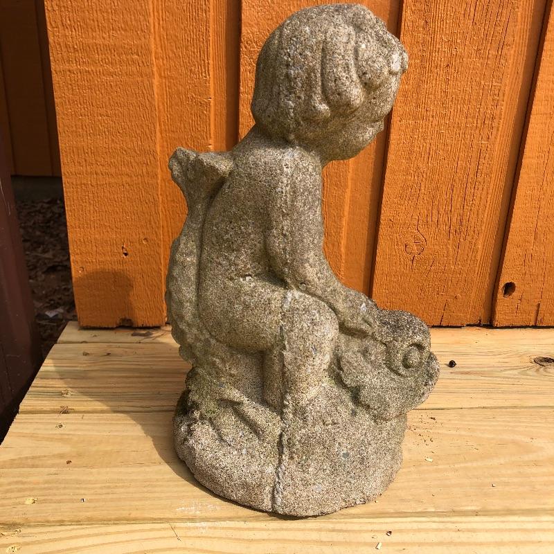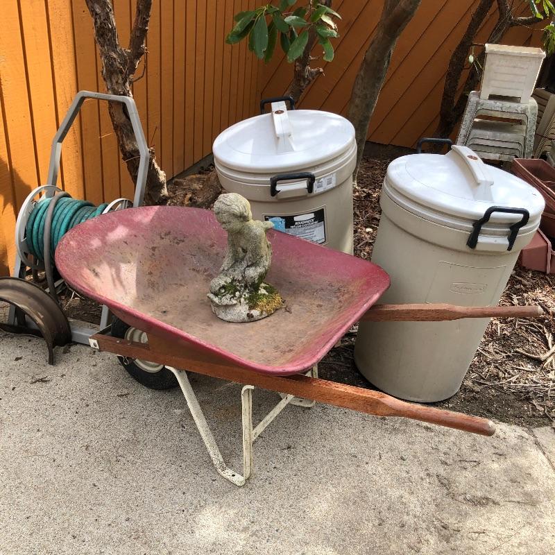 Lots of useful items for the yard and garage here. The metal wheelbarrow is in good shape with a little surface rust. Hose comes with a wheeled holder and there is an additional metal hanging hose holder. The two trash cans are Rubbermaid. The cement ornament of a boy and a fish measures 15” tall; it does have two areas that are chipped, see images.