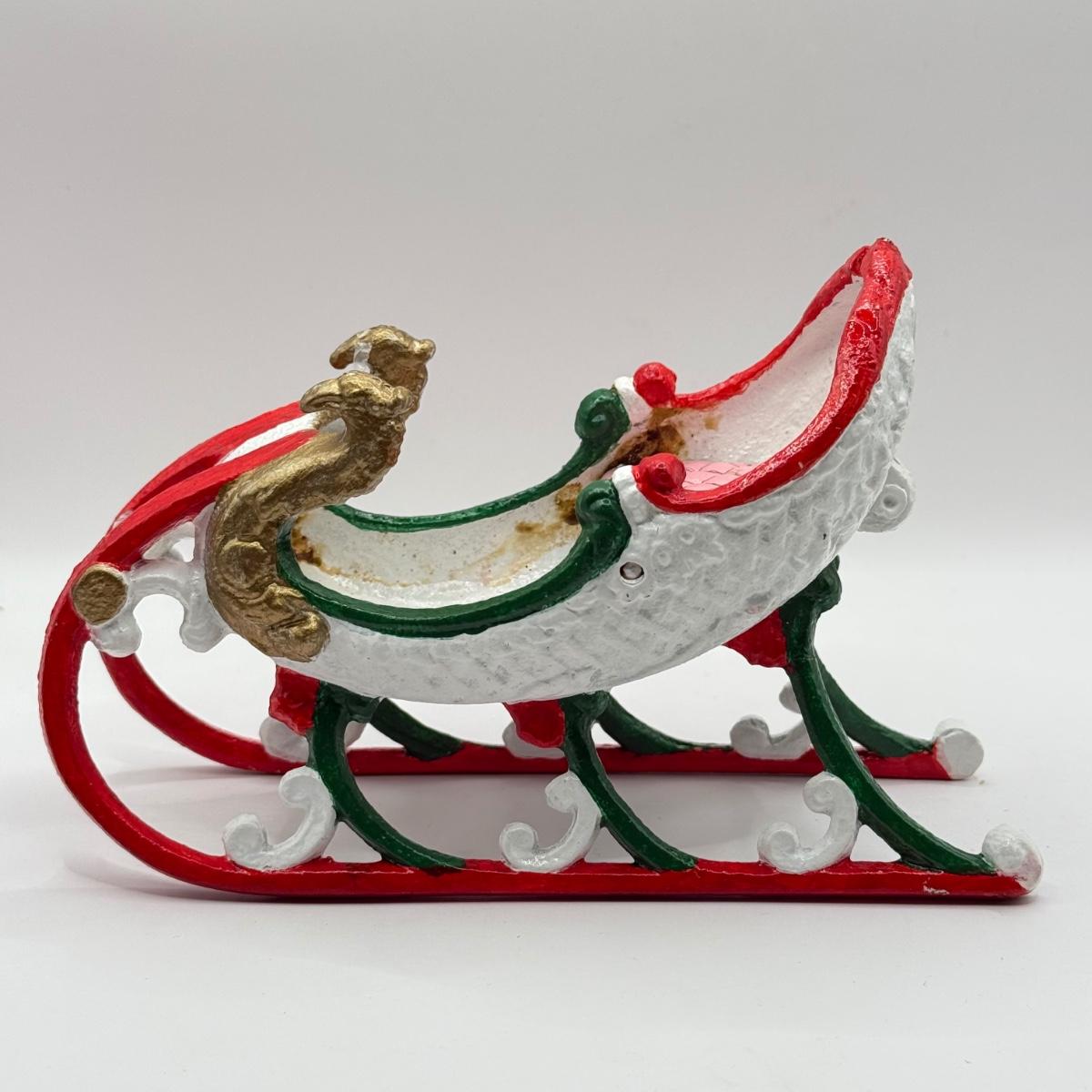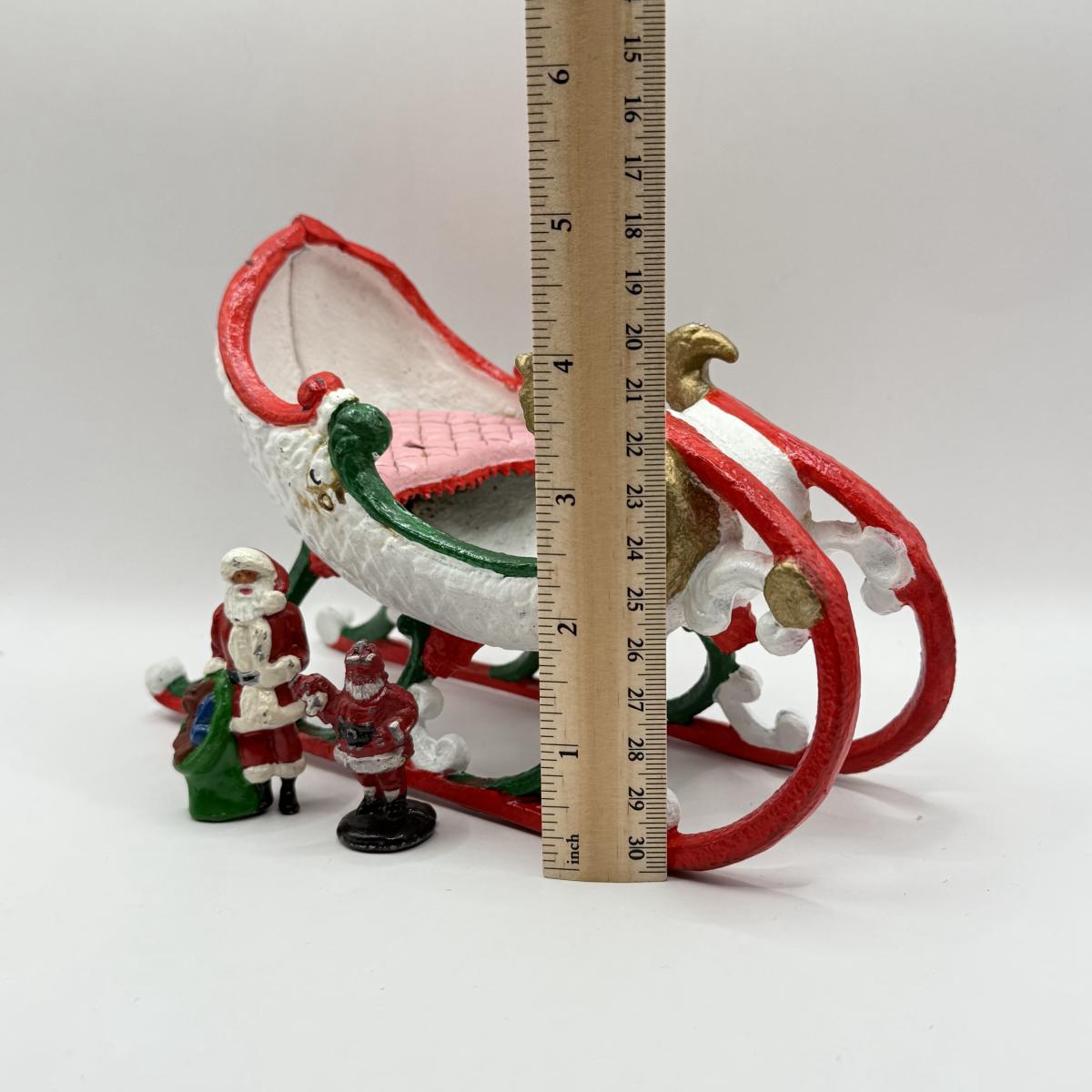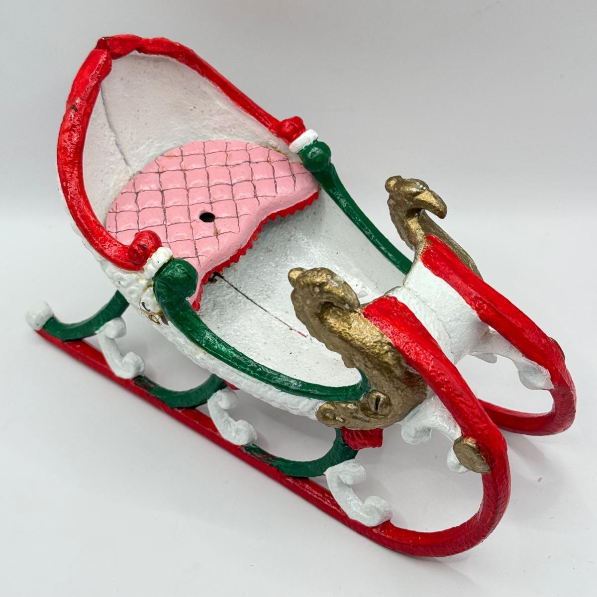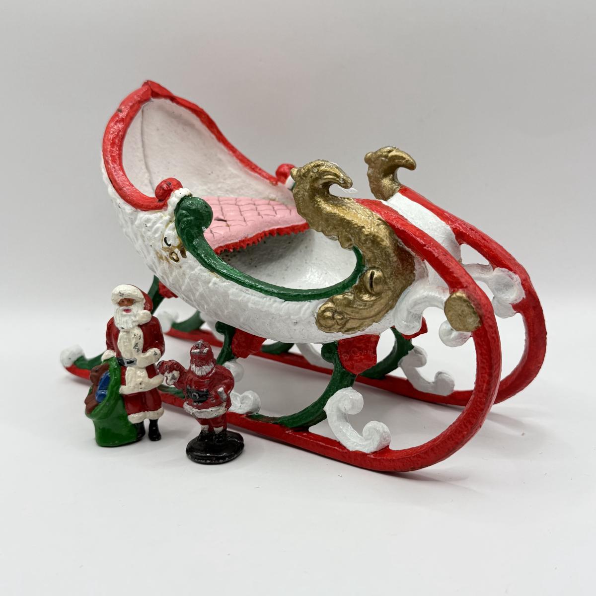 LOT 190L: Vintage Cast Iron Painted Sled & Miniature Metal Santas