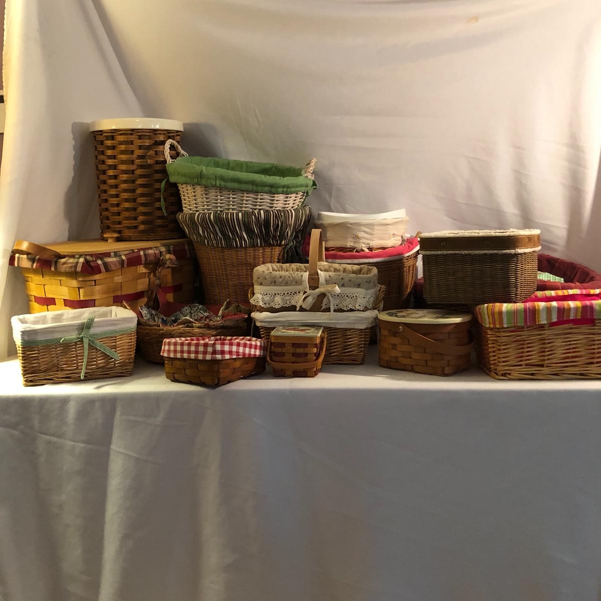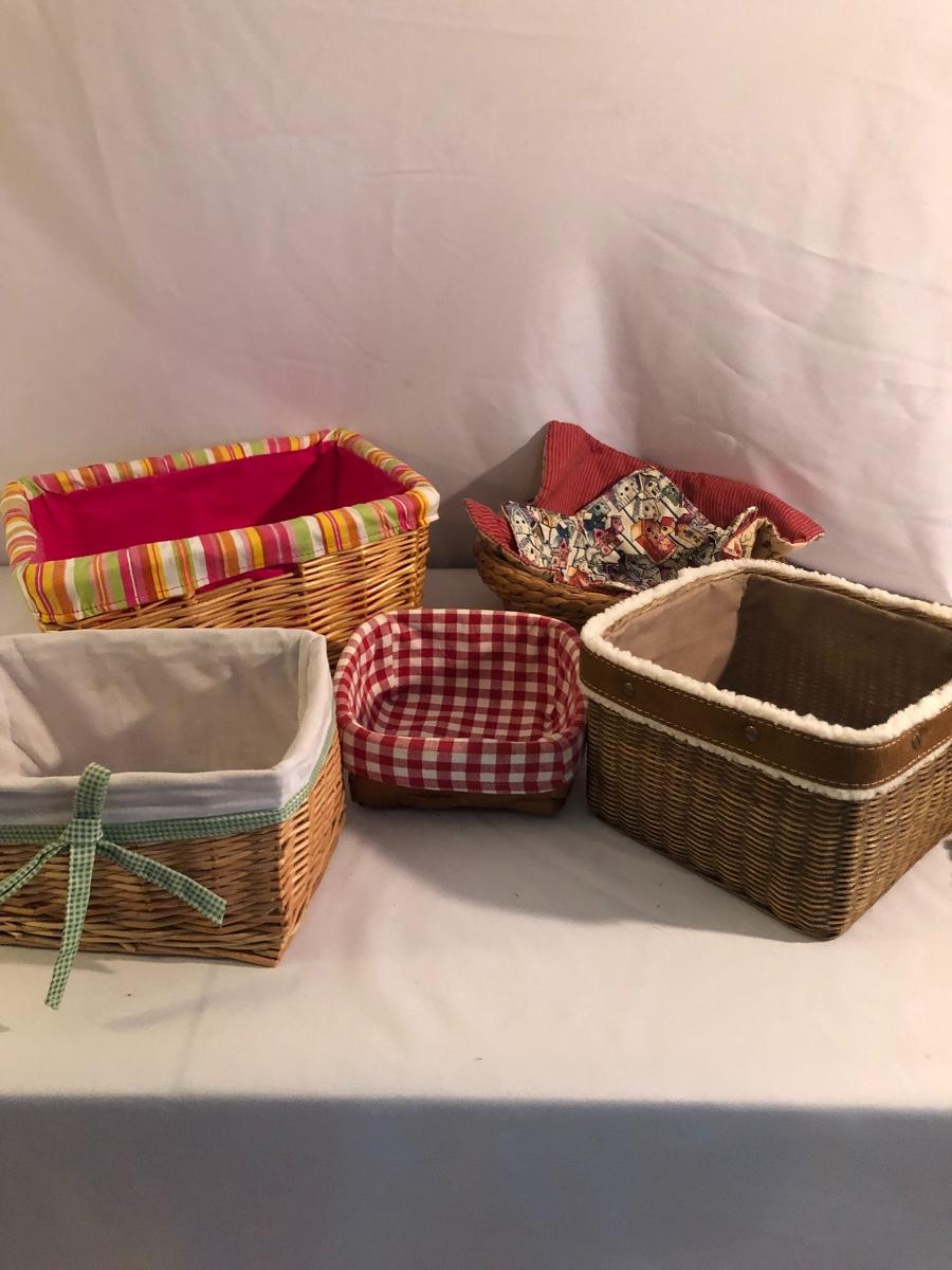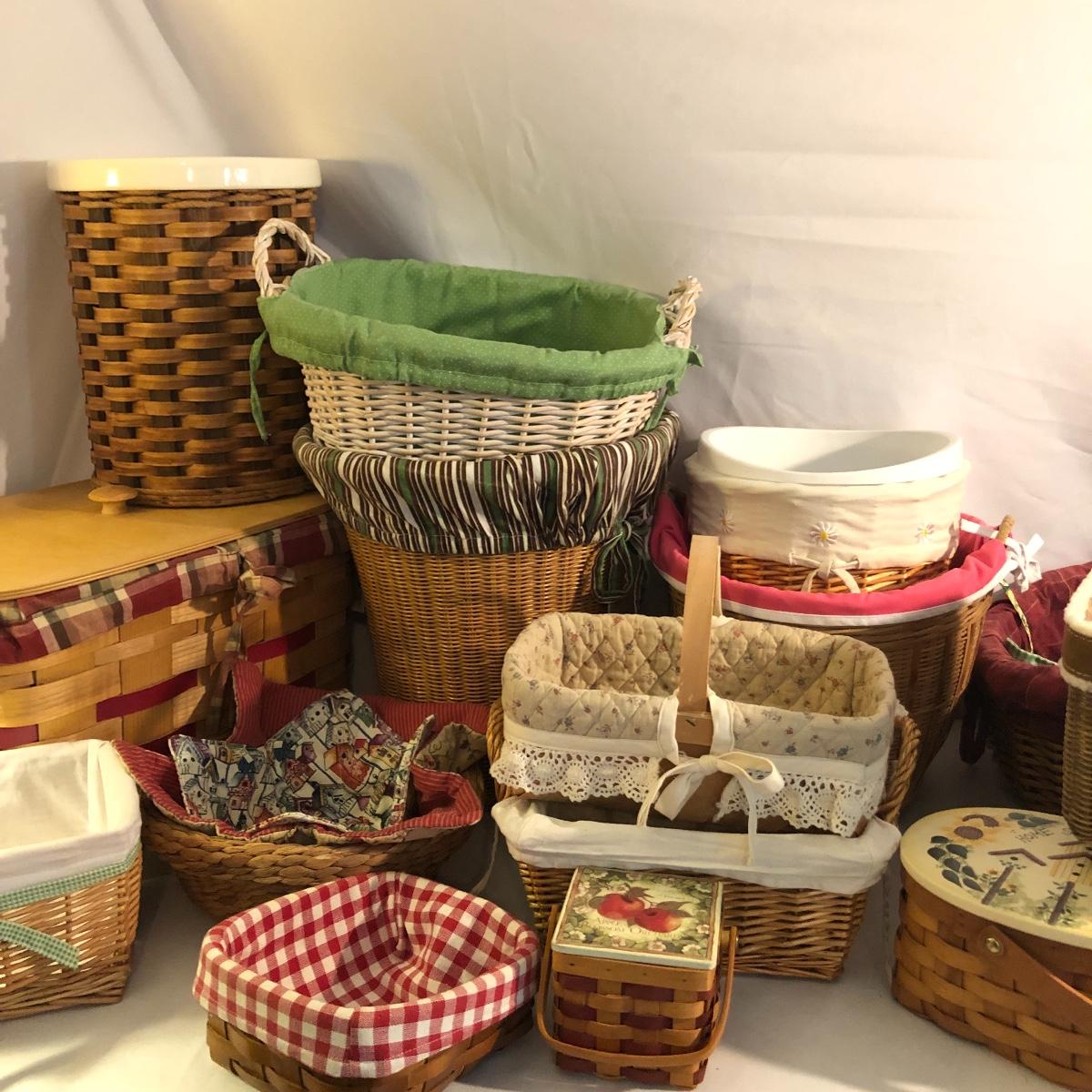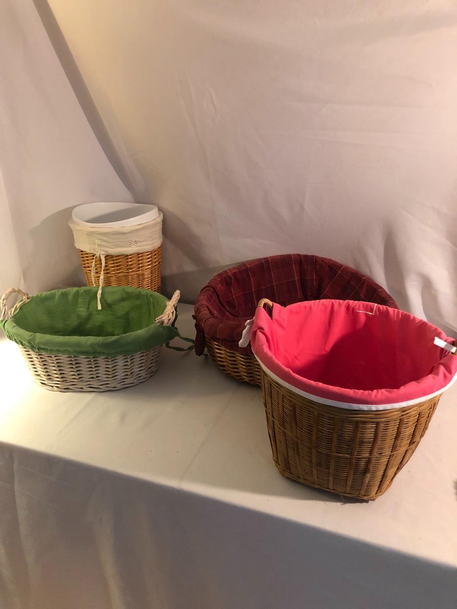 Over fifteen baskets altogether in this lot that are primarily lined yet there are a number of lidded baskets too. There are also a handful of extra fabric liners. Shapes and sizes vary and include waste baskets, a picnic basket and much more. The last image shows the largest and smallest which measure 11” x 17” x 11” and 4” x 40 x 4” respectively.