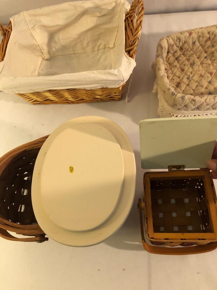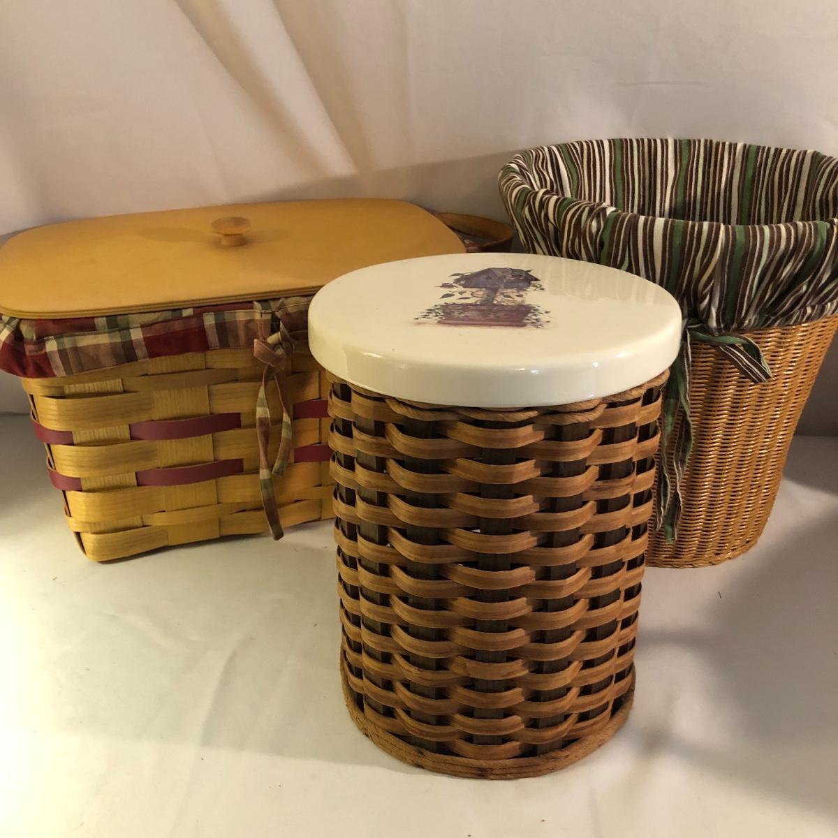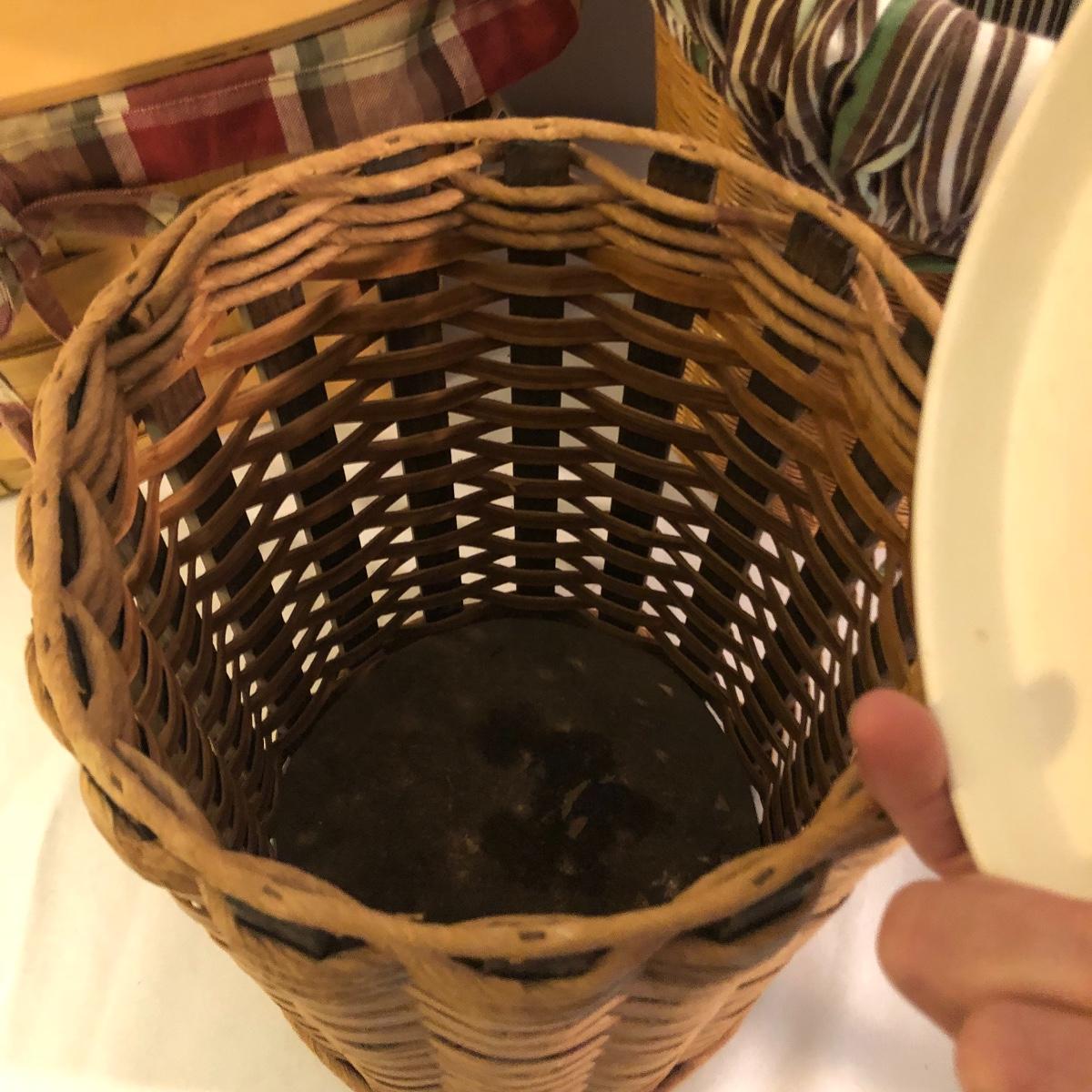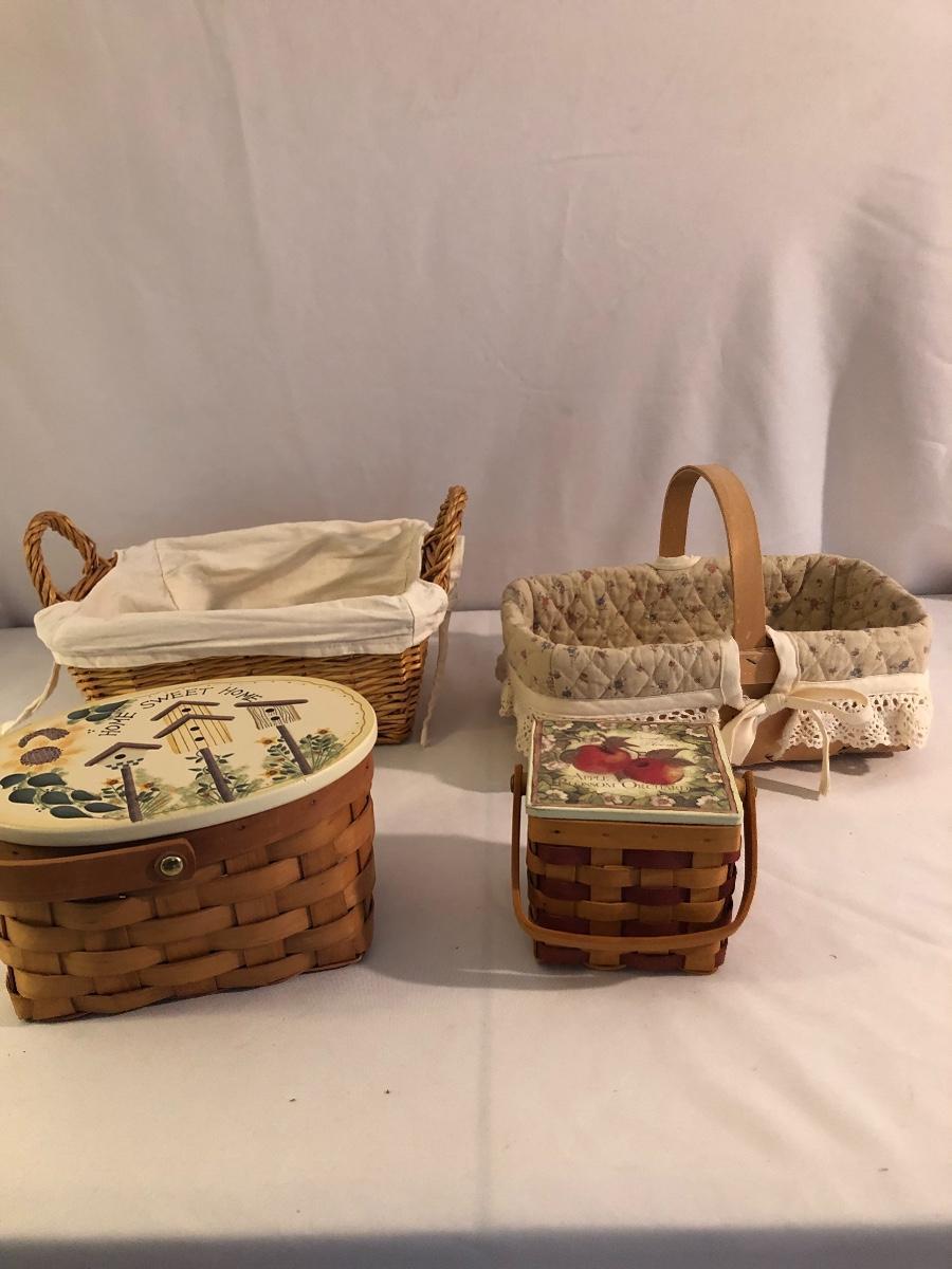 Over fifteen baskets altogether in this lot that are primarily lined yet there are a number of lidded baskets too. There are also a handful of extra fabric liners. Shapes and sizes vary and include waste baskets, a picnic basket and much more. The last image shows the largest and smallest which measure 11” x 17” x 11” and 4” x 40 x 4” respectively.