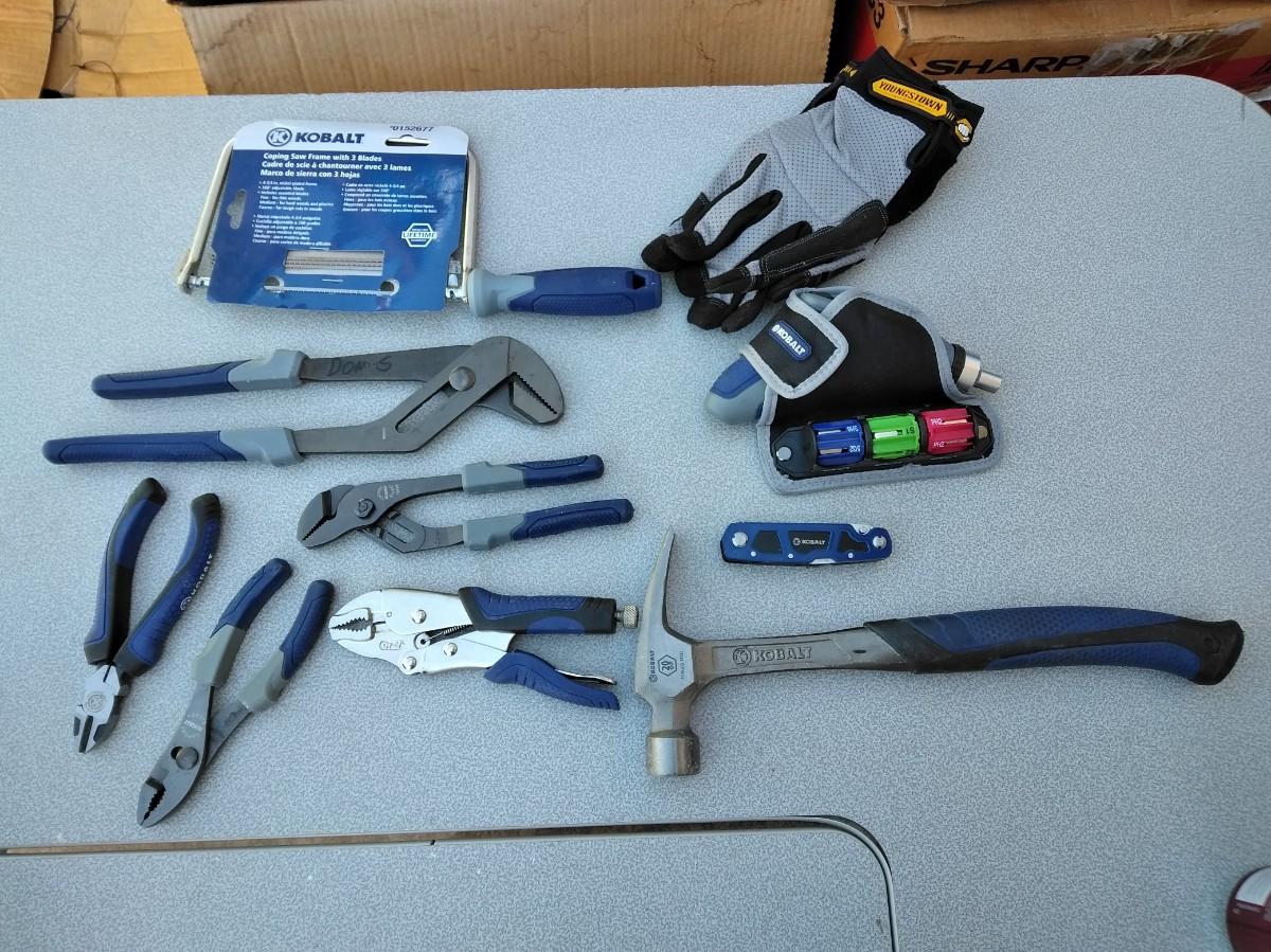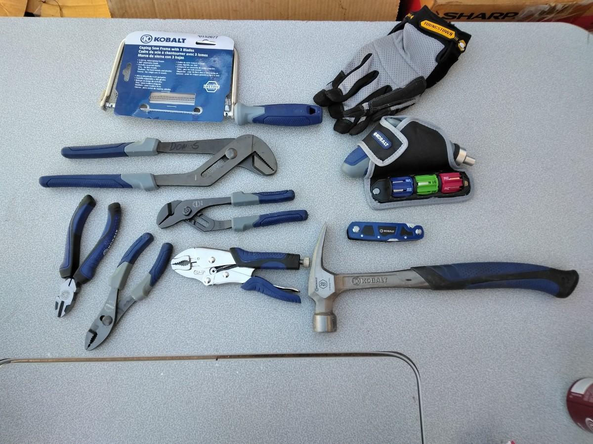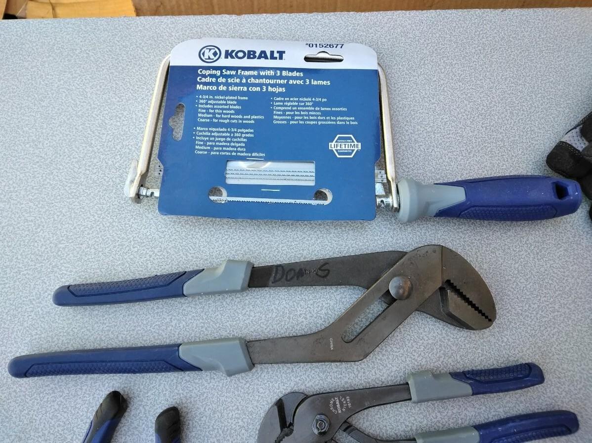 COPING SAW WITH BLADES, WRENCHES, VISE-GRIP, CHANNEL LOCKS, HAMMER, WORK GLOVES, RECHARGEABLE SCREWDRIVER WITH BITS AND HOLSTER