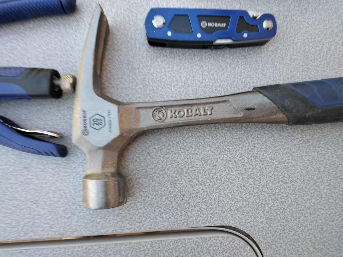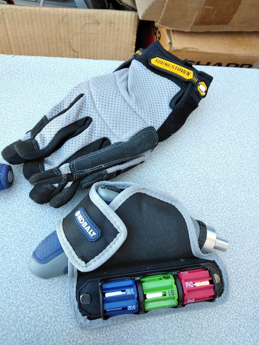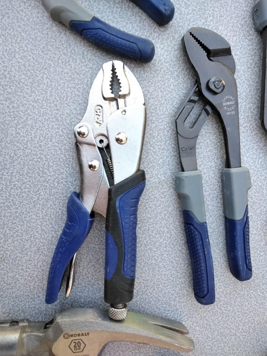 COPING SAW WITH BLADES, WRENCHES, VISE-GRIP, CHANNEL LOCKS, HAMMER, WORK GLOVES, RECHARGEABLE SCREWDRIVER WITH BITS AND HOLSTER