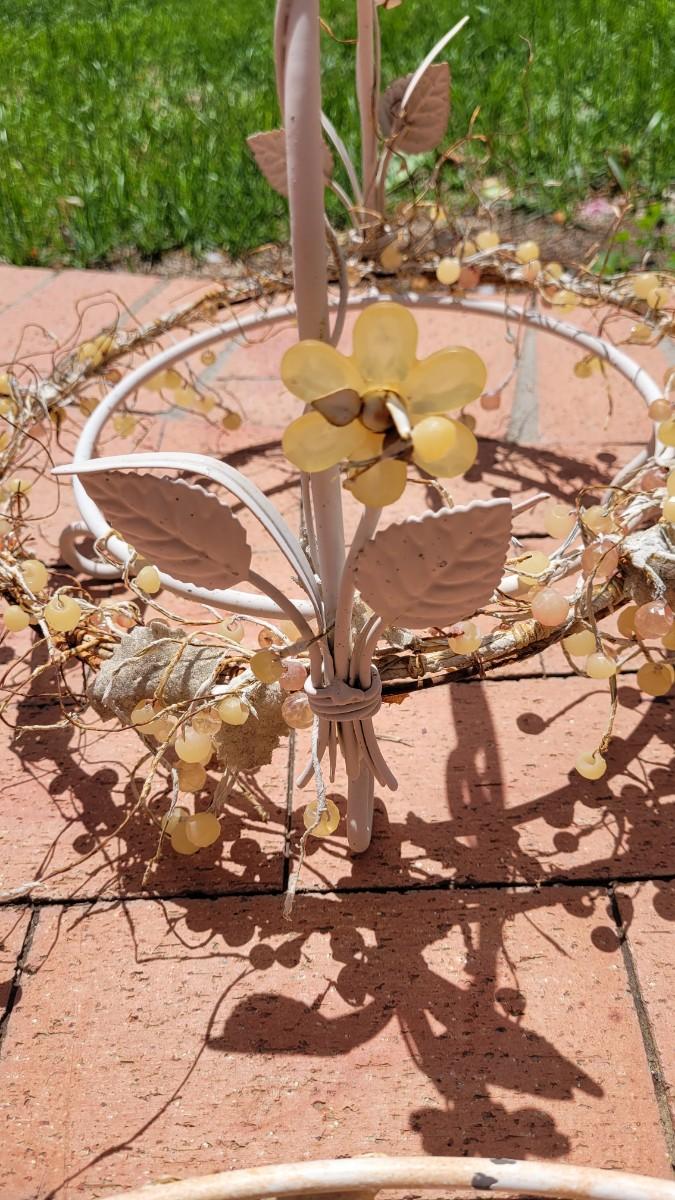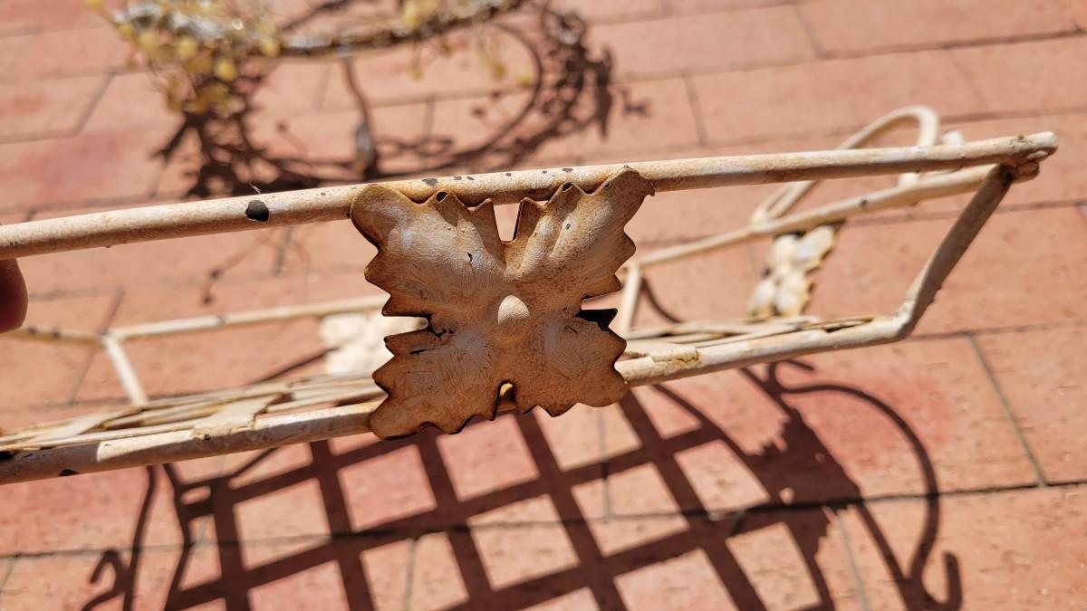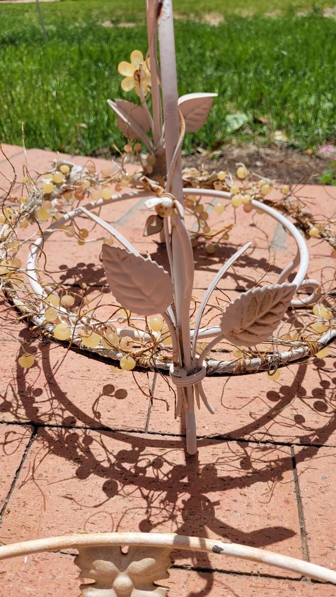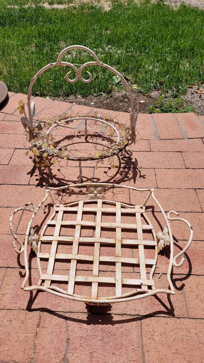 Plant stand is missing flower petal beads on one side. Both pieces are made from sturdy metal.