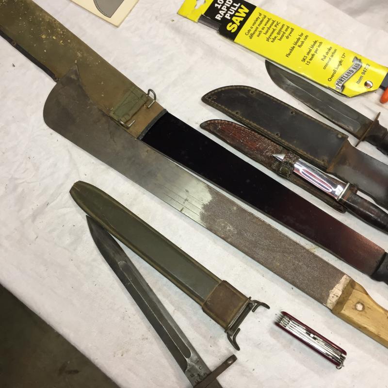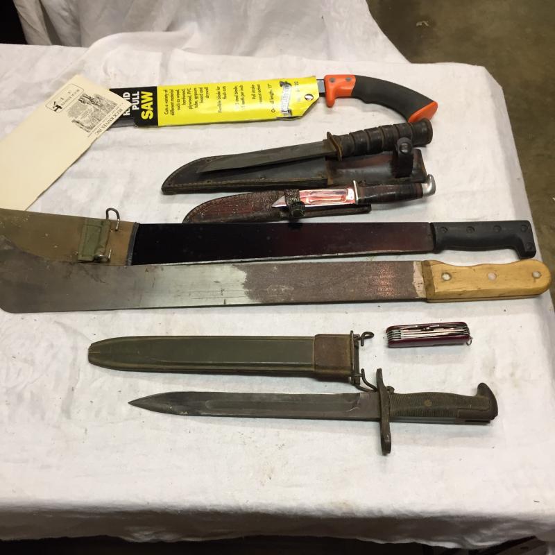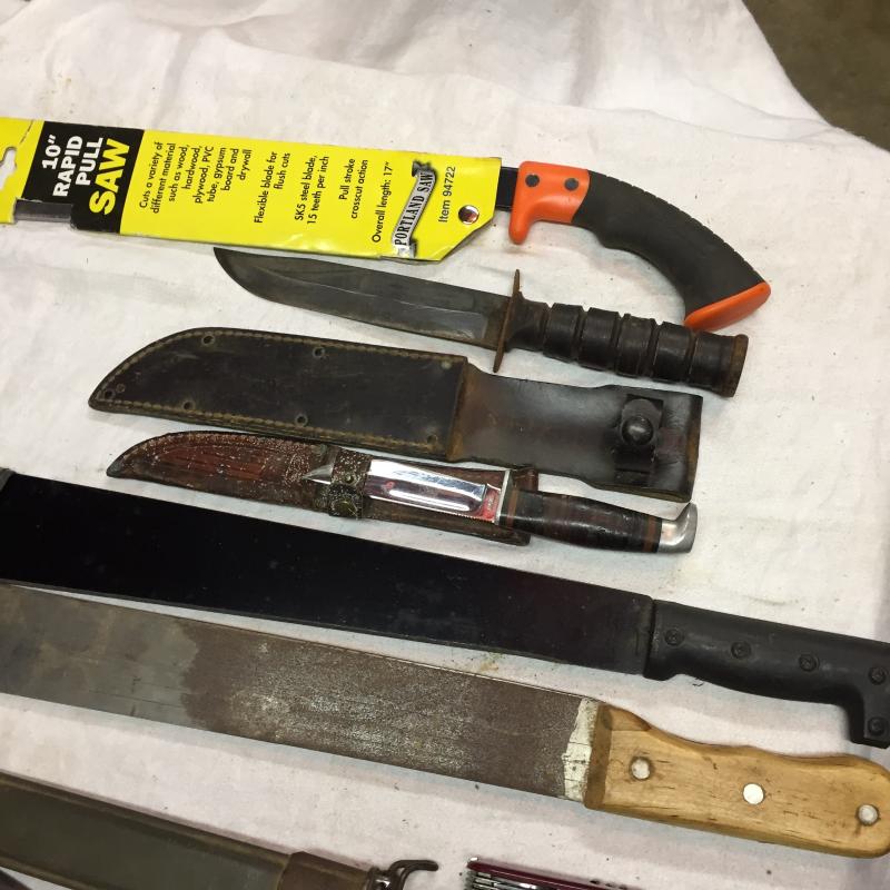 Assortment of Knives and small saw. Longerst one is 25”, two have leather cases and leather or wood detailed handles. Saw is a 10” Portland Saw.