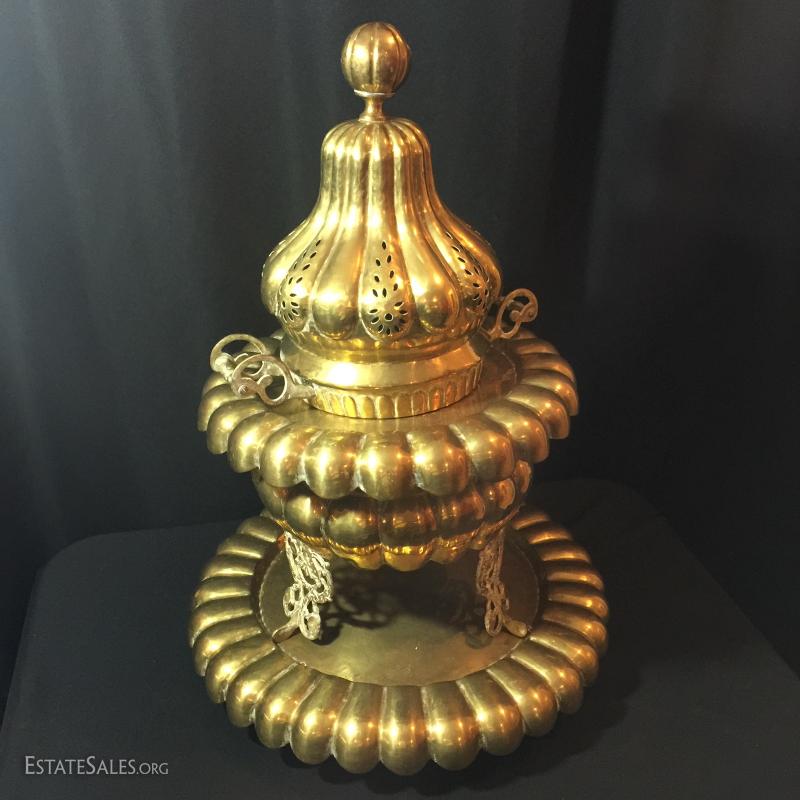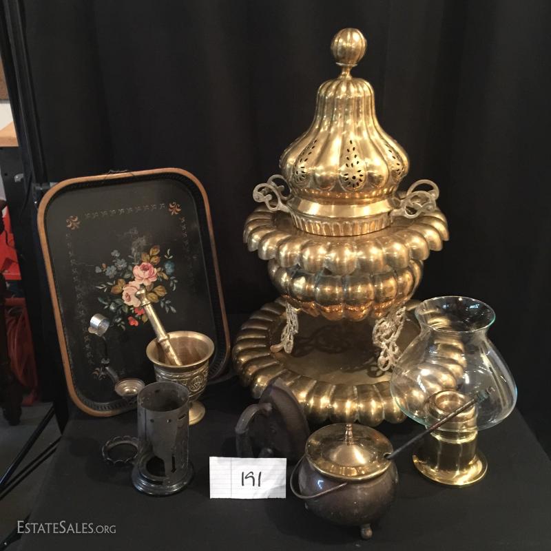 Brass/Copper Brazier Fire Pit/Lighter, toile tray, morter & pestal, brass candle holder with glass shade.