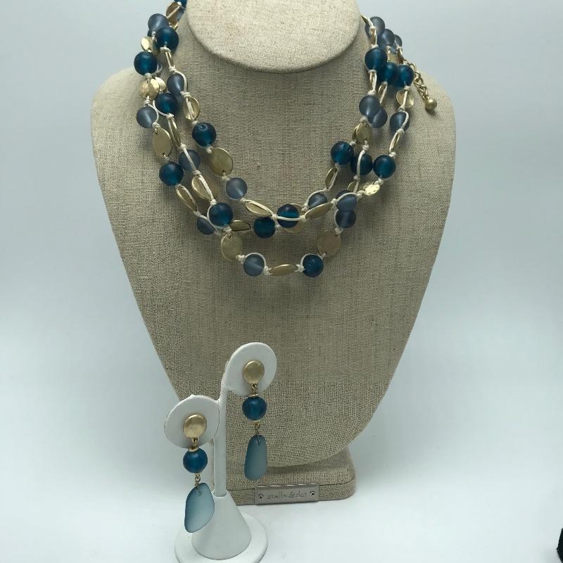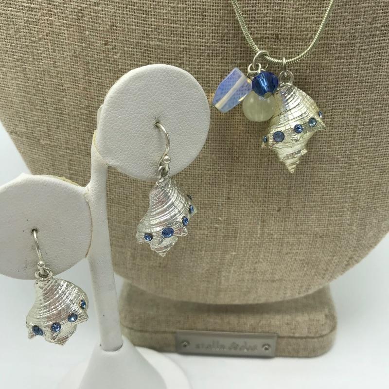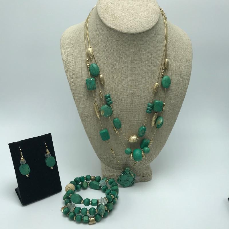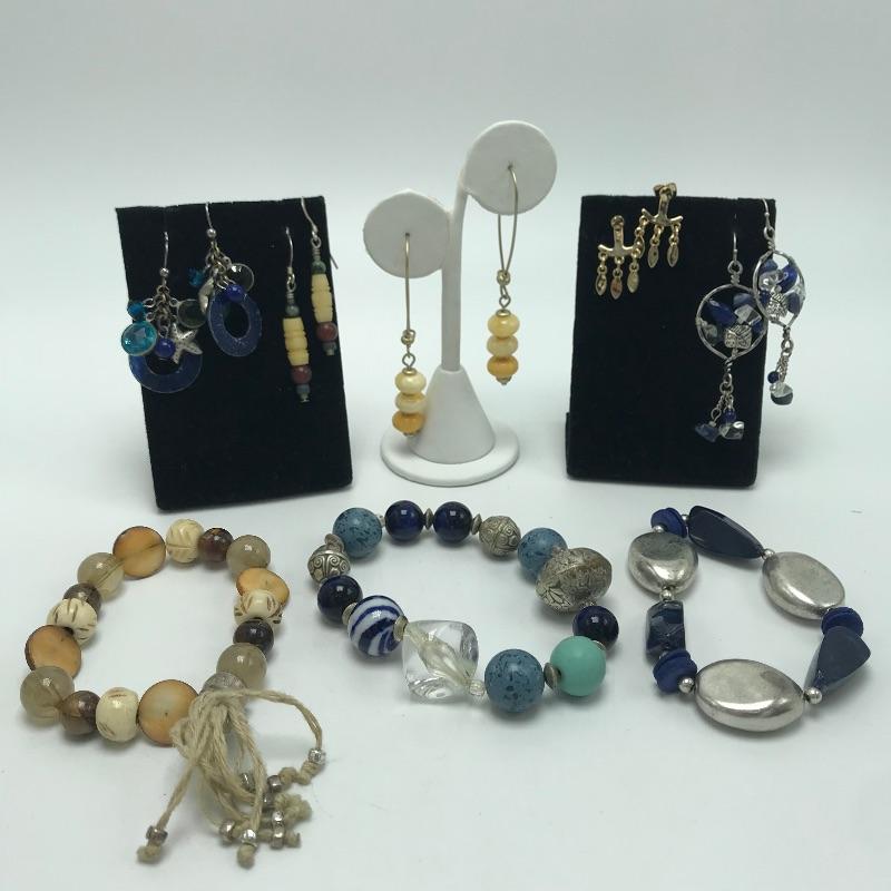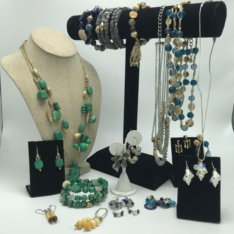 Nice collection of casual and upscale sets, with more earrings, necklaces and bracelets. Find beach and sea glass style mixed with elegant malachite, silver and gold colors too! A few pieces are marked Chico’s, conch shell necklace is marked Clearwater Creek, most have no known markings.