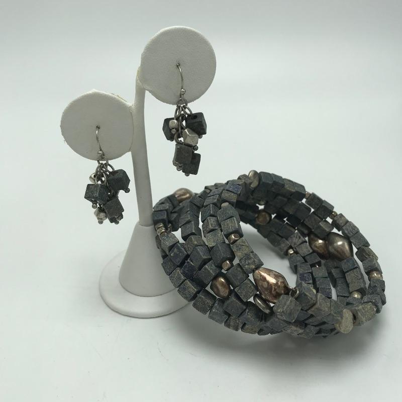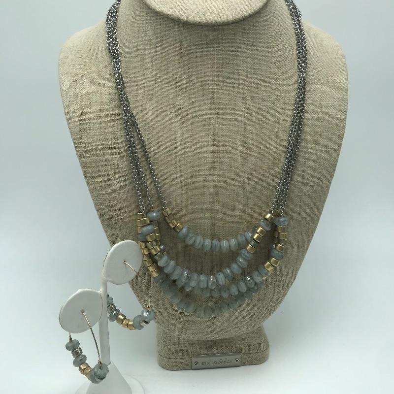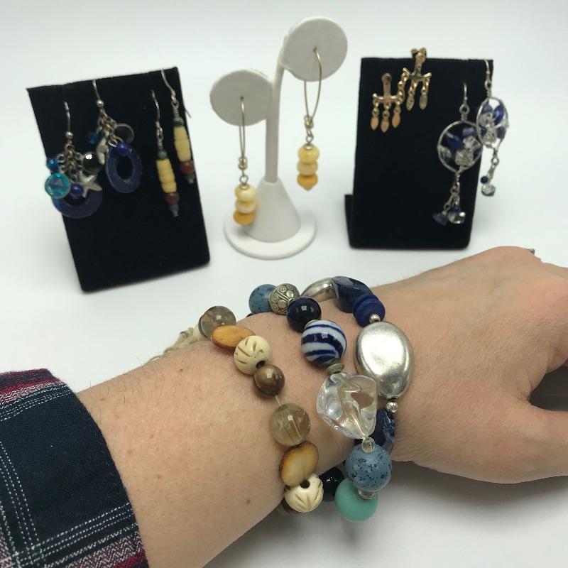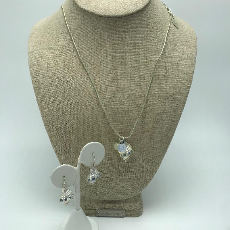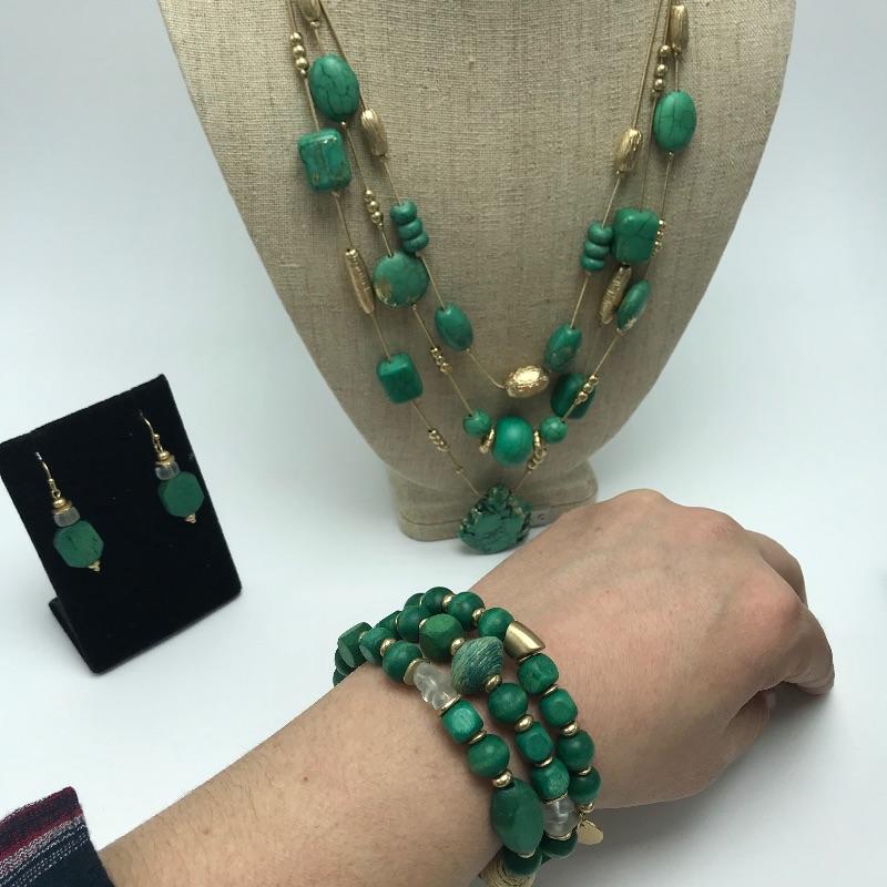Nice collection of casual and upscale sets, with more earrings, necklaces and bracelets. Find beach and sea glass style mixed with elegant malachite, silver and gold colors too! A few pieces are marked Chico’s, conch shell necklace is marked Clearwater Creek, most have no known markings.
