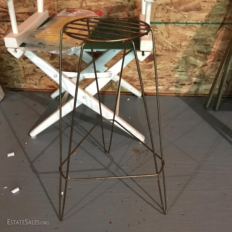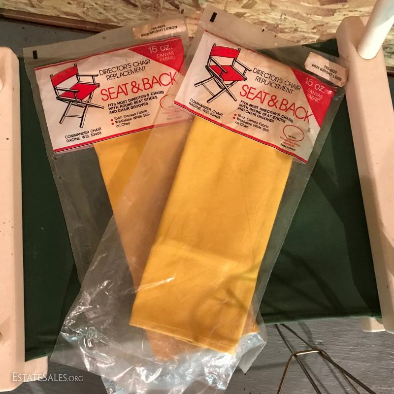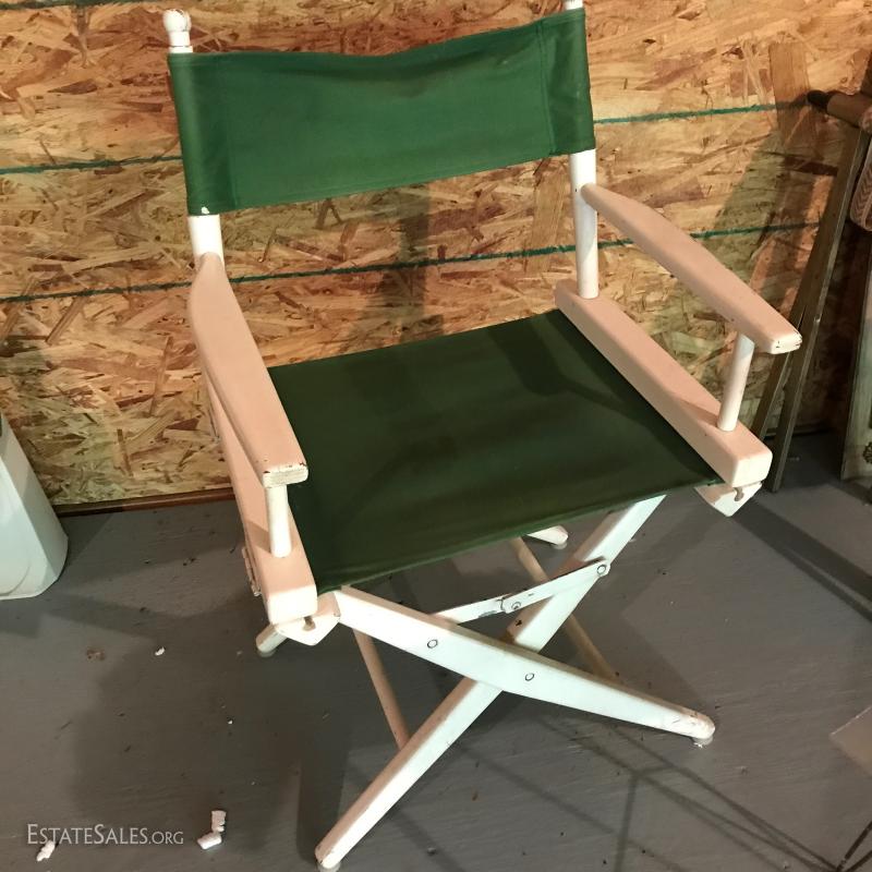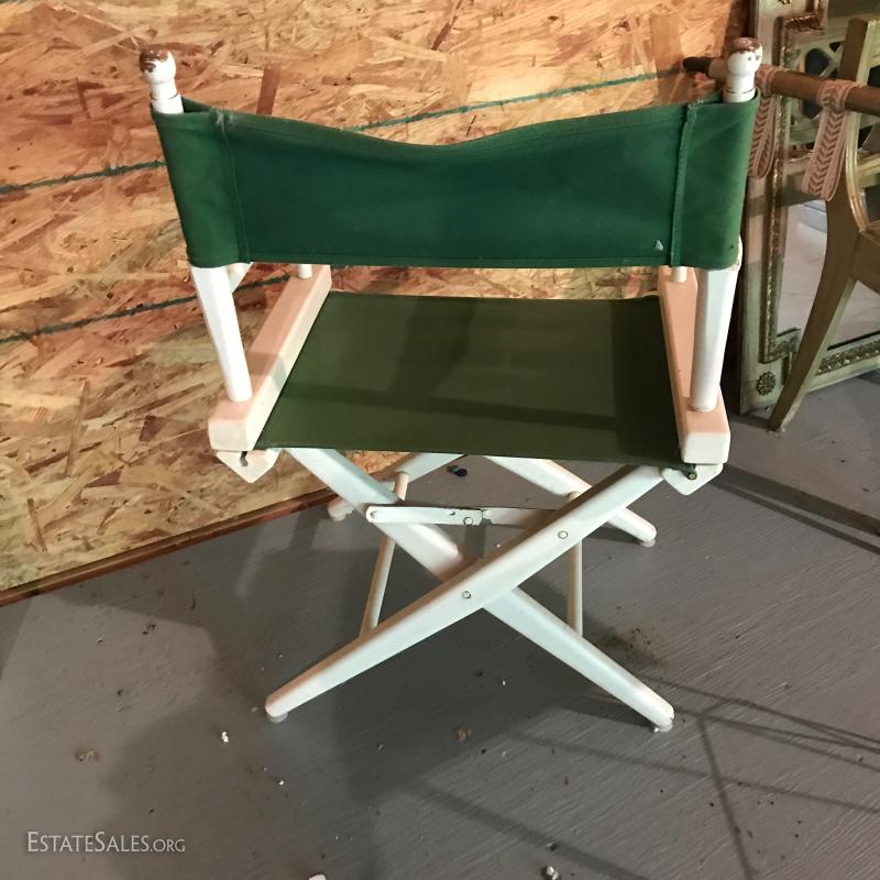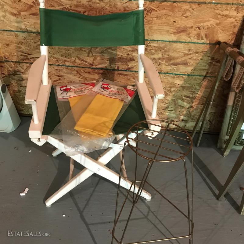 White director chair with green canvas seat back and two replacement covers in lemon color. Gold colored metal plant stand stands 24" tall. This lot is available for local pick up in Flat Rock, NC only.