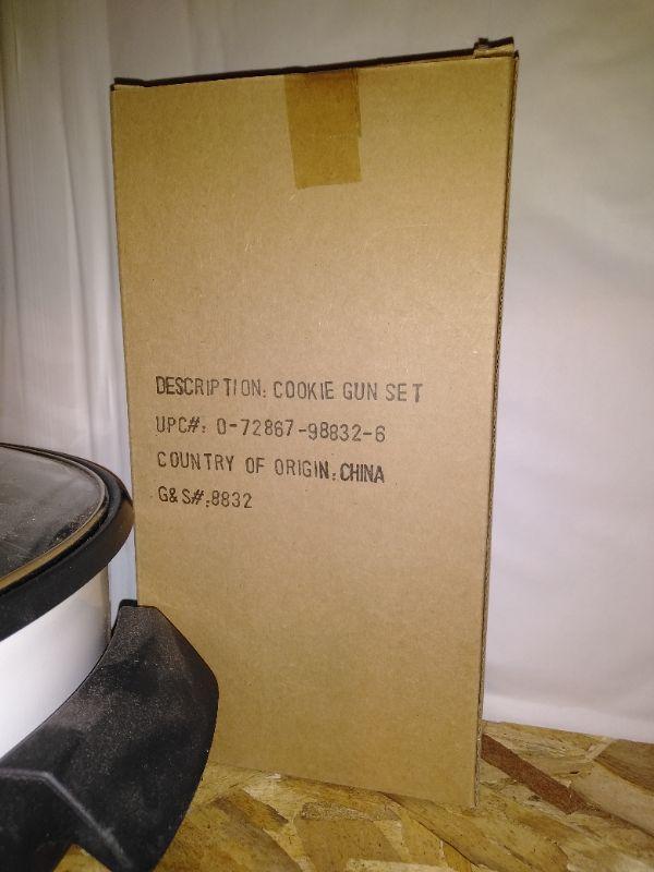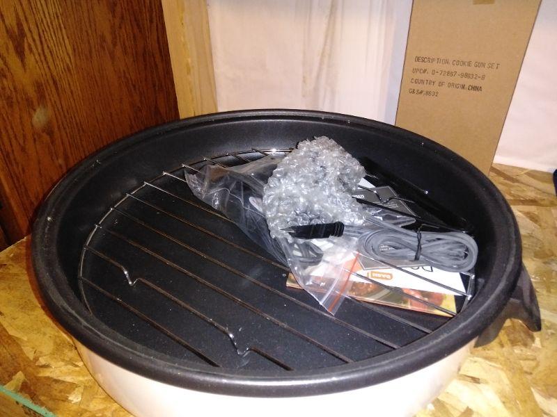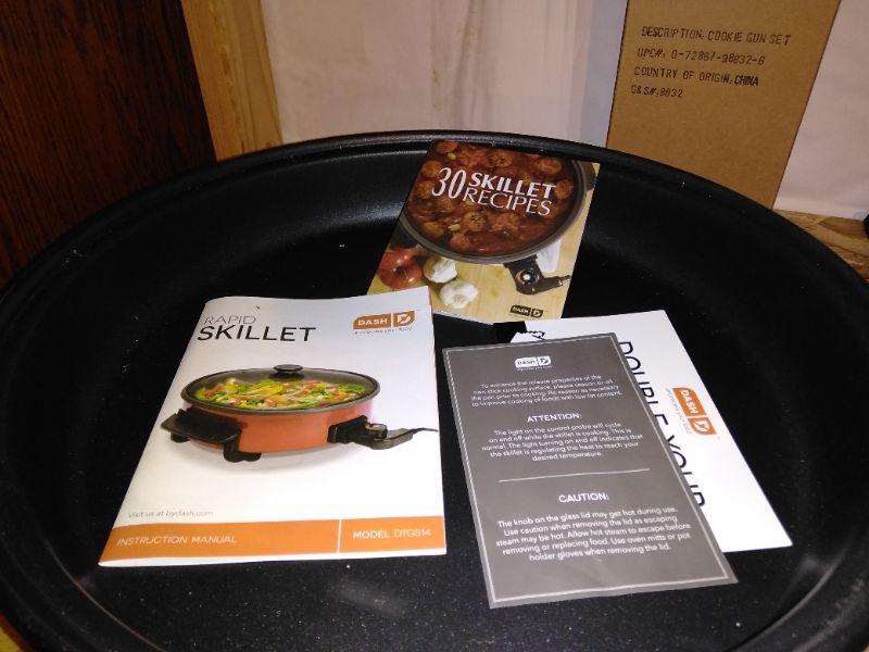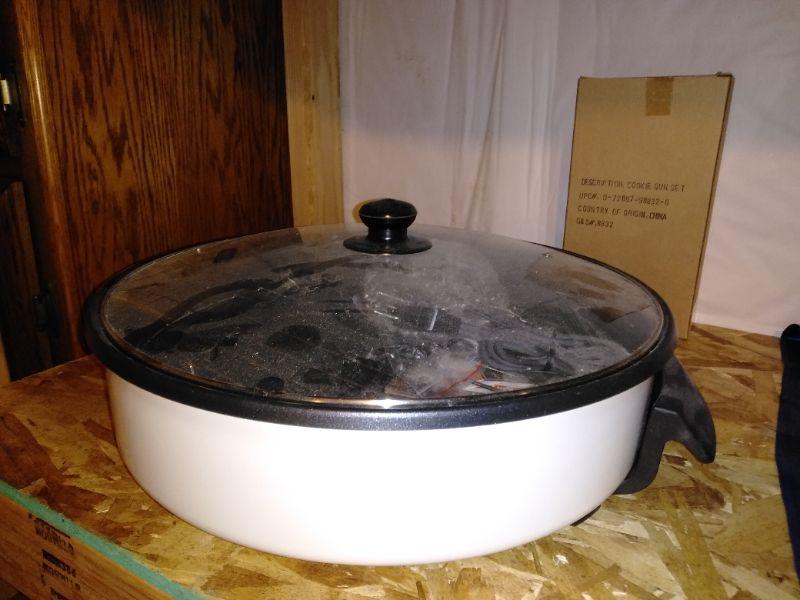 ELECTRIC SKILLET WITH CORD, AND MANUAL, HERITAGE GLASS PLATTER WITH HANDLES, COOKIE GUN SET, AND A CWC MADE IN ITALY SERVING DISH.