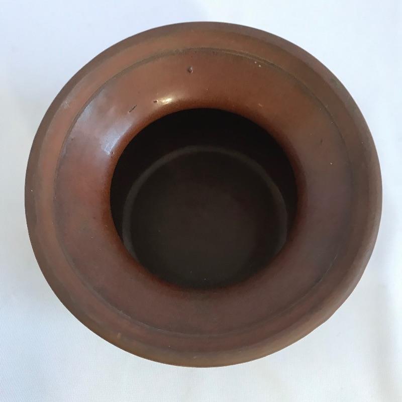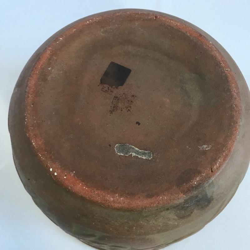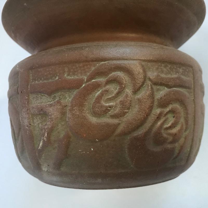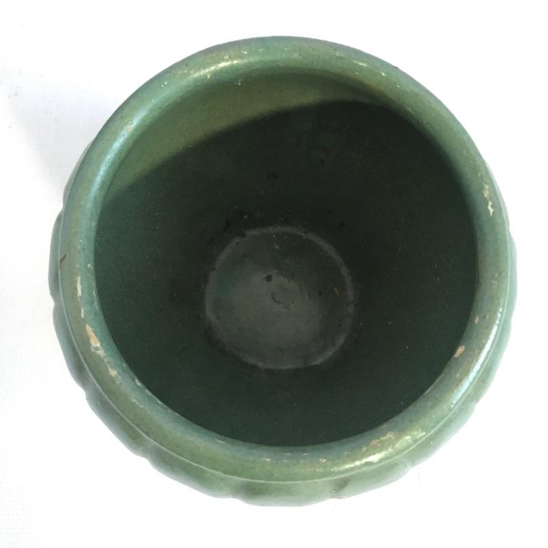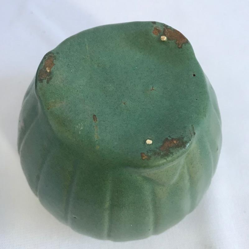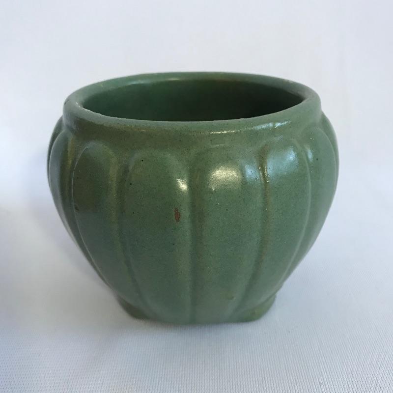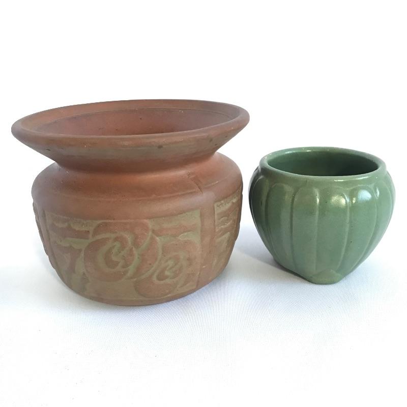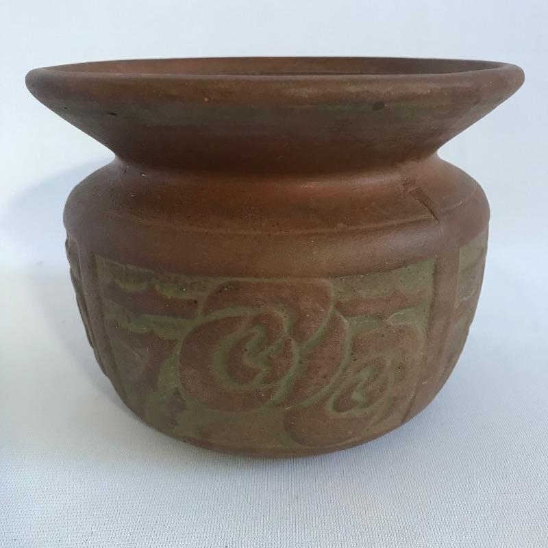 Lovely rusted orange pottery by Peters & Reed with windows of roses surrounding the 6.5”d x 5” pot. Paired within the company family tree is a jade green colored pottery measuring 3.25”d x 4.25”. Neither piece has a known mark. The estate executor, an Arts & Crafts collector, labels piece as Peters & Reed and Zane Pottery. This information was not verified by Sterling Transitions.