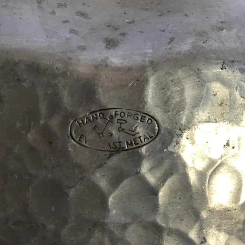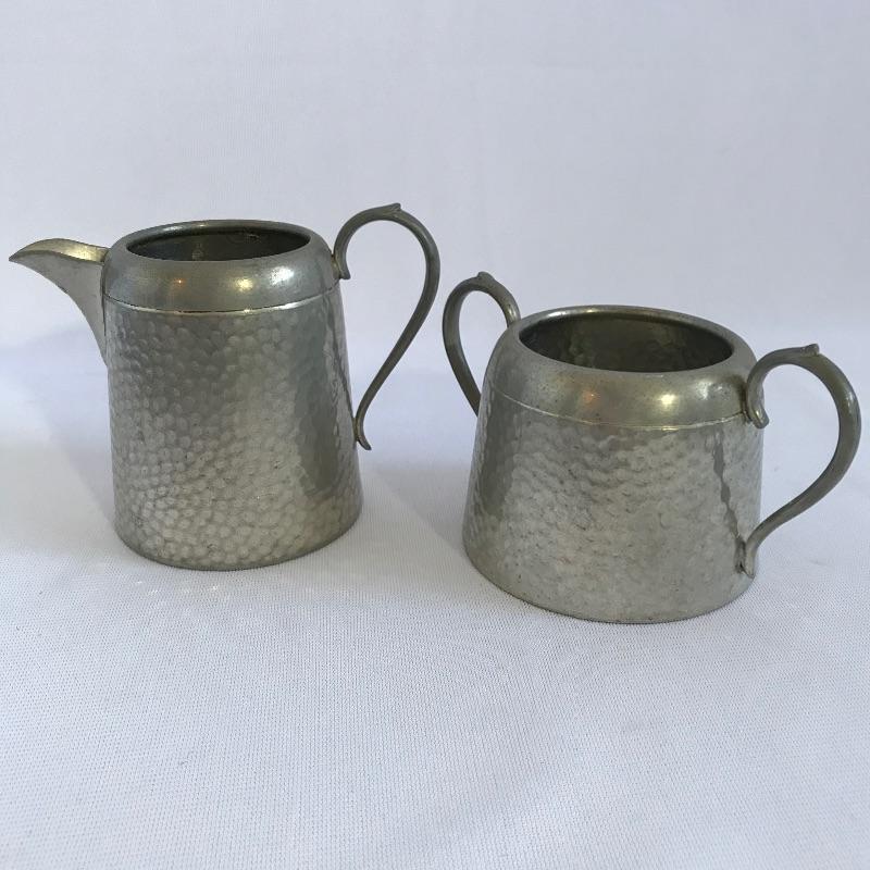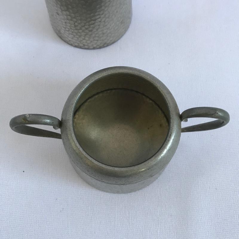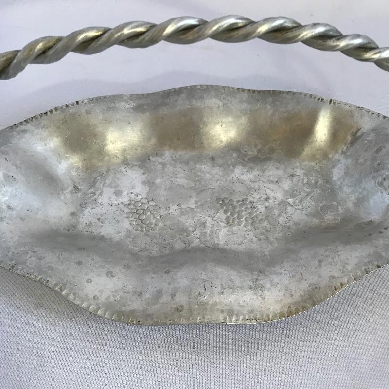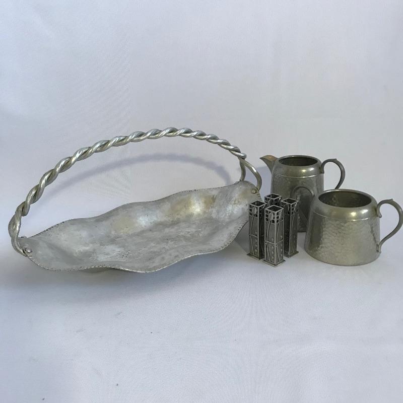 Sweet little vintage collection featuring four 2.5” Art Deco A E W English bud vases. A charming hammered sugar and cream set marked Argent Pewter English Made 1616 and finally an Everlast Metal Hand forged basket with hammered grape designs. Basket is approximately 12” long.