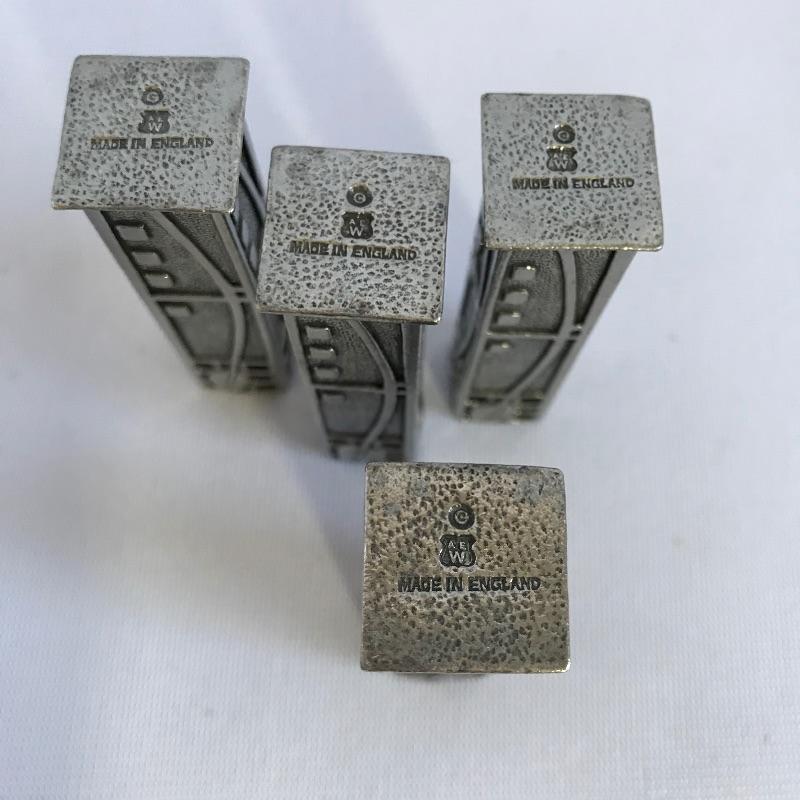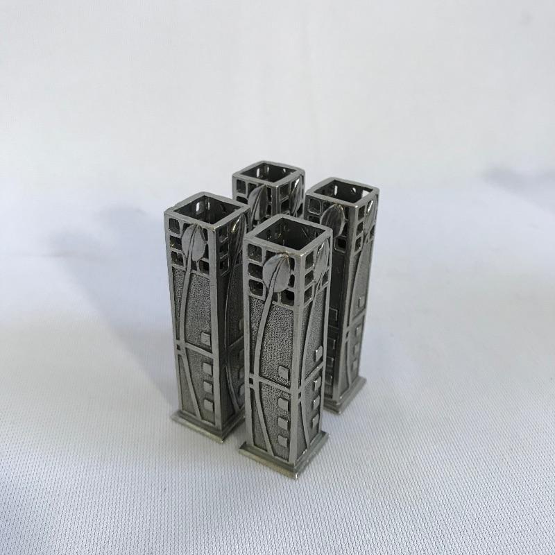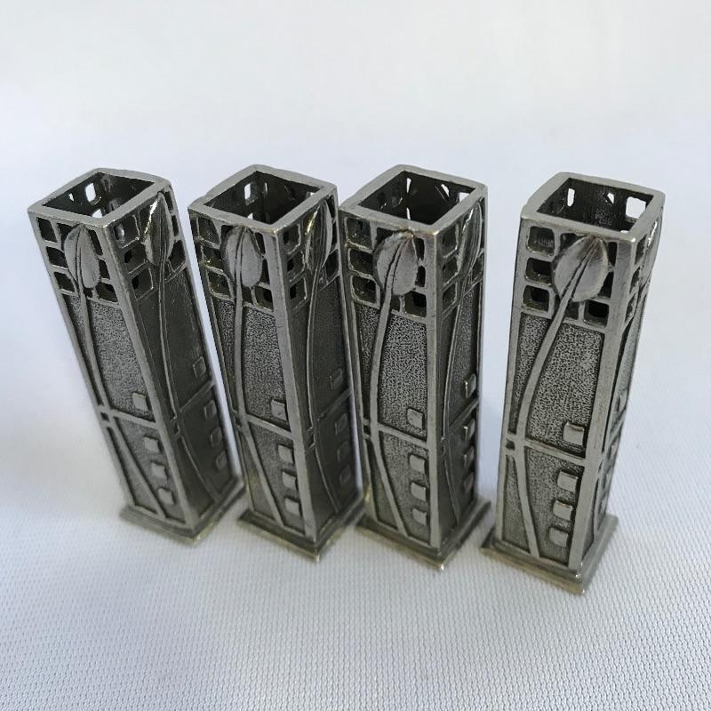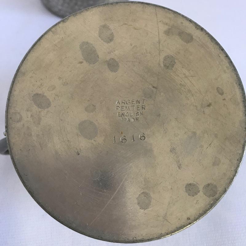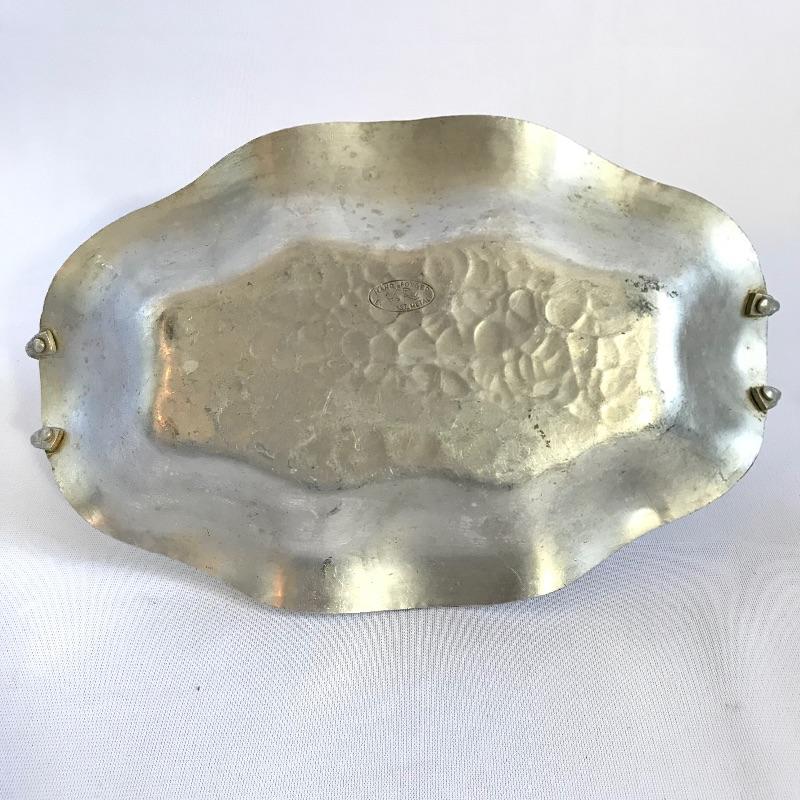 Sweet little vintage collection featuring four 2.5” Art Deco A E W English bud vases. A charming hammered sugar and cream set marked Argent Pewter English Made 1616 and finally an Everlast Metal Hand forged basket with hammered grape designs. Basket is approximately 12” long.