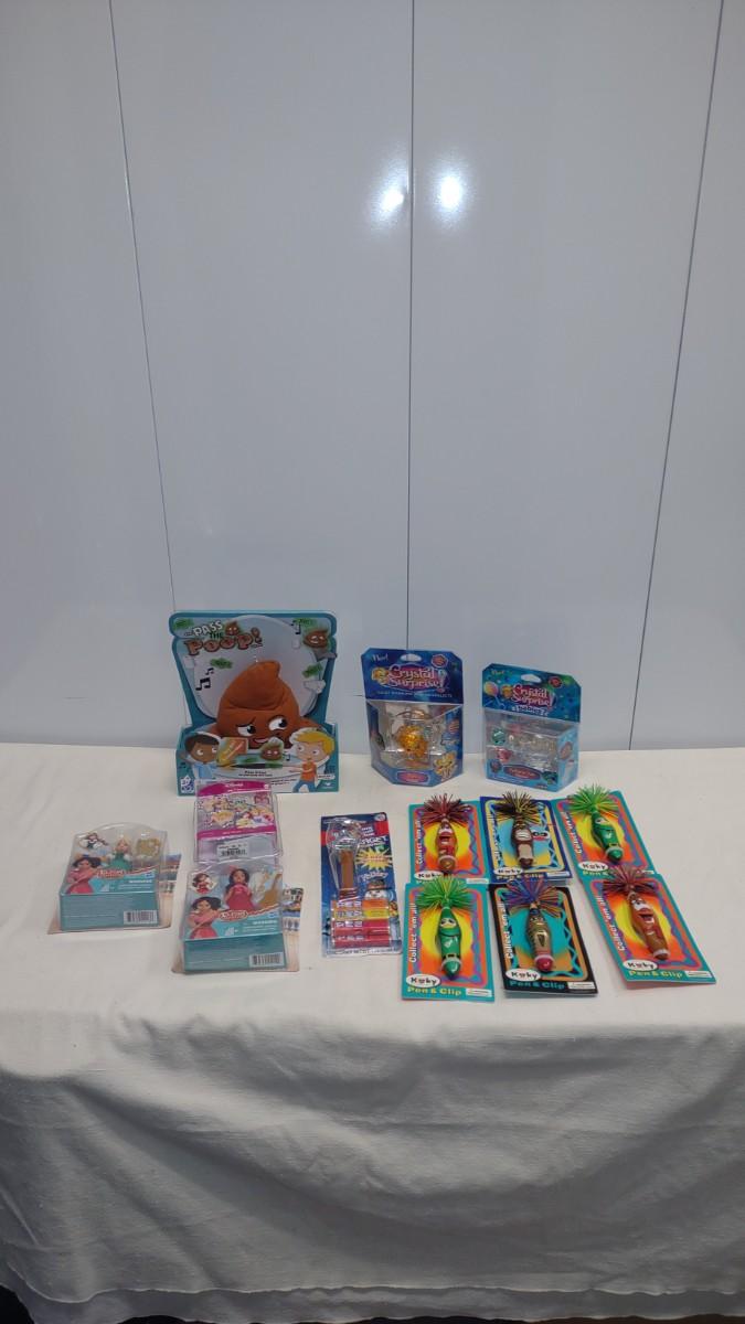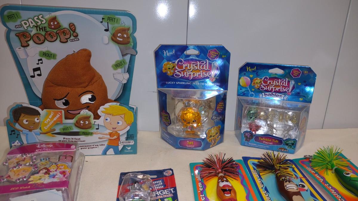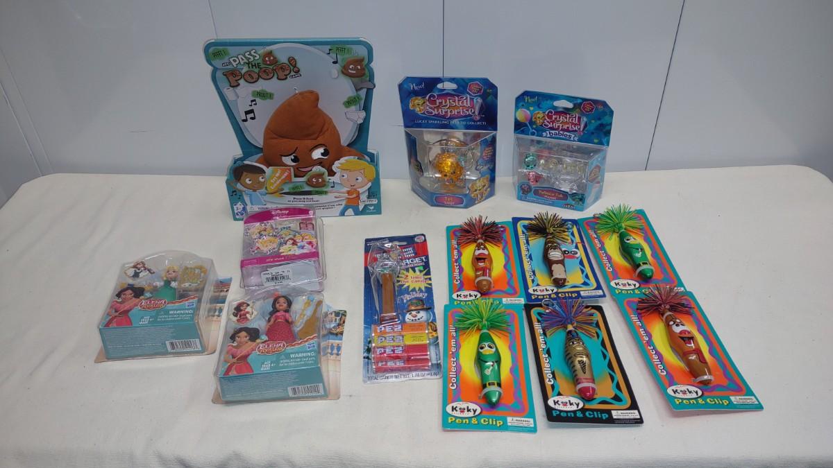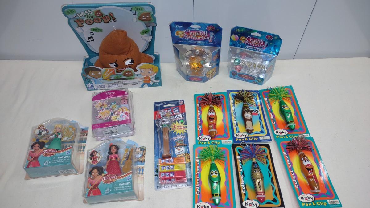 PERFECT STOCKING STUFFERS FOR THE KIDS. A SINGING POOP EMOJI, DIFFERENT PEN AND CLIP, PRINCESS FIGURES AND MORE