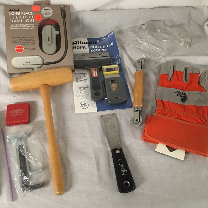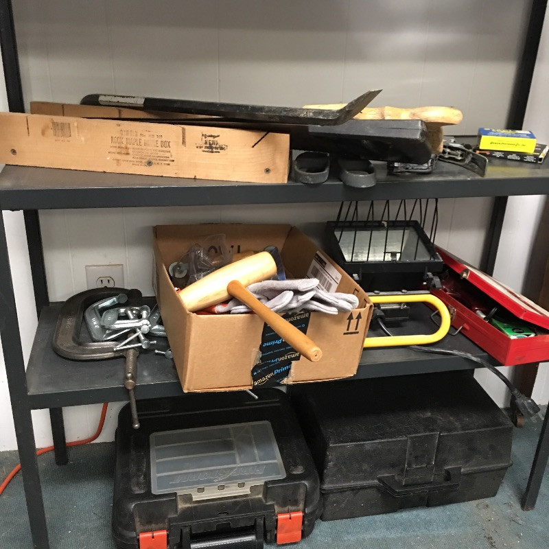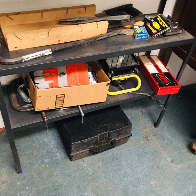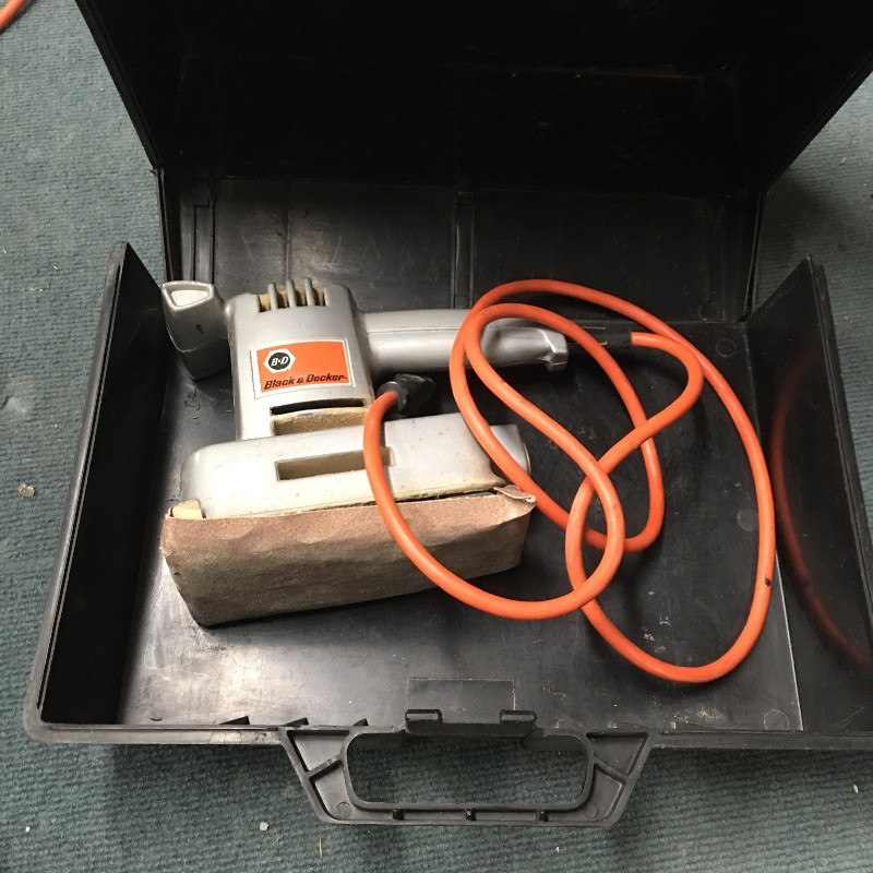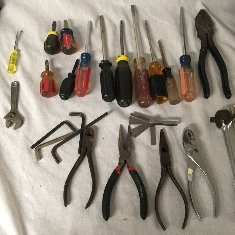 Hand tools include Black and Decker Sander, gloves, utility light, soldering gun, crowbar, pliers, screwdrivers, c clamps and more.
