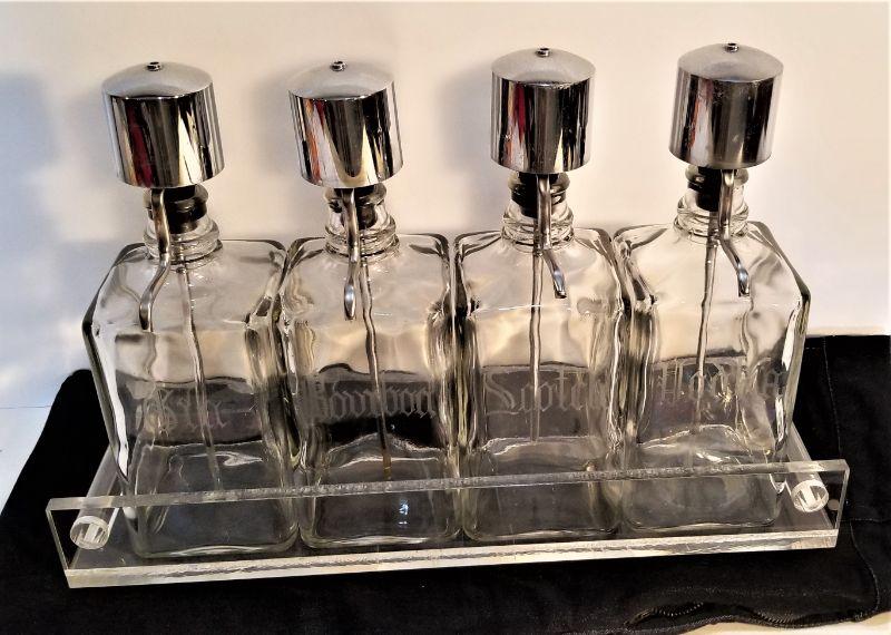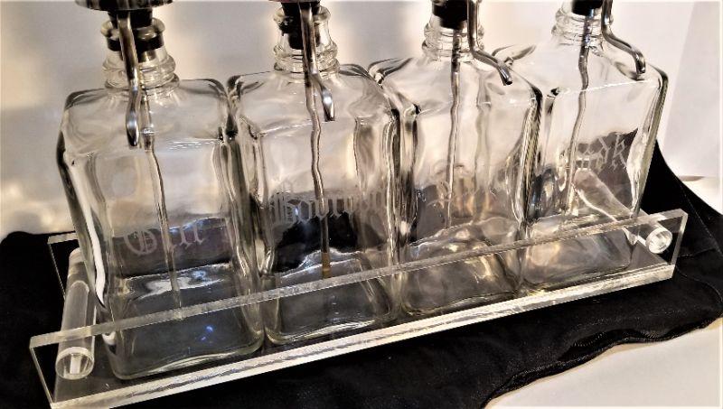 Will look great on your bar - Tantalus with four bottles - acid etched Gin, Bourbon, Scotch & Vodka. Matching acrylic tray. 17" wide, 11" tall.