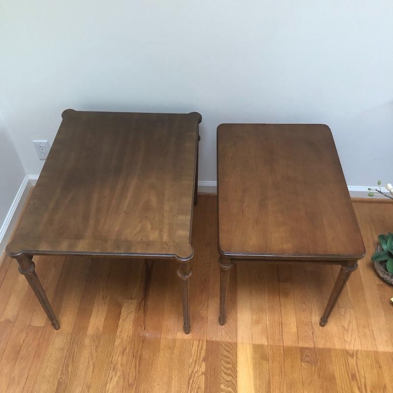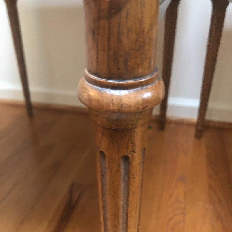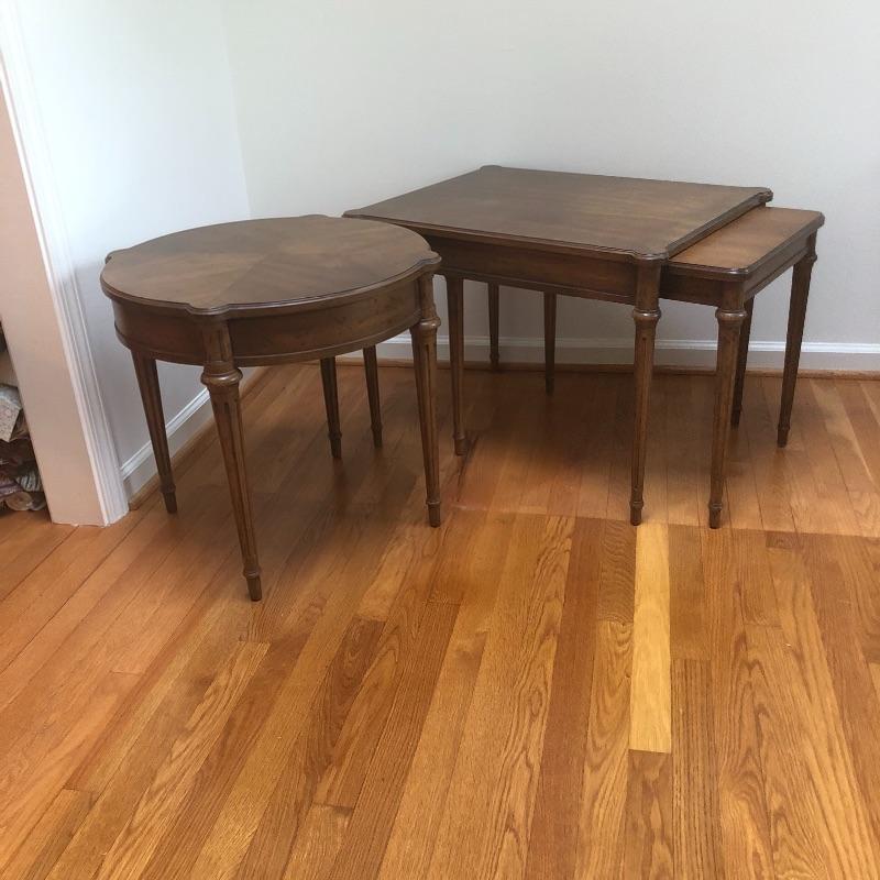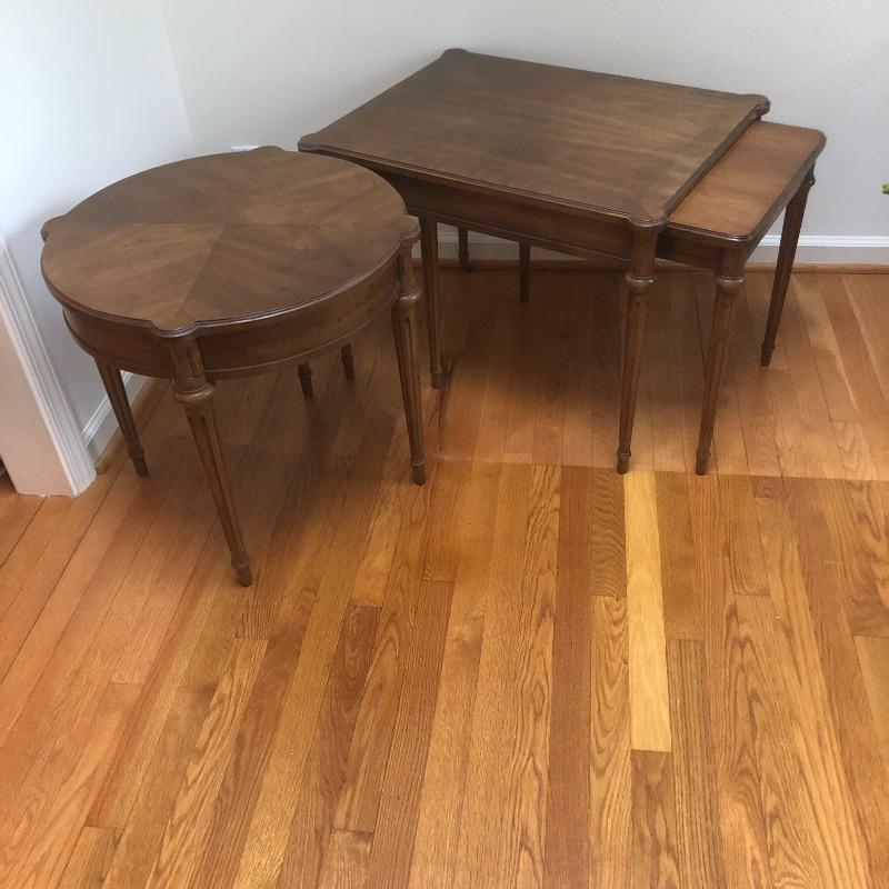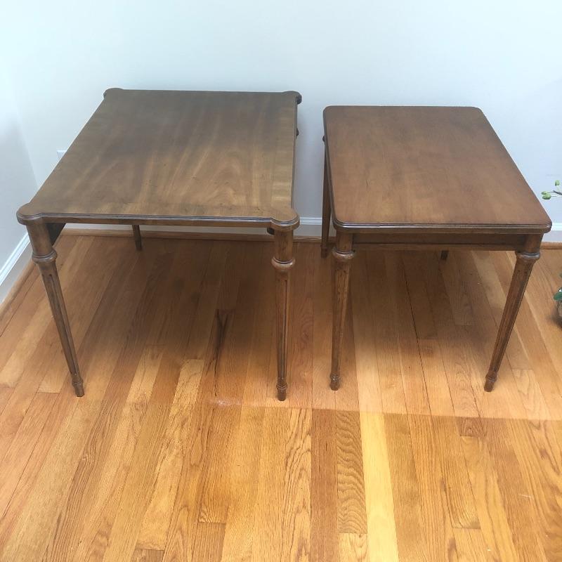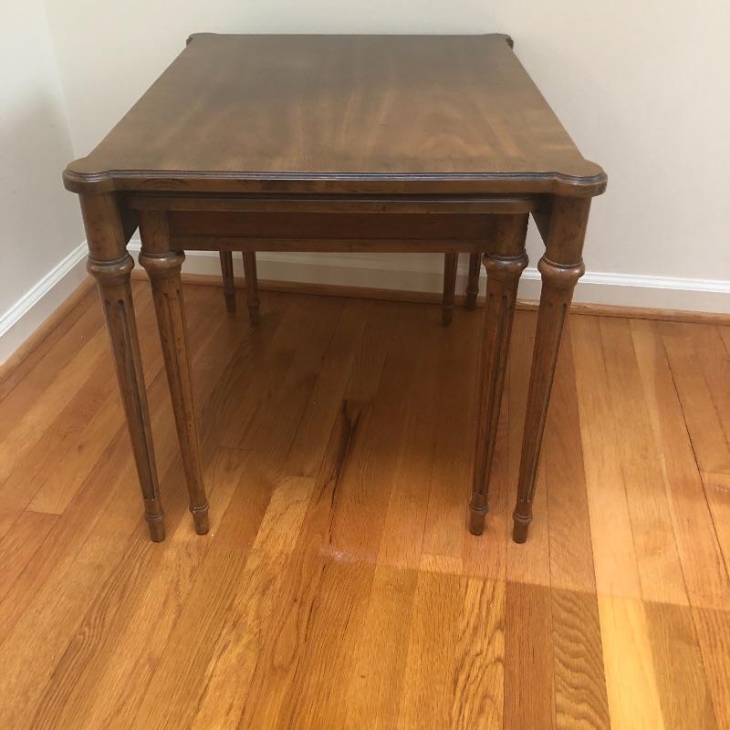 Three tables altogether in this lot, two are nesting tables. All three have matching neoclassical beautifully carved fluted legs. They are a medium brown colored solid wood; the smaller nesting table is a little darker having been stored inside its larger table, see images. All tables are in very good condition.