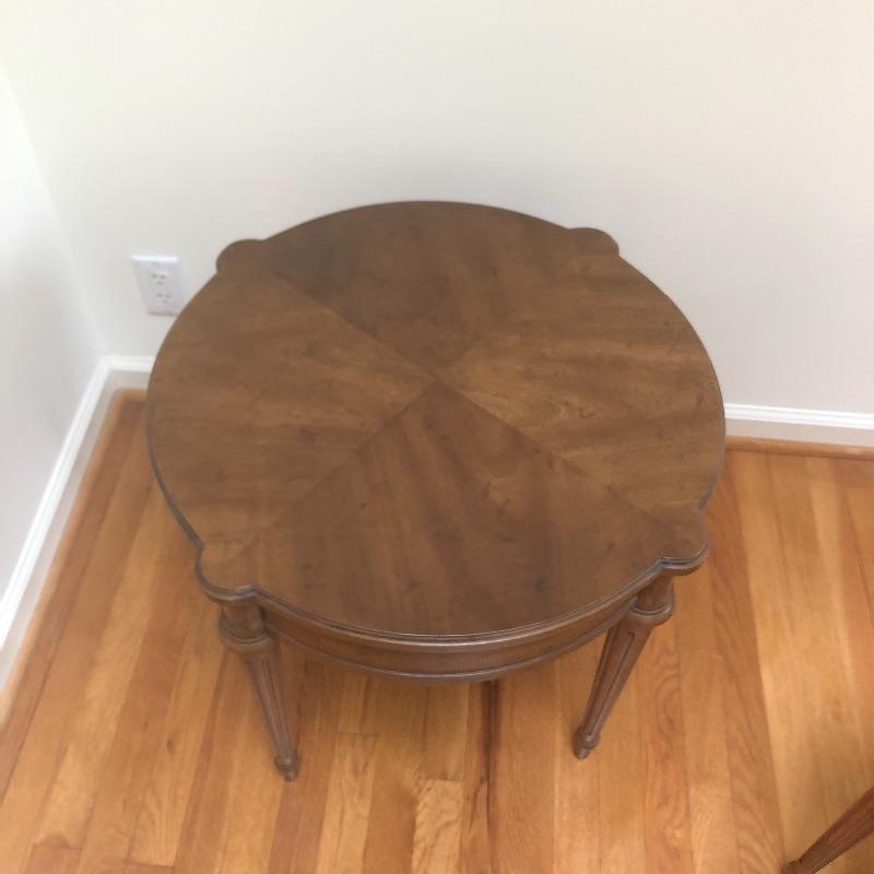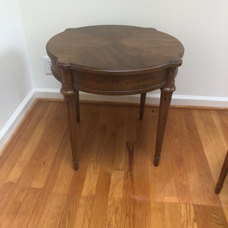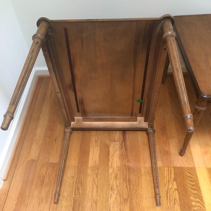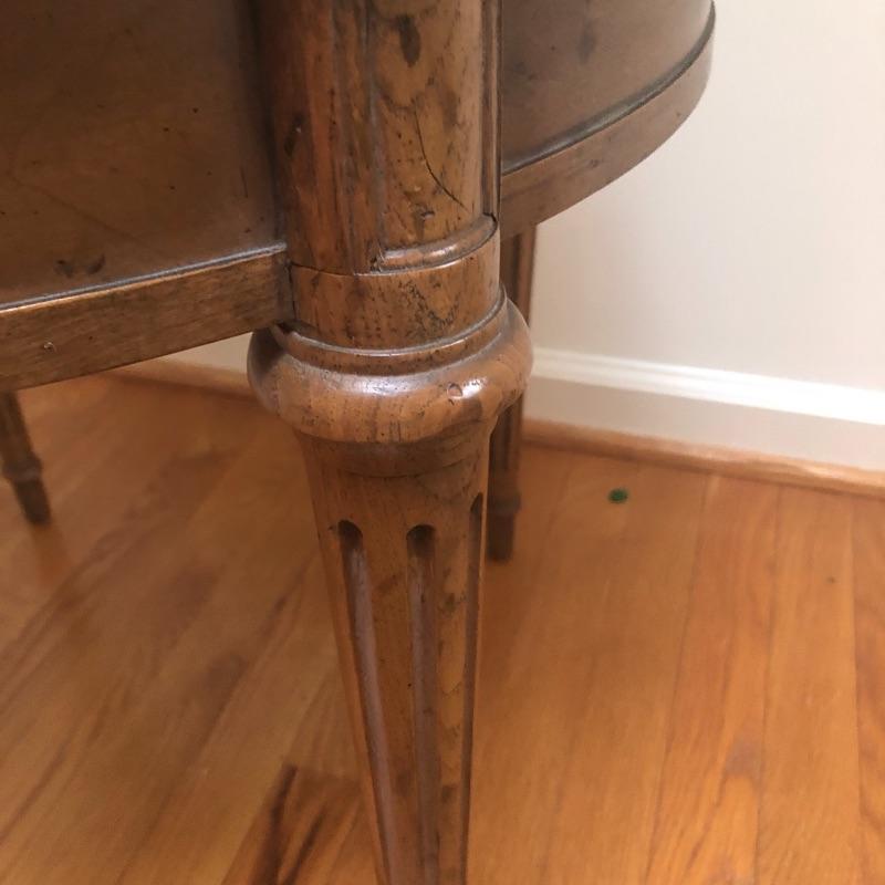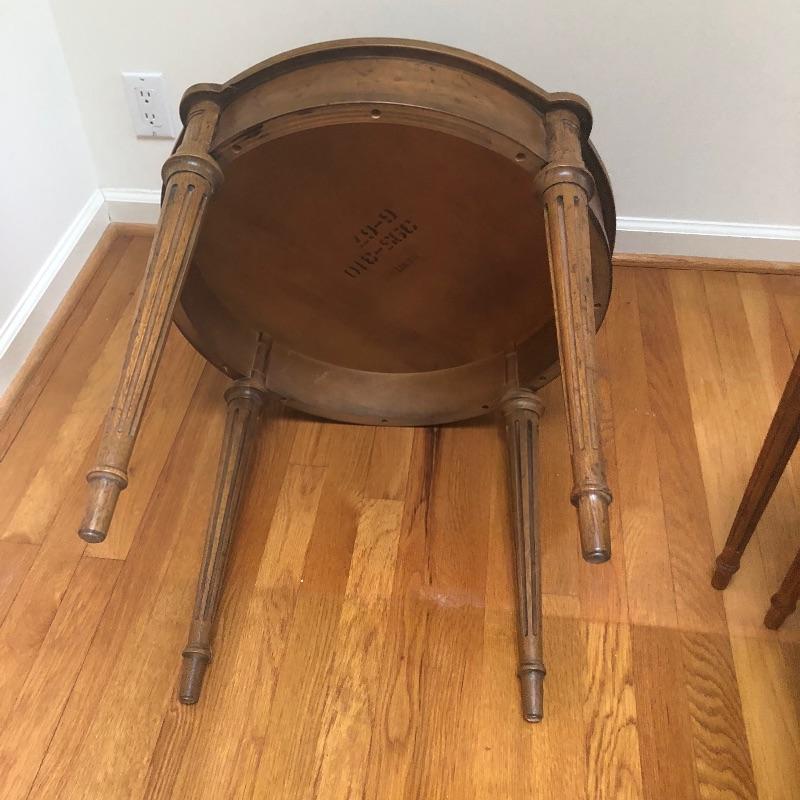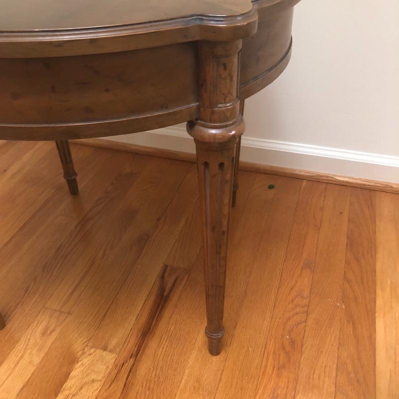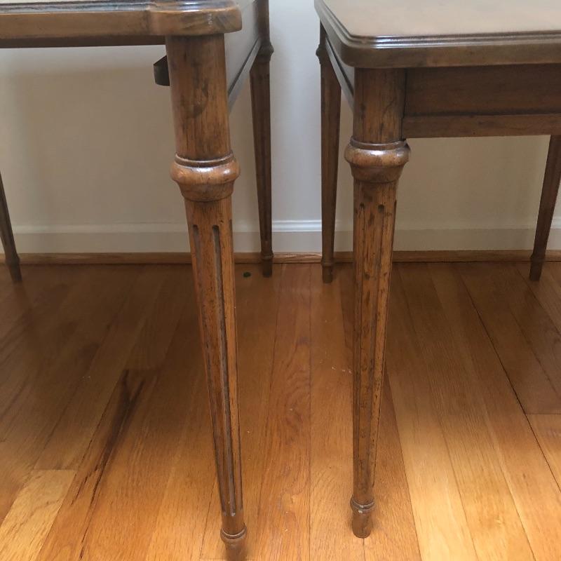 Three tables altogether in this lot, two are nesting tables. All three have matching neoclassical beautifully carved fluted legs. They are a medium brown colored solid wood; the smaller nesting table is a little darker having been stored inside its larger table, see images. All tables are in very good condition.