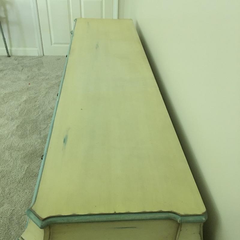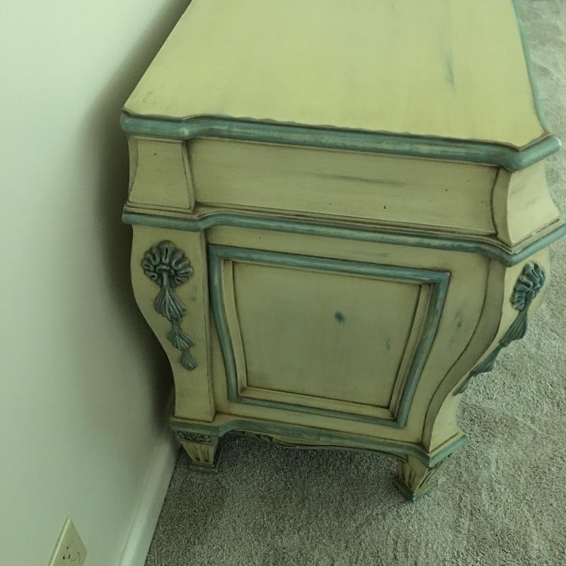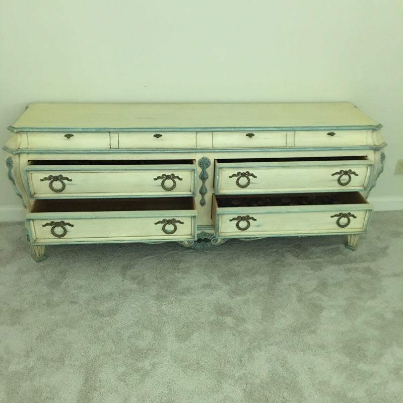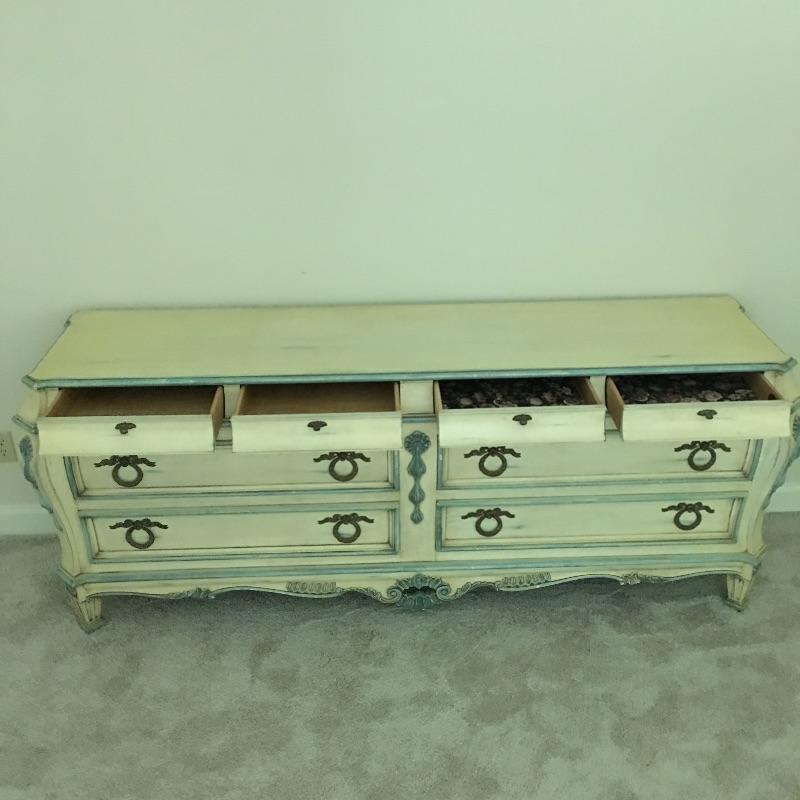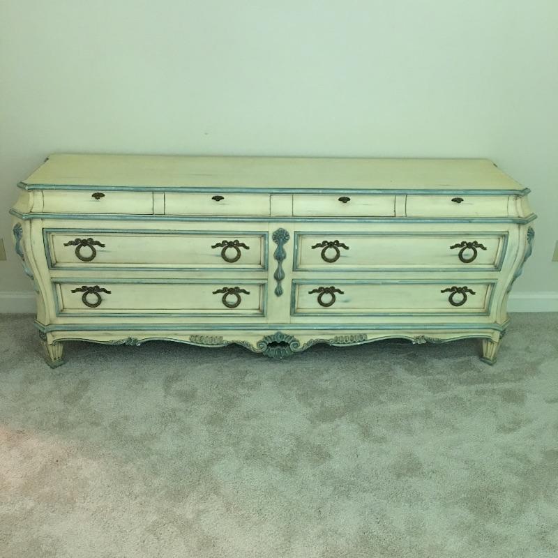 Enchanting Karges eight drawer dresser with dovetail drawers and lovely design on the front and sides - see pictures. Dresser measures 21” x79.5” x32.5”. Bring help dresser is substantial.