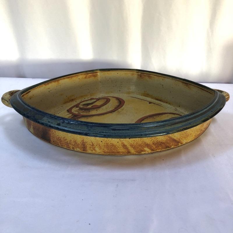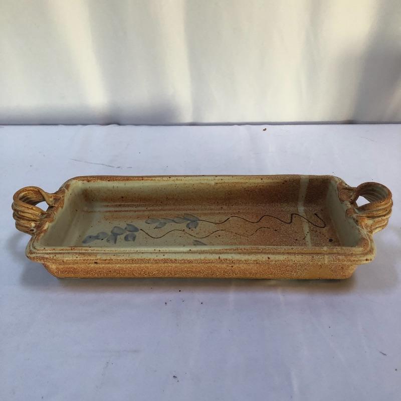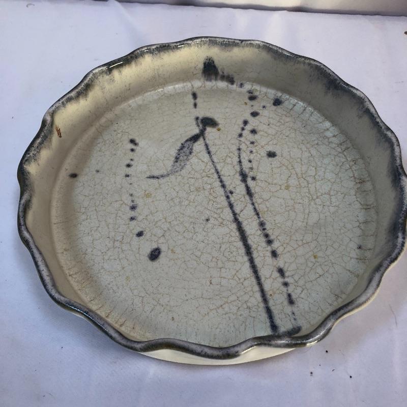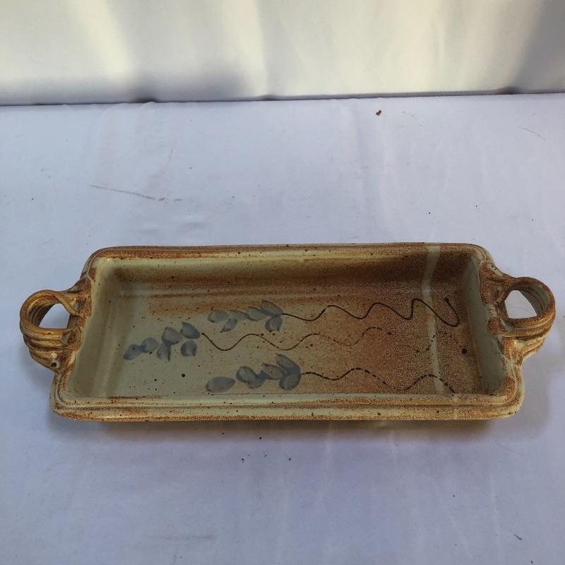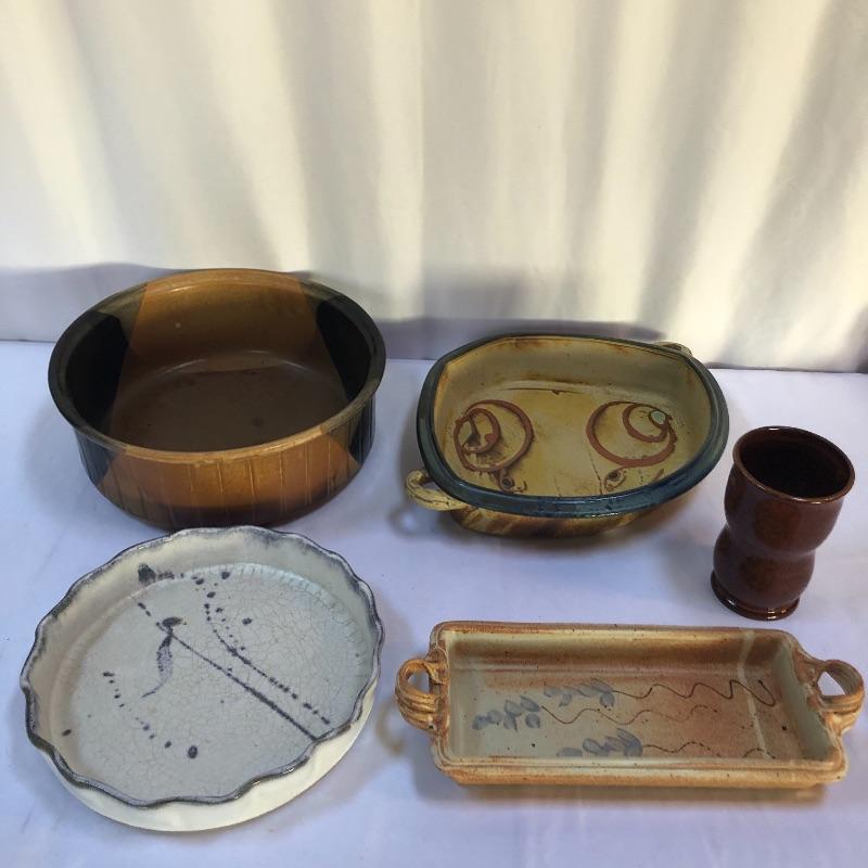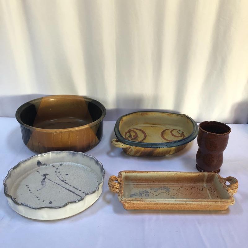 A great assortment of stoneware ceramic pieces for you here. The very large bowl pictured first measures 13” diameter and 5” high. Also included is a cream and blue quiche plate, two platters with handles and a brown speckled vase made by local pottery, Kirkwood clay that measures 4” diameter and 6” tall.