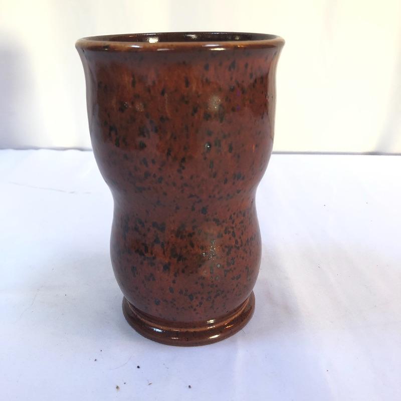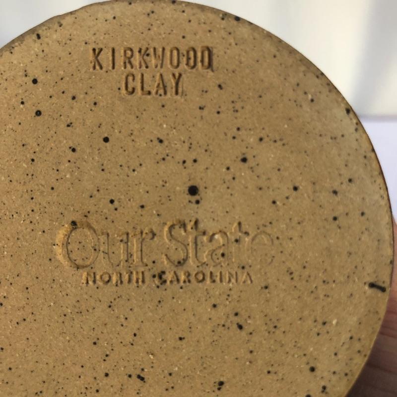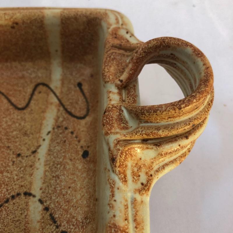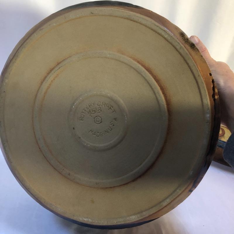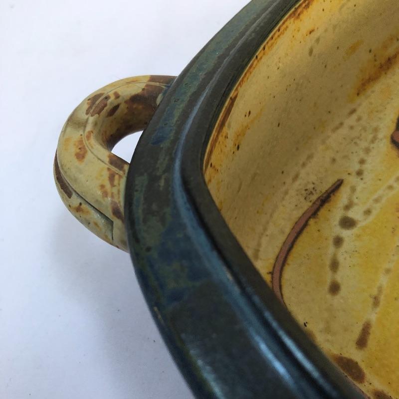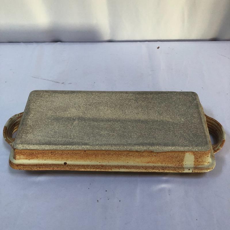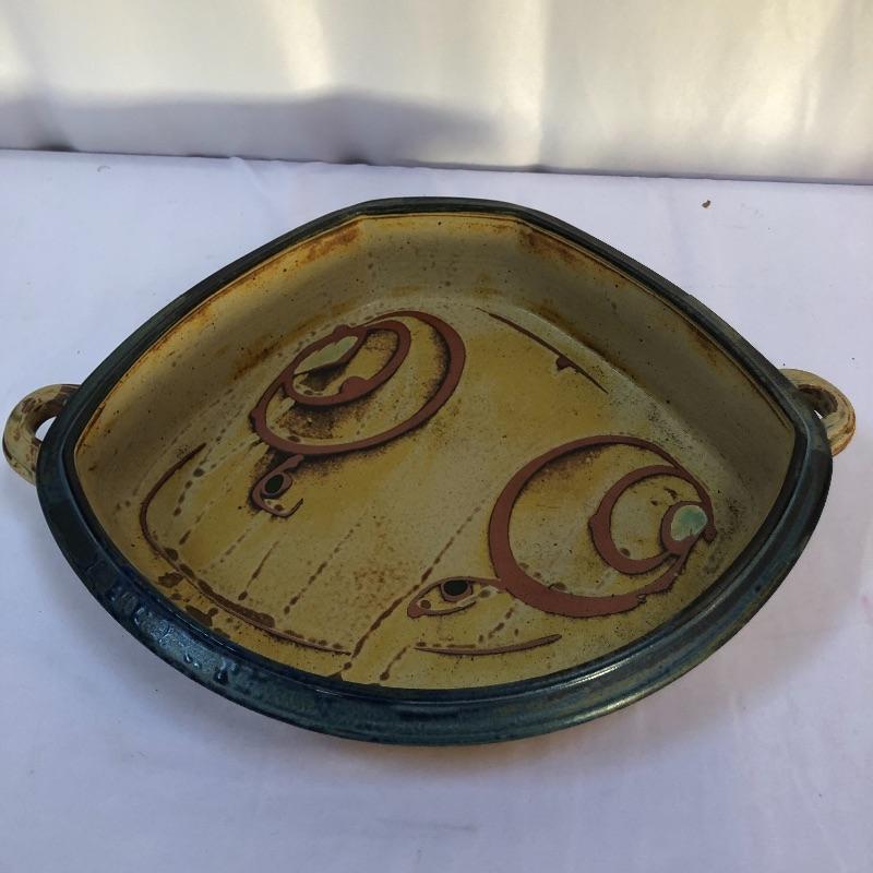A great assortment of stoneware ceramic pieces for you here. The very large bowl pictured first measures 13” diameter and 5” high. Also included is a cream and blue quiche plate, two platters with handles and a brown speckled vase made by local pottery, Kirkwood clay that measures 4” diameter and 6” tall.