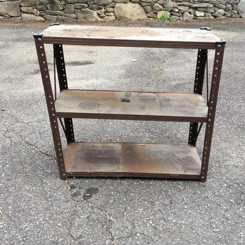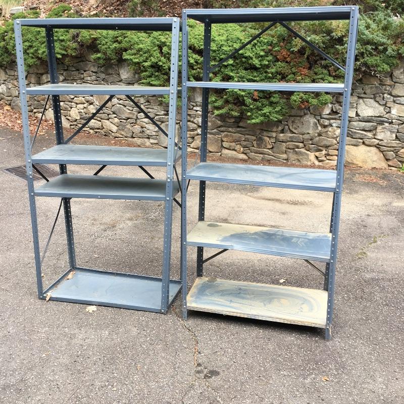Largest unit measures 17.25” x 36.5” x 73”. A great set of shelves for your garage or storage area. A few shelves have some bends and dents, but otherwise in good shape.
