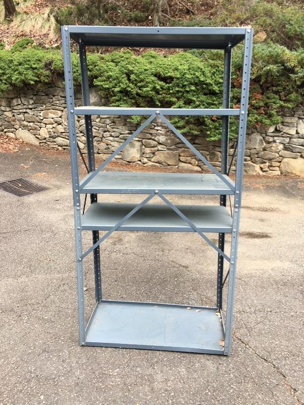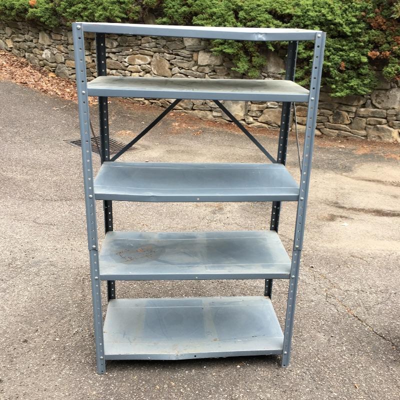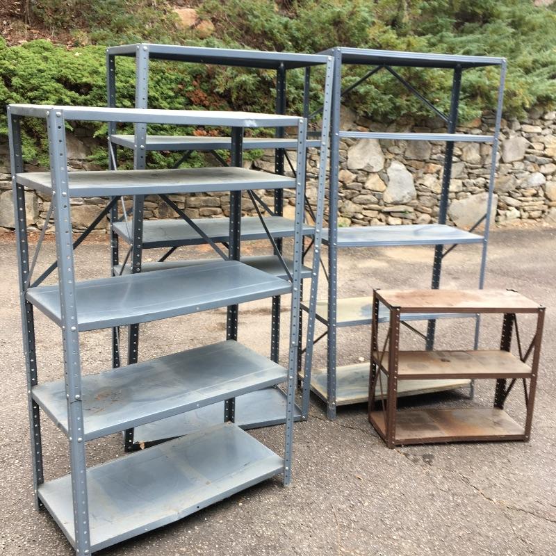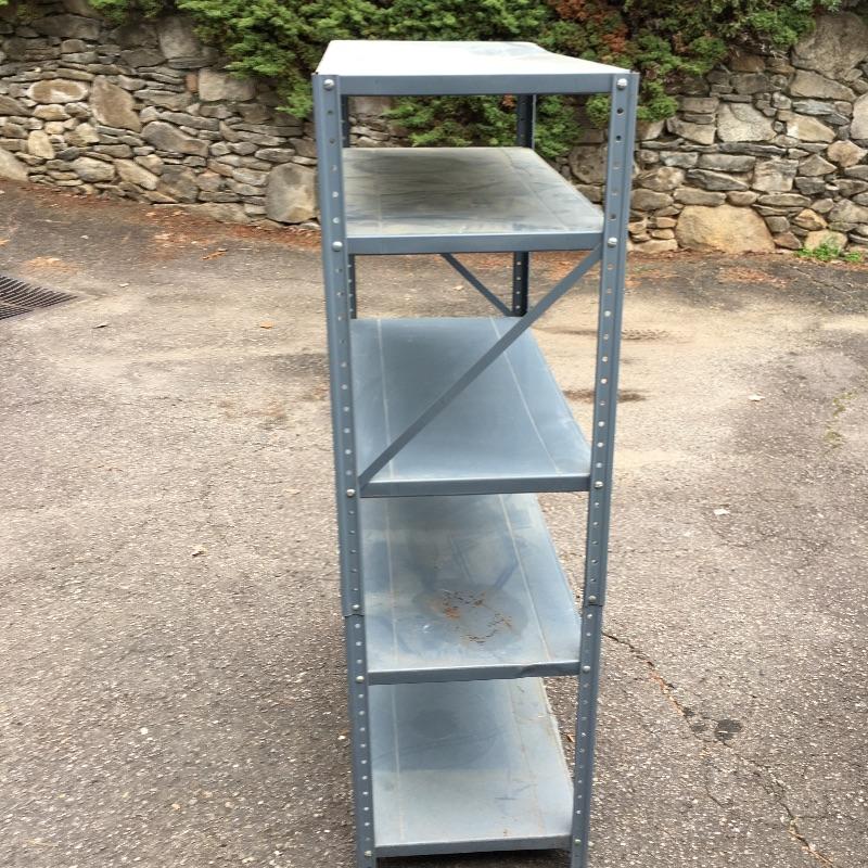 Four metal shelving units. Lot includes three -five shelf units and one smaller -three shelf unit.