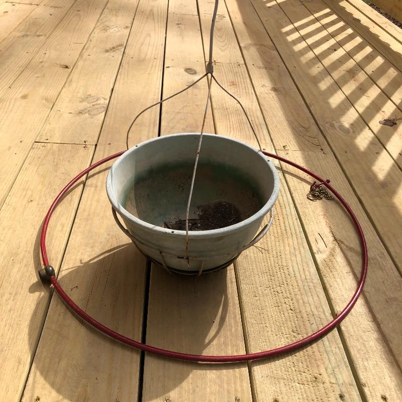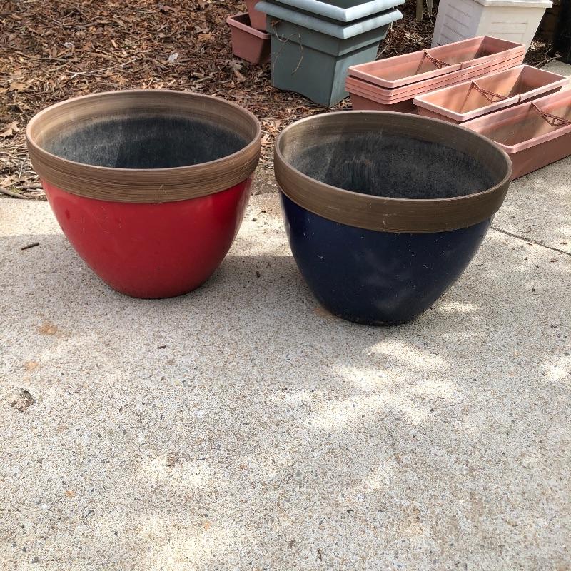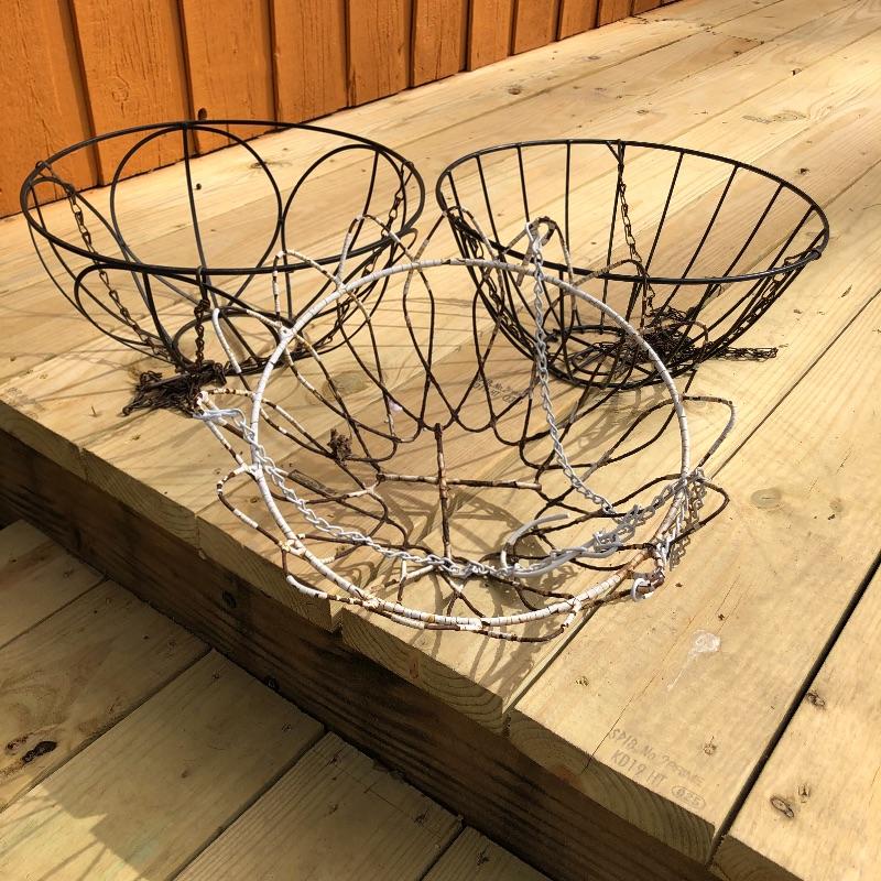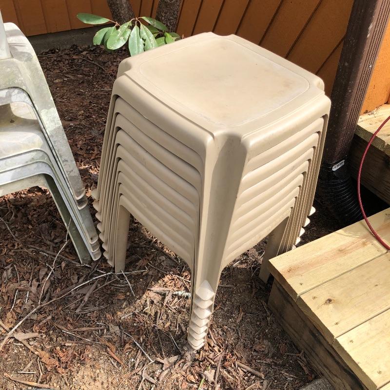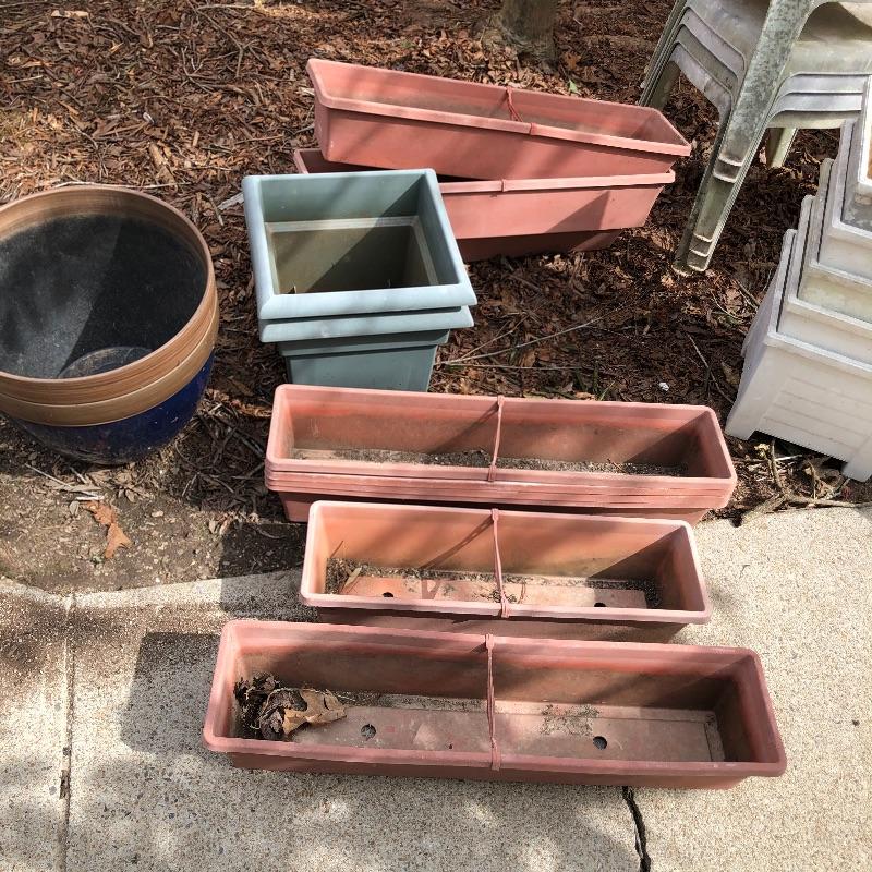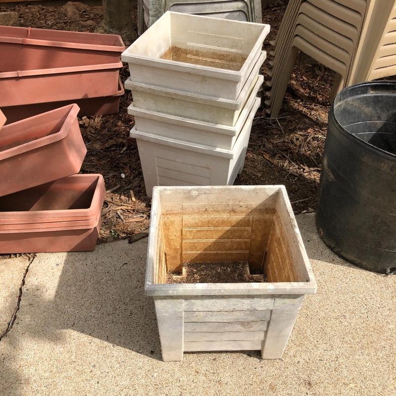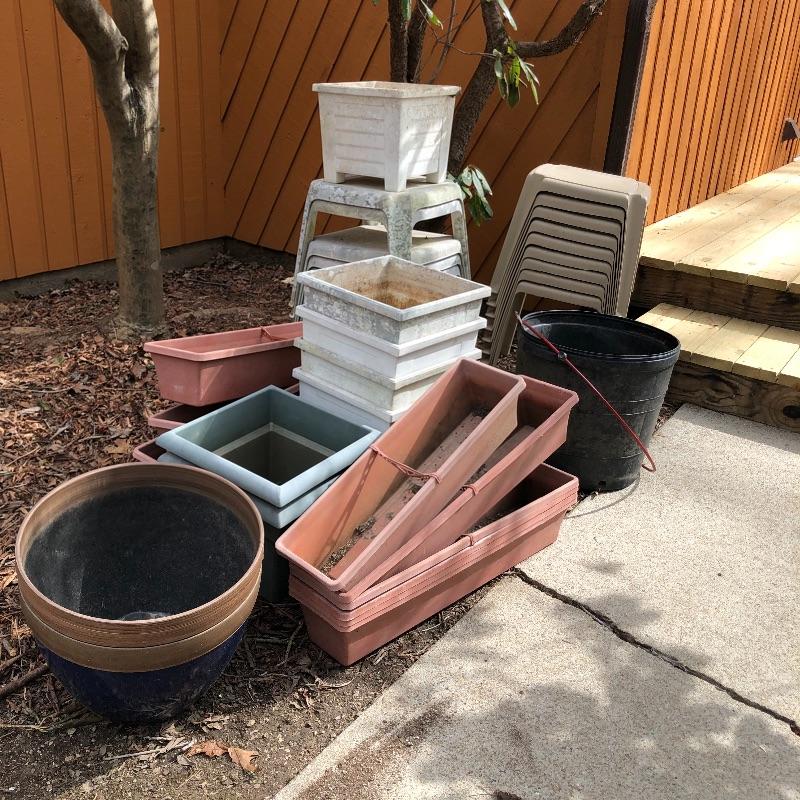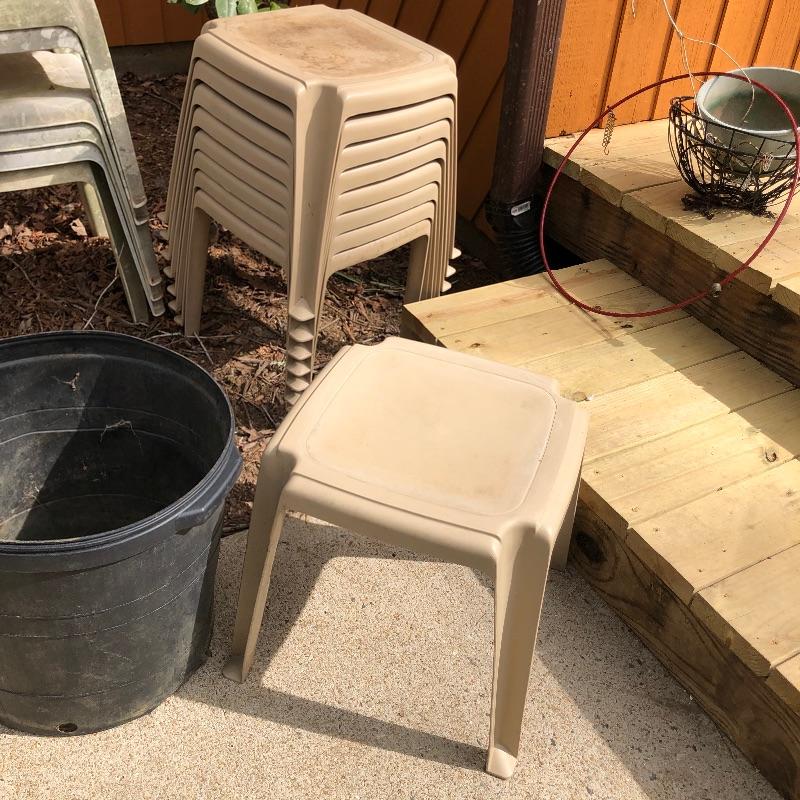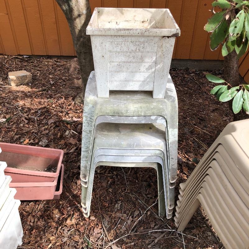 Use these 15+ stools for seating or for plant stands/tables. Nine are matching in size and tan colored, the rest are white. Also included are lots of planters in various shapes and sizes with 3 hanging baskets. Many items could use a deep clean, as they have been exposed to the elements.