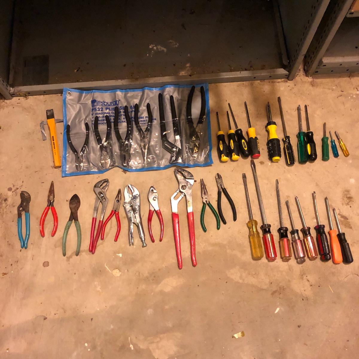 A good start to your tool collection or add to it. Lot includes Pittsburgh six piece plier set, two torx drivers and a assortment of flat and Phillips screwdrivers. Also includes a variety of pliers.