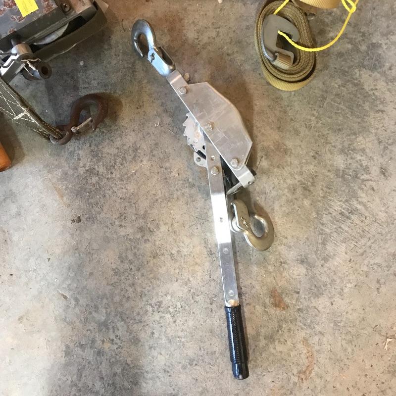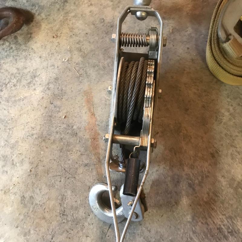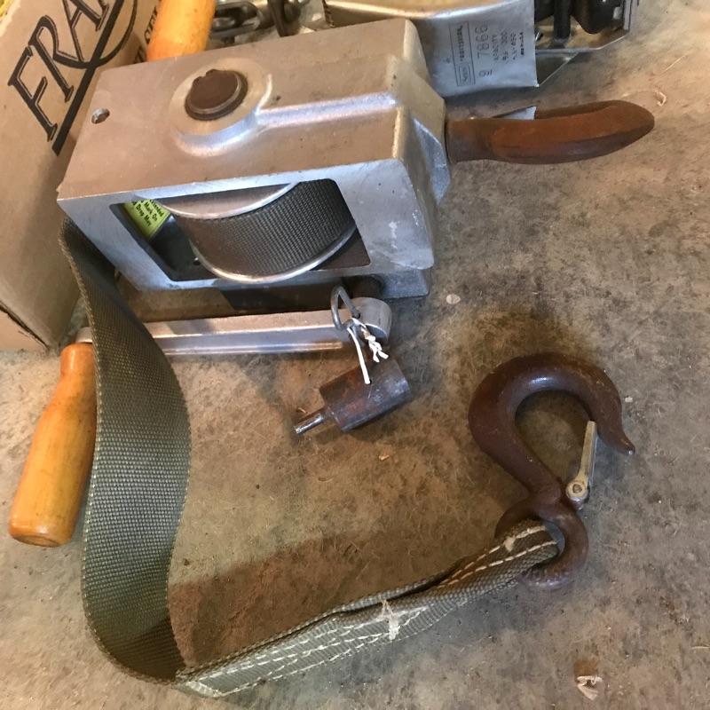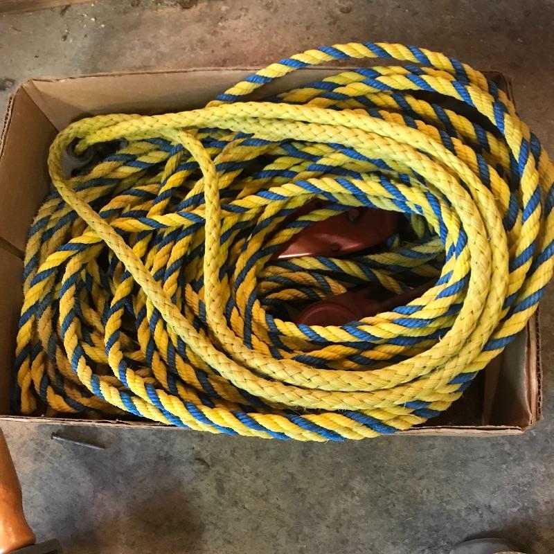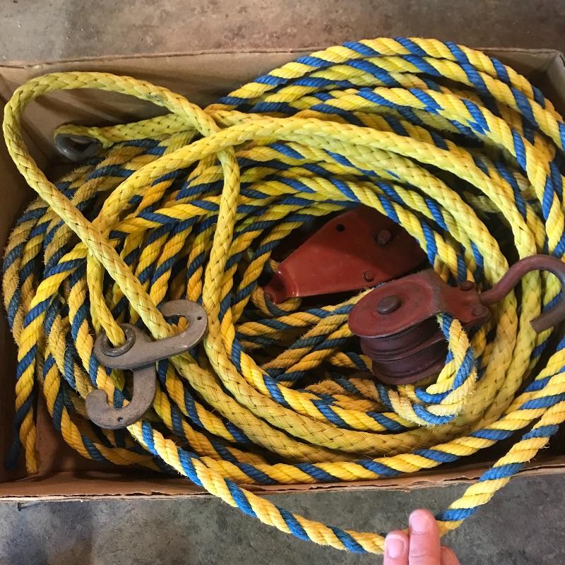 Three automation helpers here! A Sears Craftsman Come-A-Long ratchet cable puller. A vintage Process Engineering Corp. heavy duty pulley and one more red pulley with a blue and yellow rope already hooked up. Lastly a small lightweight nylon tie rope completes the lot. No shipping.