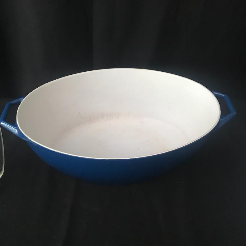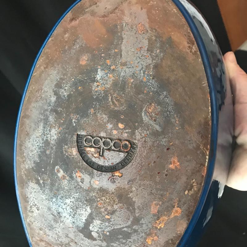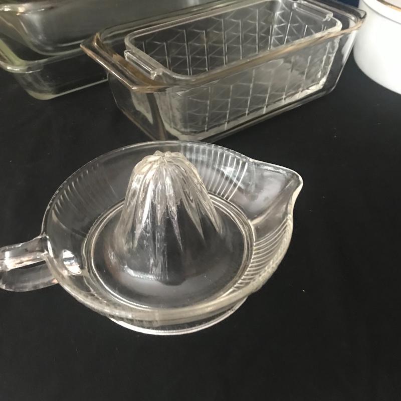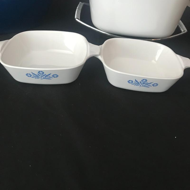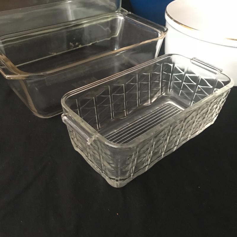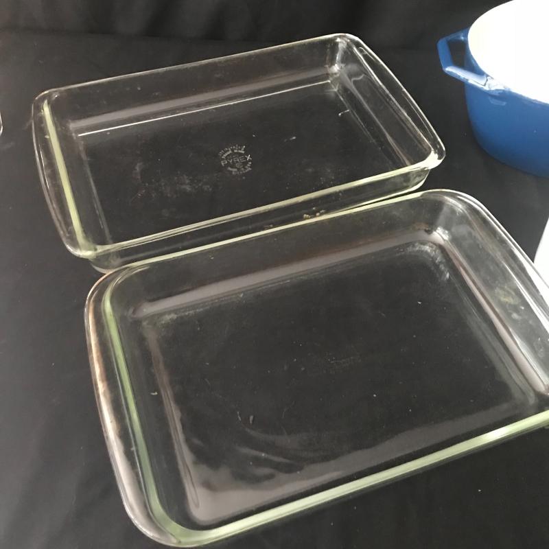 Two large baking dishes and loaf pan by Pyrex. One ornate loaf pan and one Anchor Hocking pie dish. Copco cook pot with rusting on the bottom, measures 15.5” x9”. Two small Corning and one larger one, but does not appear to be Corning. Stand and handle for Corning pieces. Local pick up only.