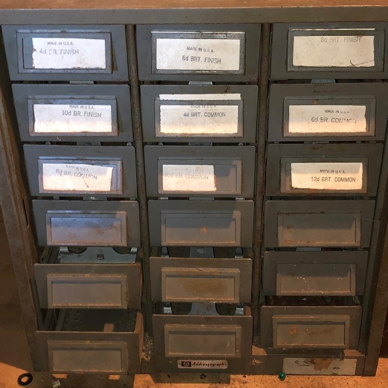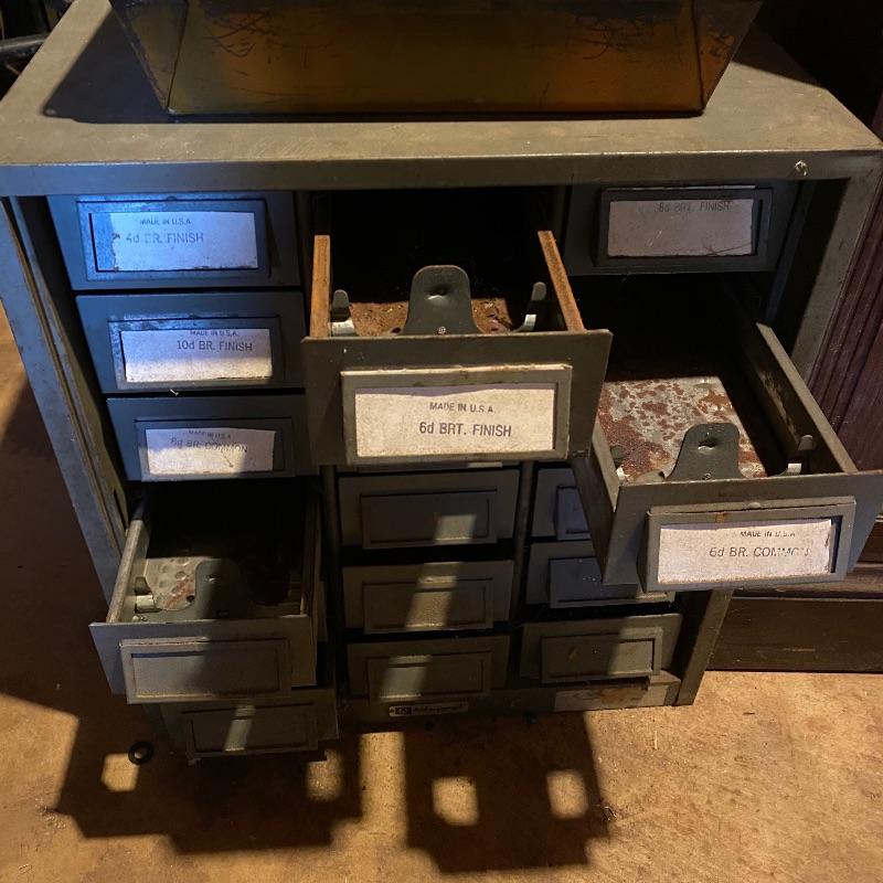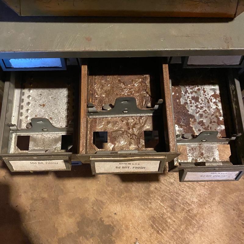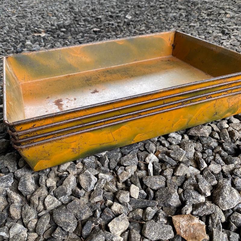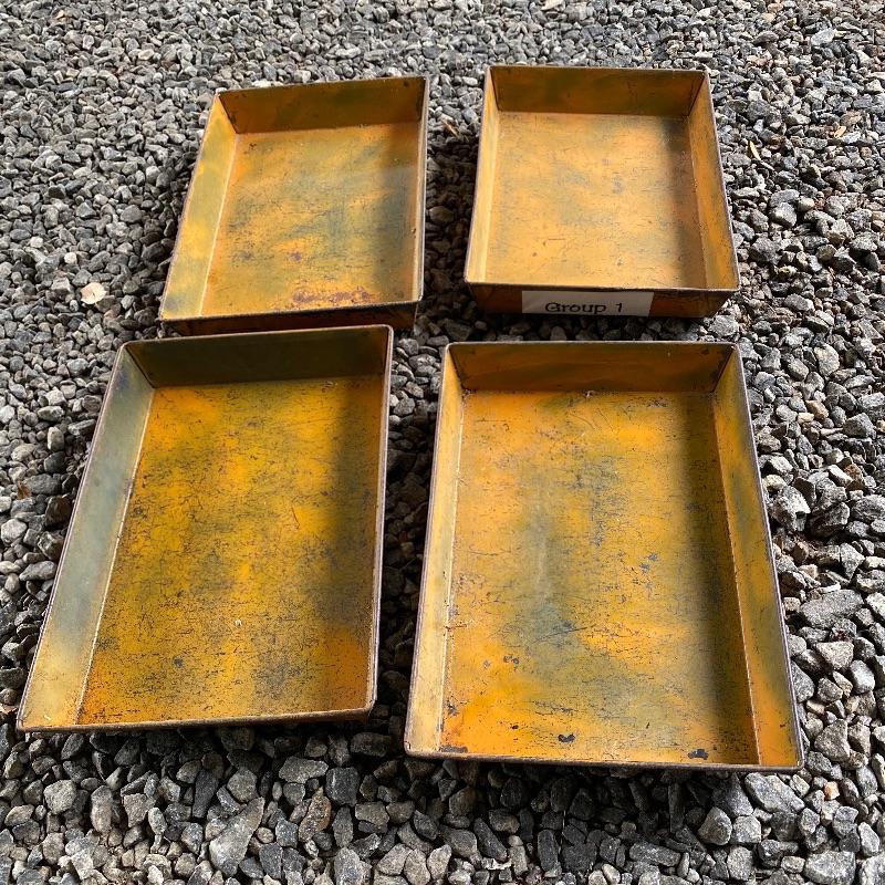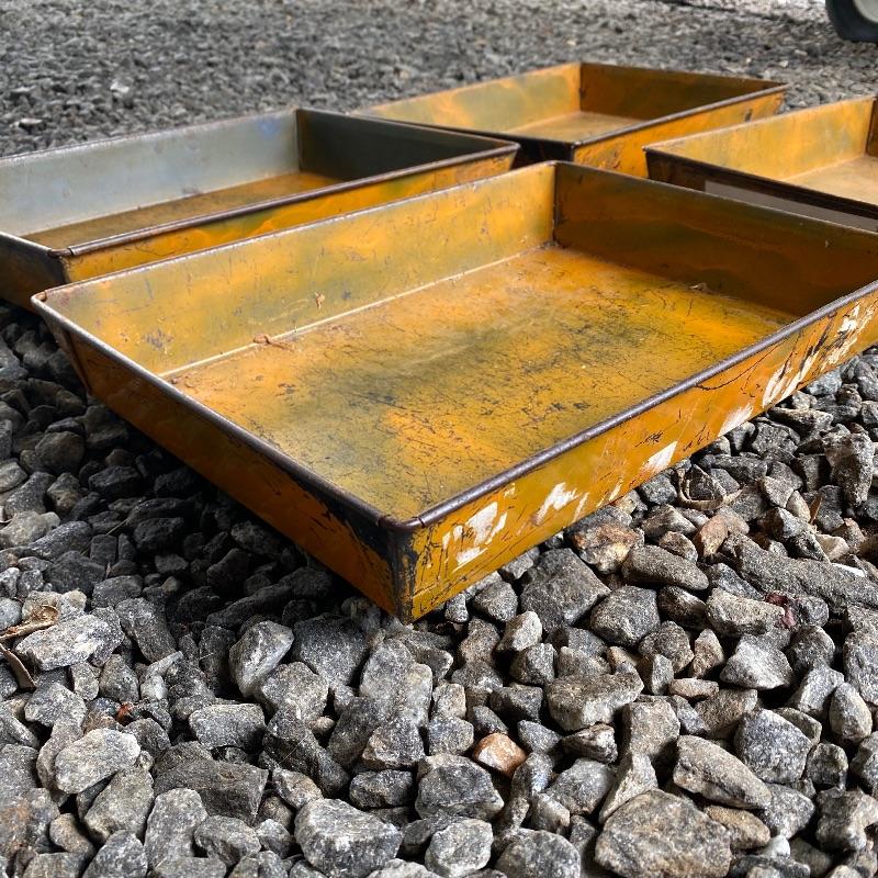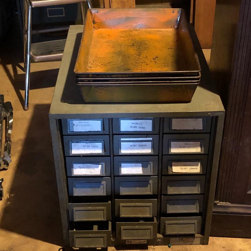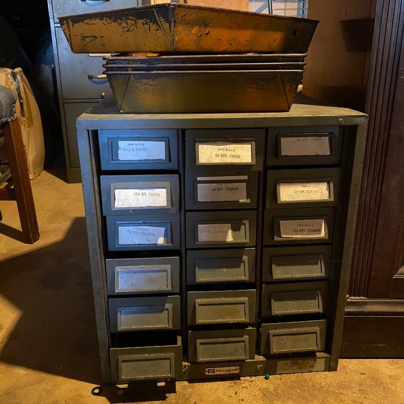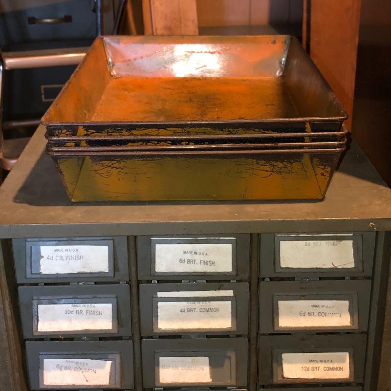 This lot includes a metal card catalog cabinet with 18 small drawers for cards. This is a cool old school way to get organized. Use it to store anything. Lot includes 4 metal trays. Perfect for organizing your tools and such. That is not rust in the photos but rather an old layer of orange paint. They are in good condition with no holes and a rustic vibe. No shipping.