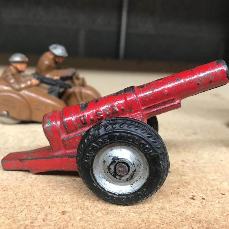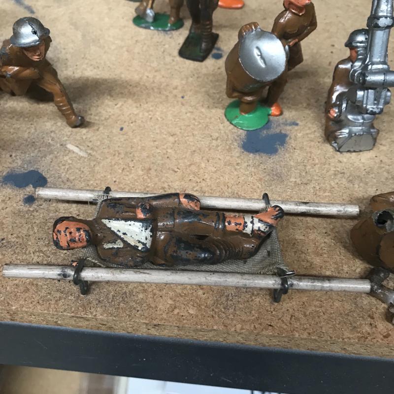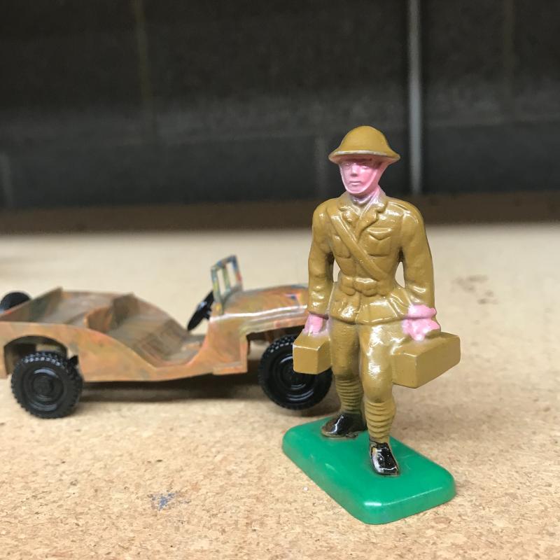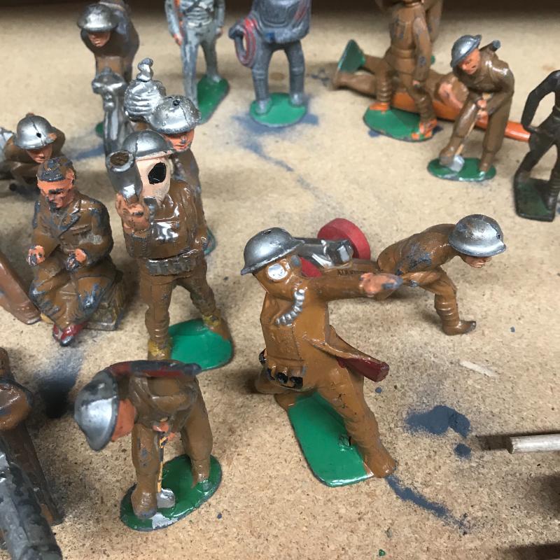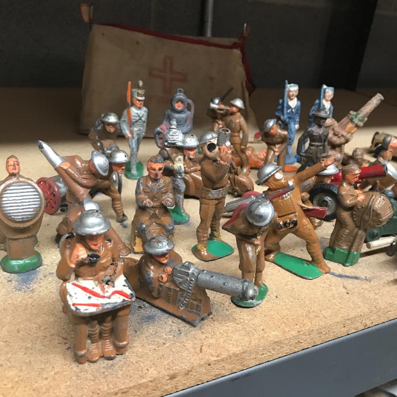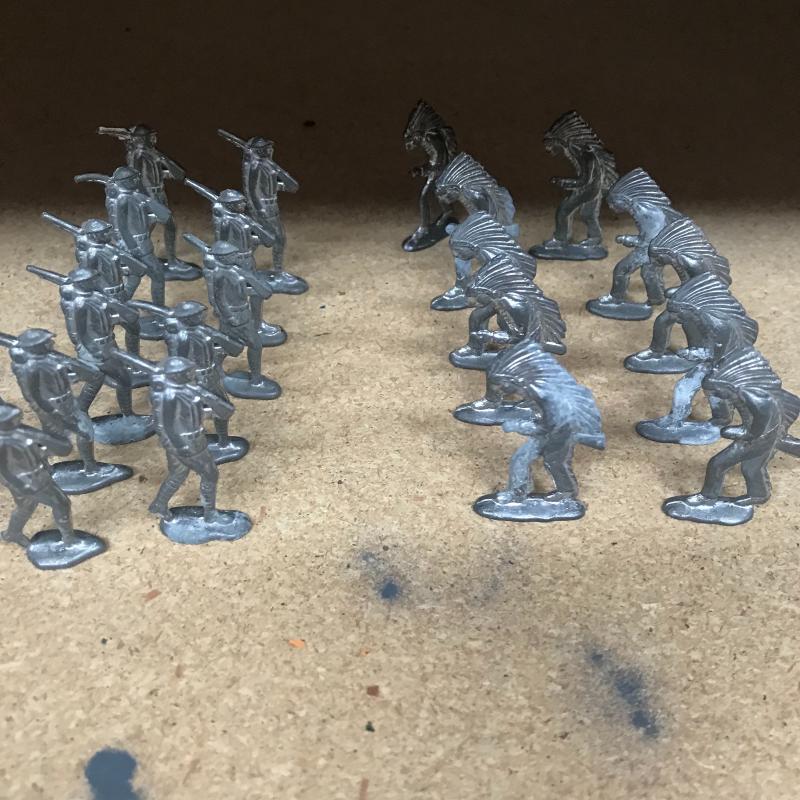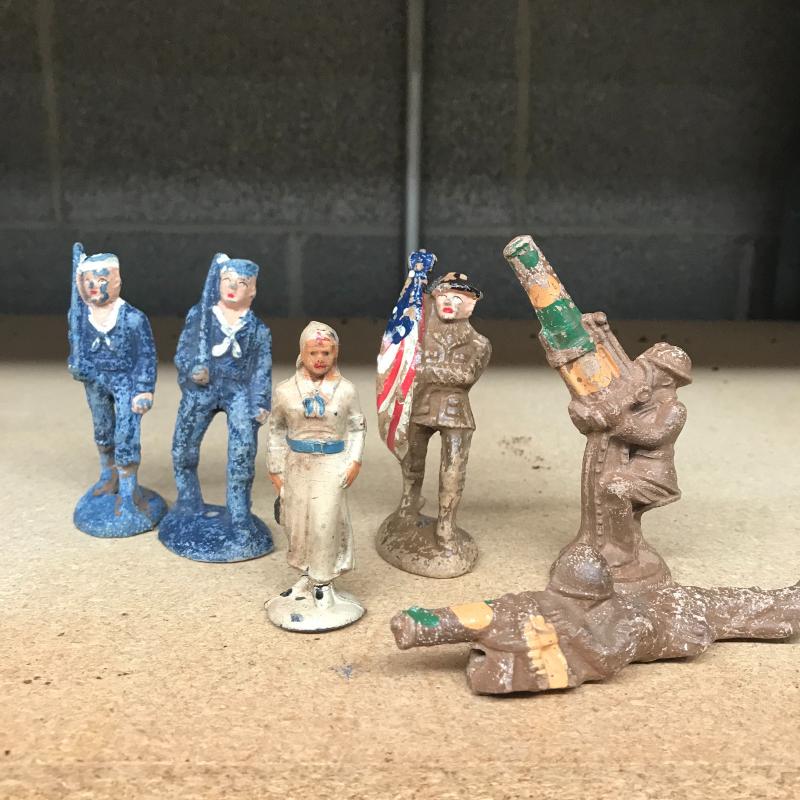 Metal, plastic and resin made play figures. At least 16 are plastic soldier and Jeep figures. Twenty seven painted metal ones with a few broken ones (battle injuries), also six that are a painted resin. Cloth medical unit and twenty-one military and Indian metal figures. Shipping available