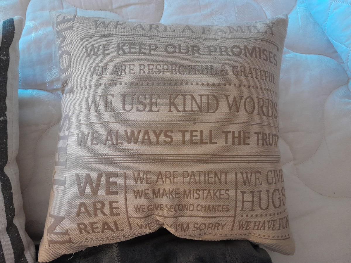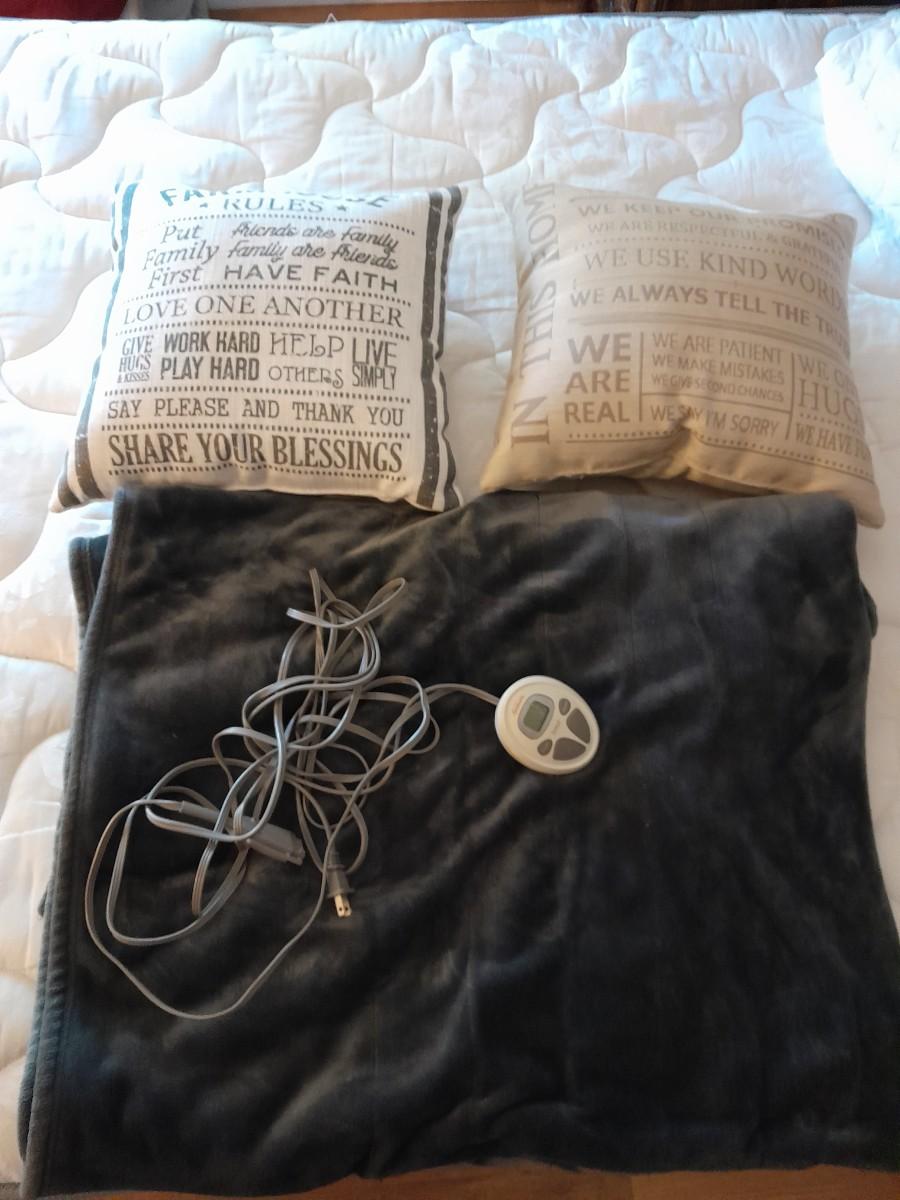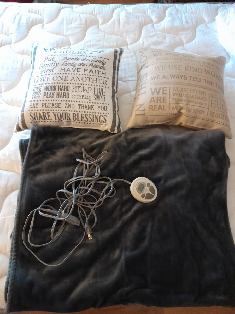TWO THROW PILLOWS WITH SAYINGS AND AN ELECTRIC THROW BLANKET