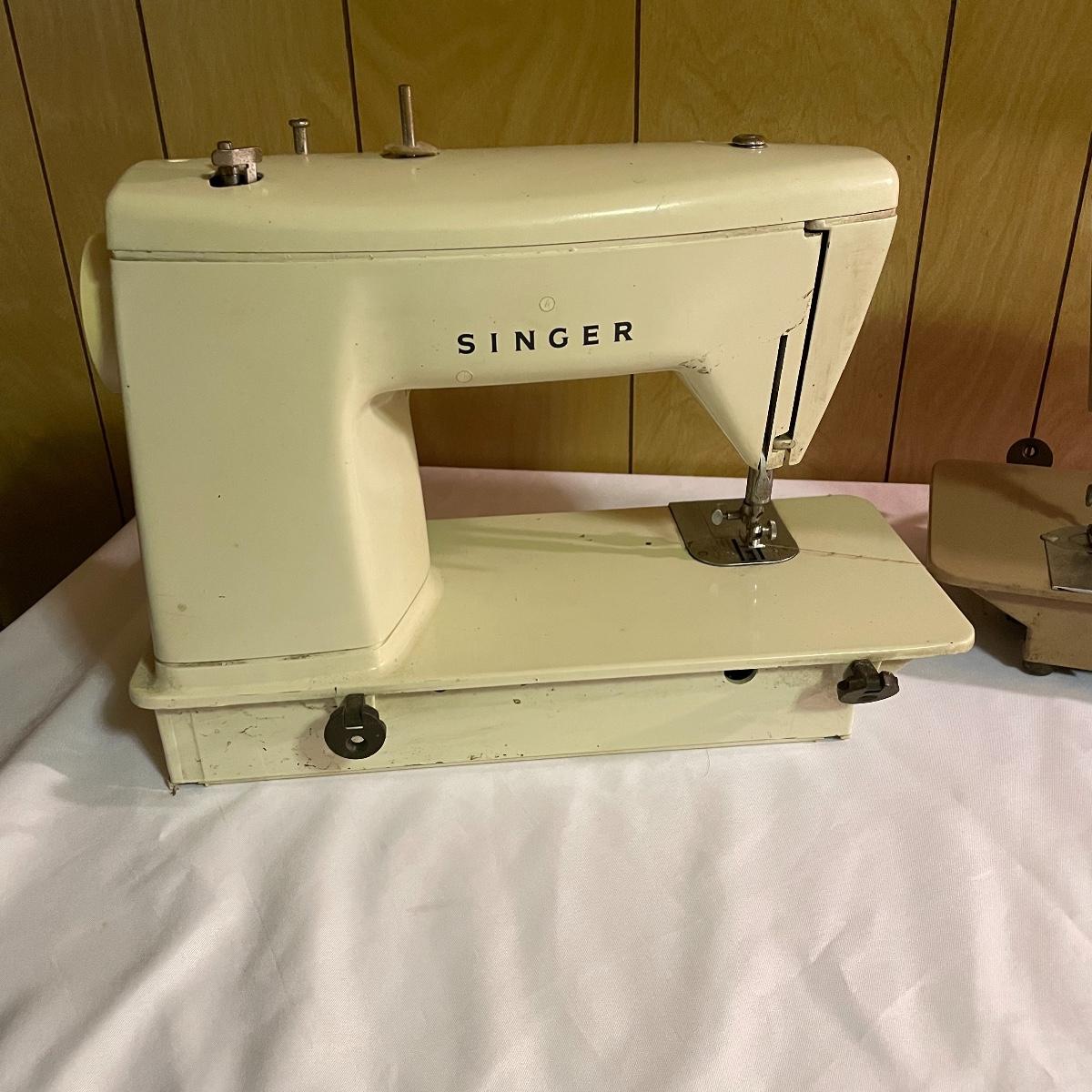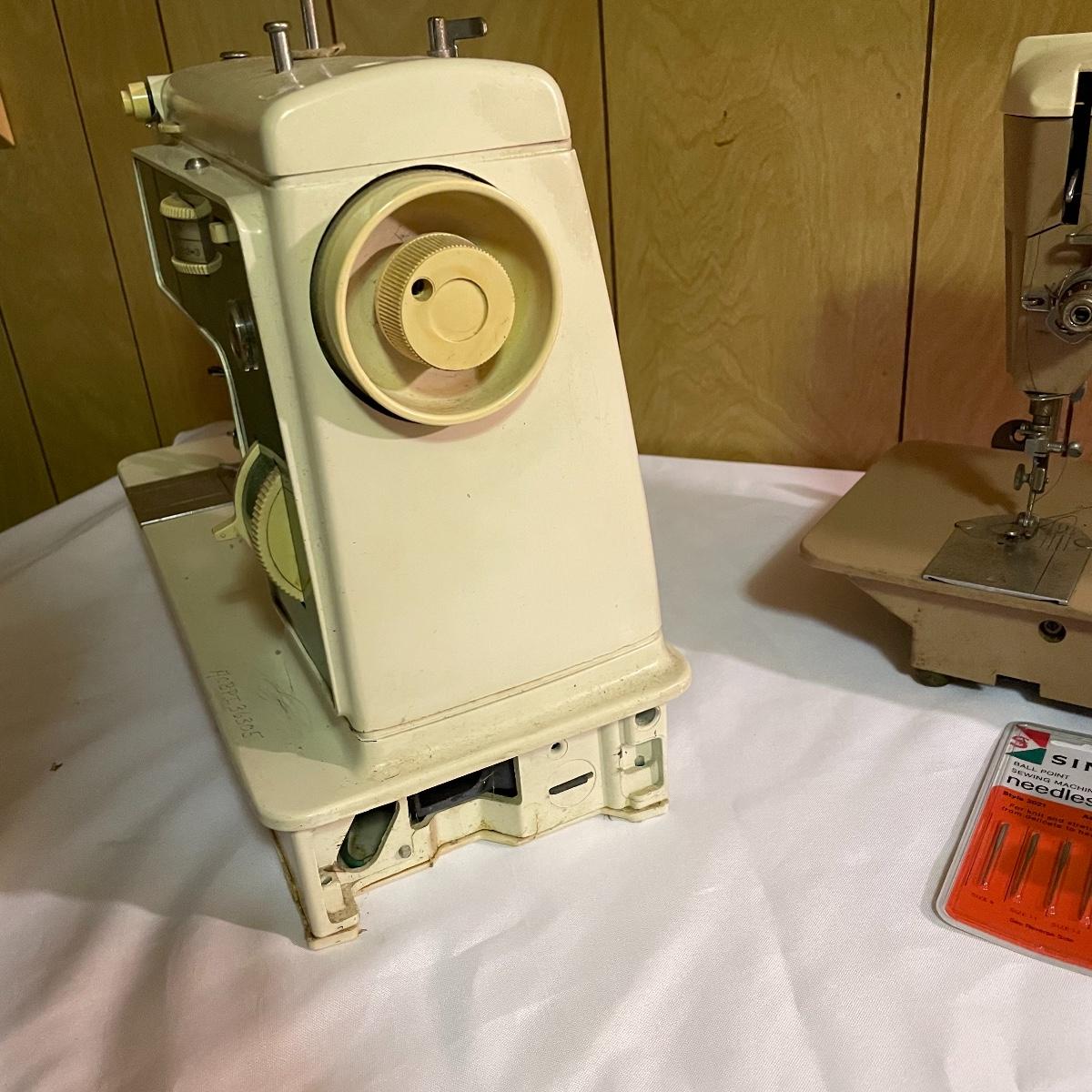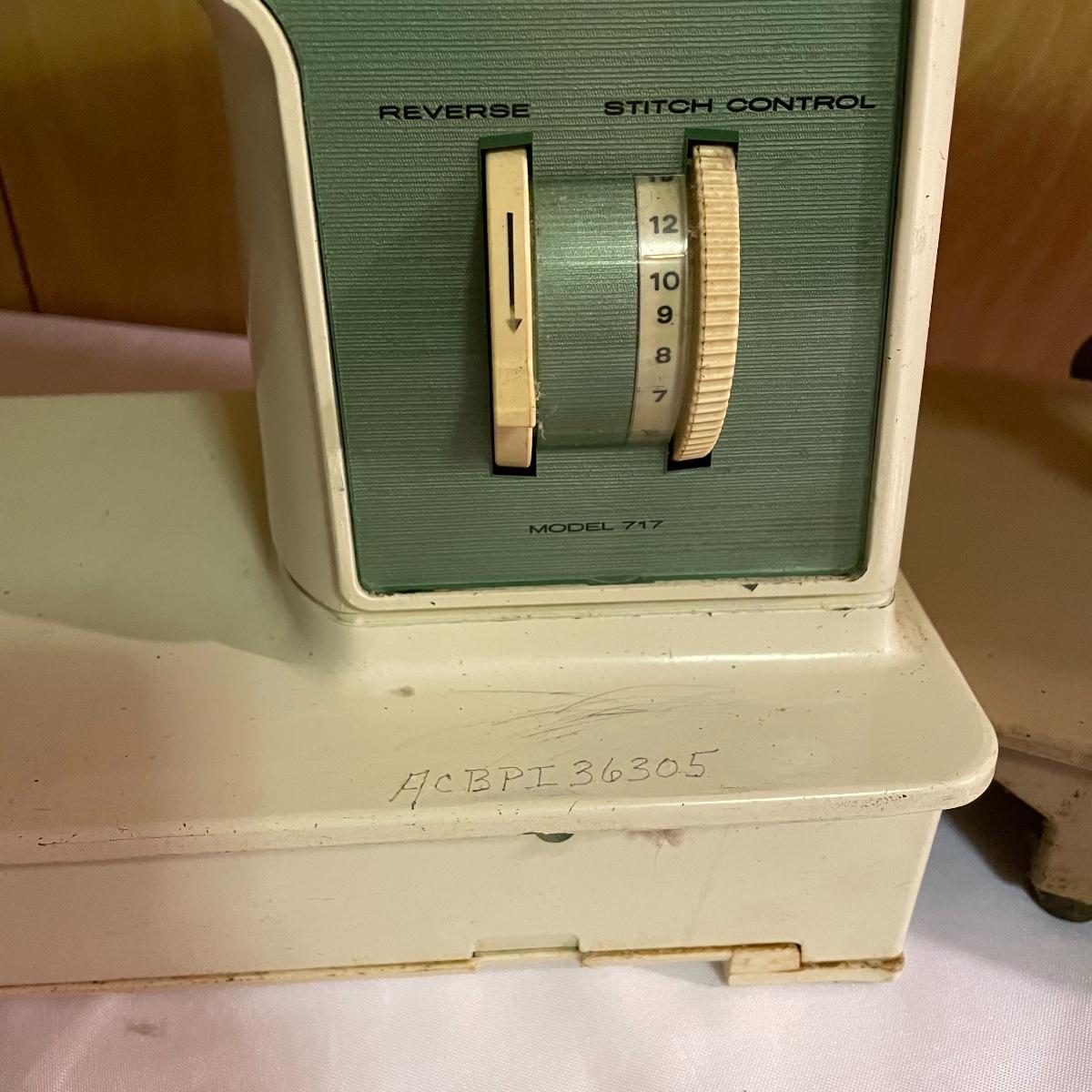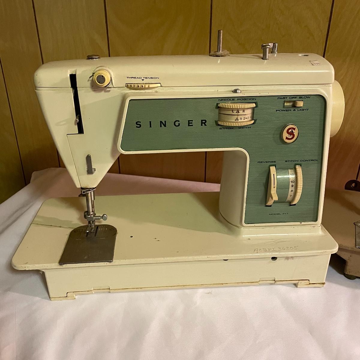 Two classic machines in need of repair or to be used for parts. Each machine is missing electric cord, therefore we could not test. They both seem in fairly good condition on the outside and each are heavy for their size. The singer with the green face plate is model 717, the tan and brown has its pedal and appears to be model 414. See images. Local pick up only.