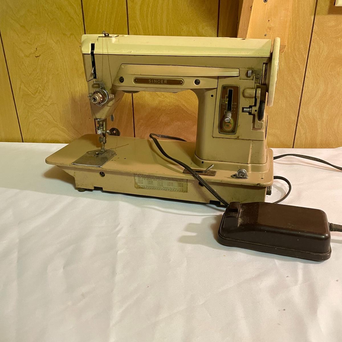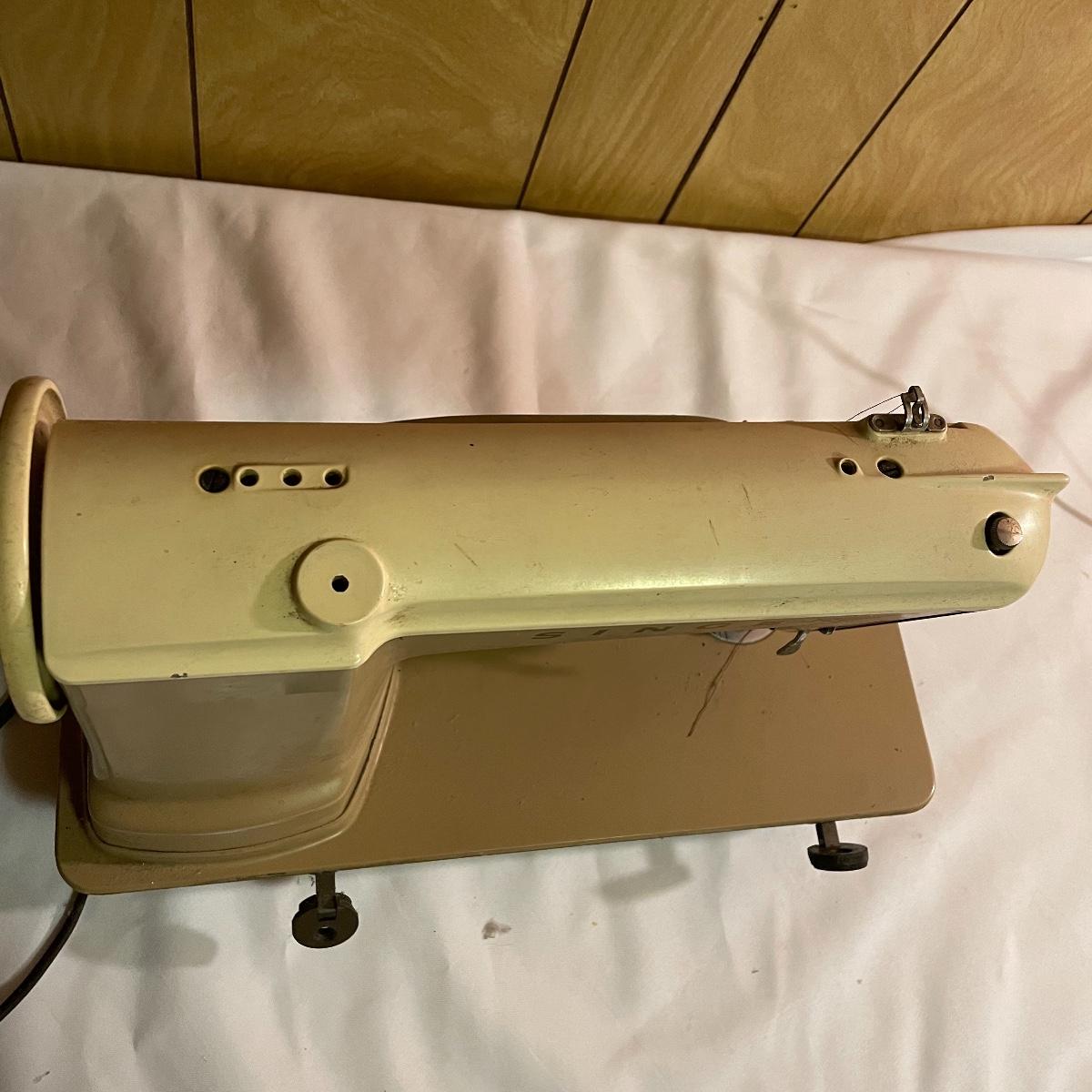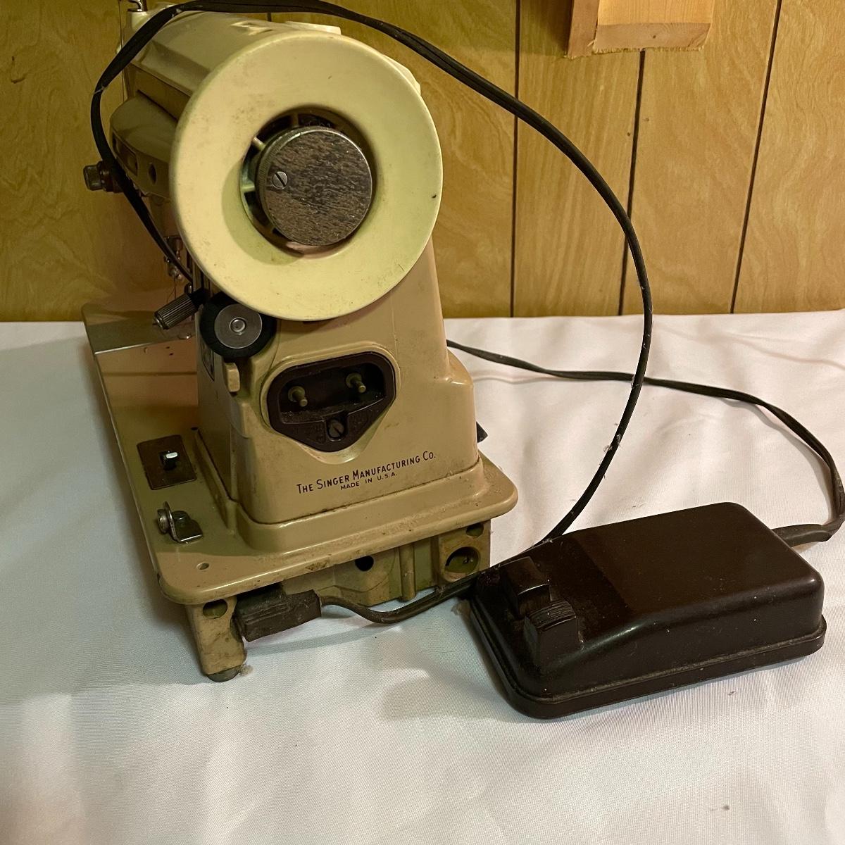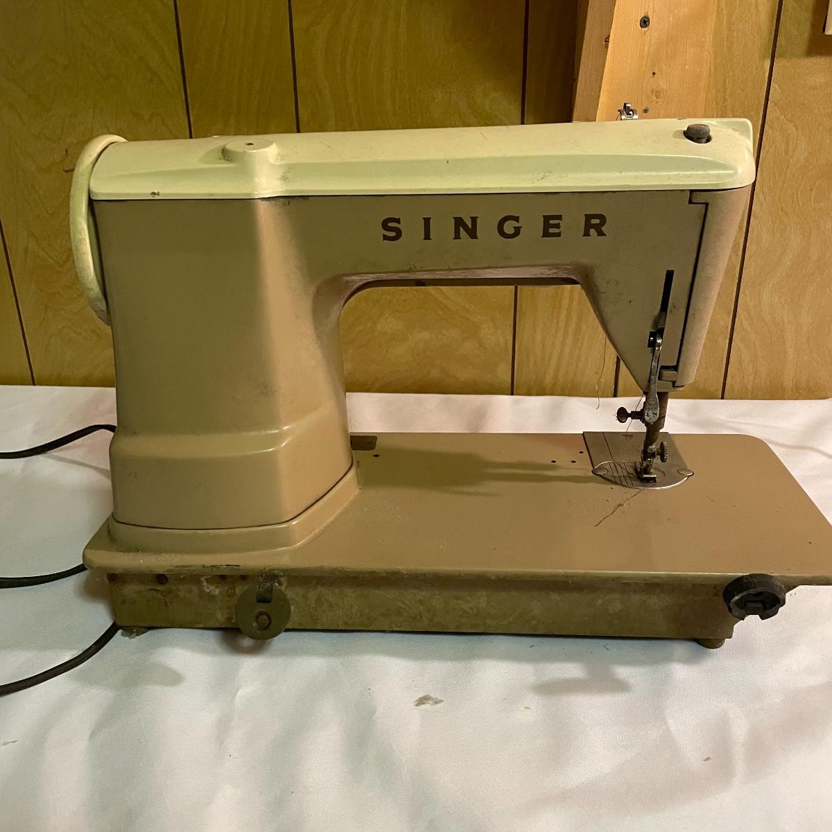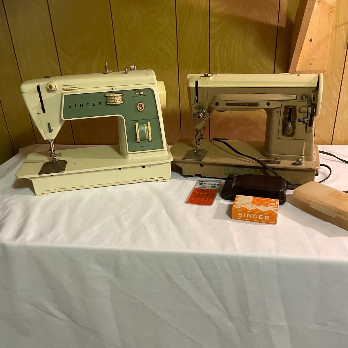 Two classic machines in need of repair or to be used for parts. Each machine is missing electric cord, therefore we could not test. They both seem in fairly good condition on the outside and each are heavy for their size. The singer with the green face plate is model 717, the tan and brown has its pedal and appears to be model 414. See images. Local pick up only.