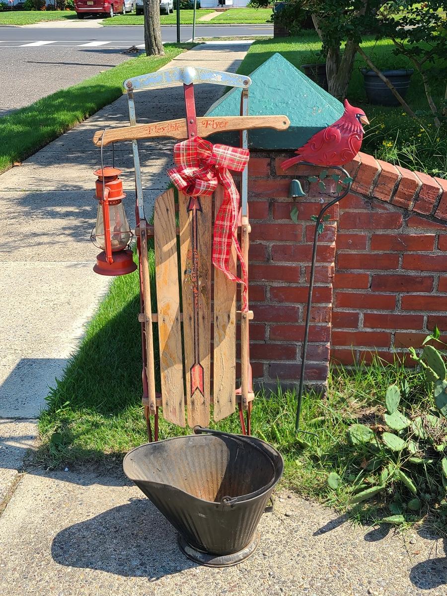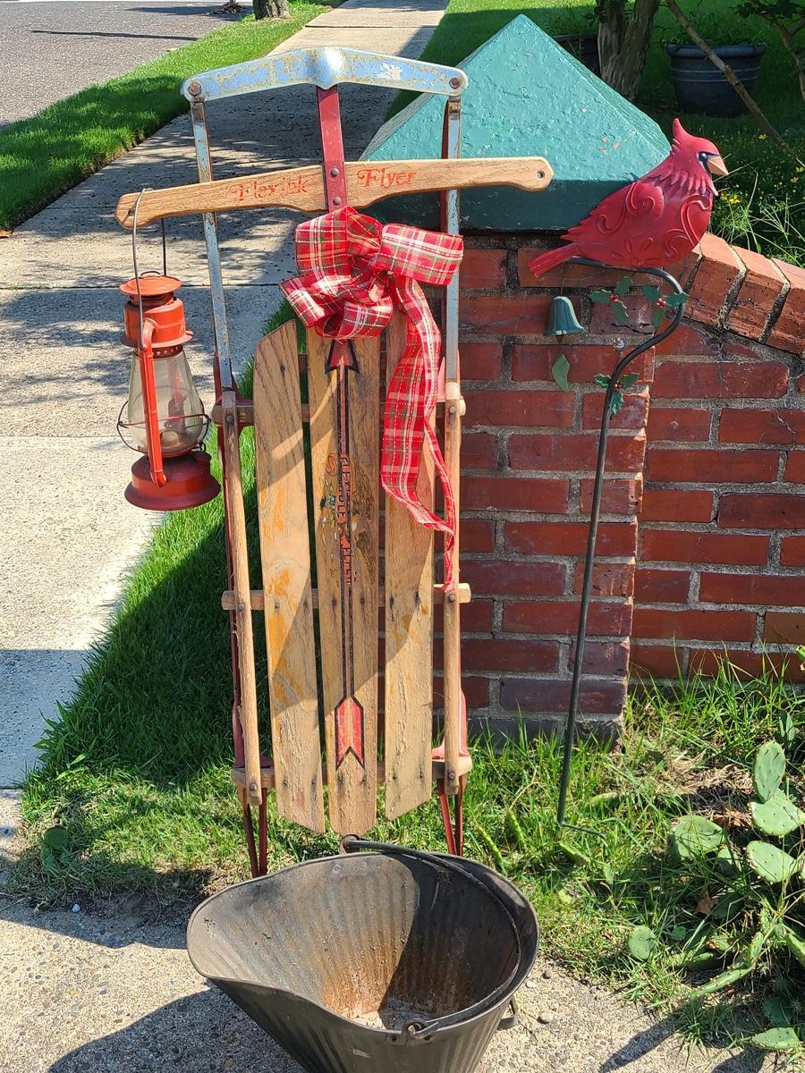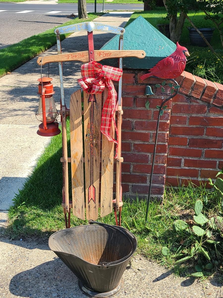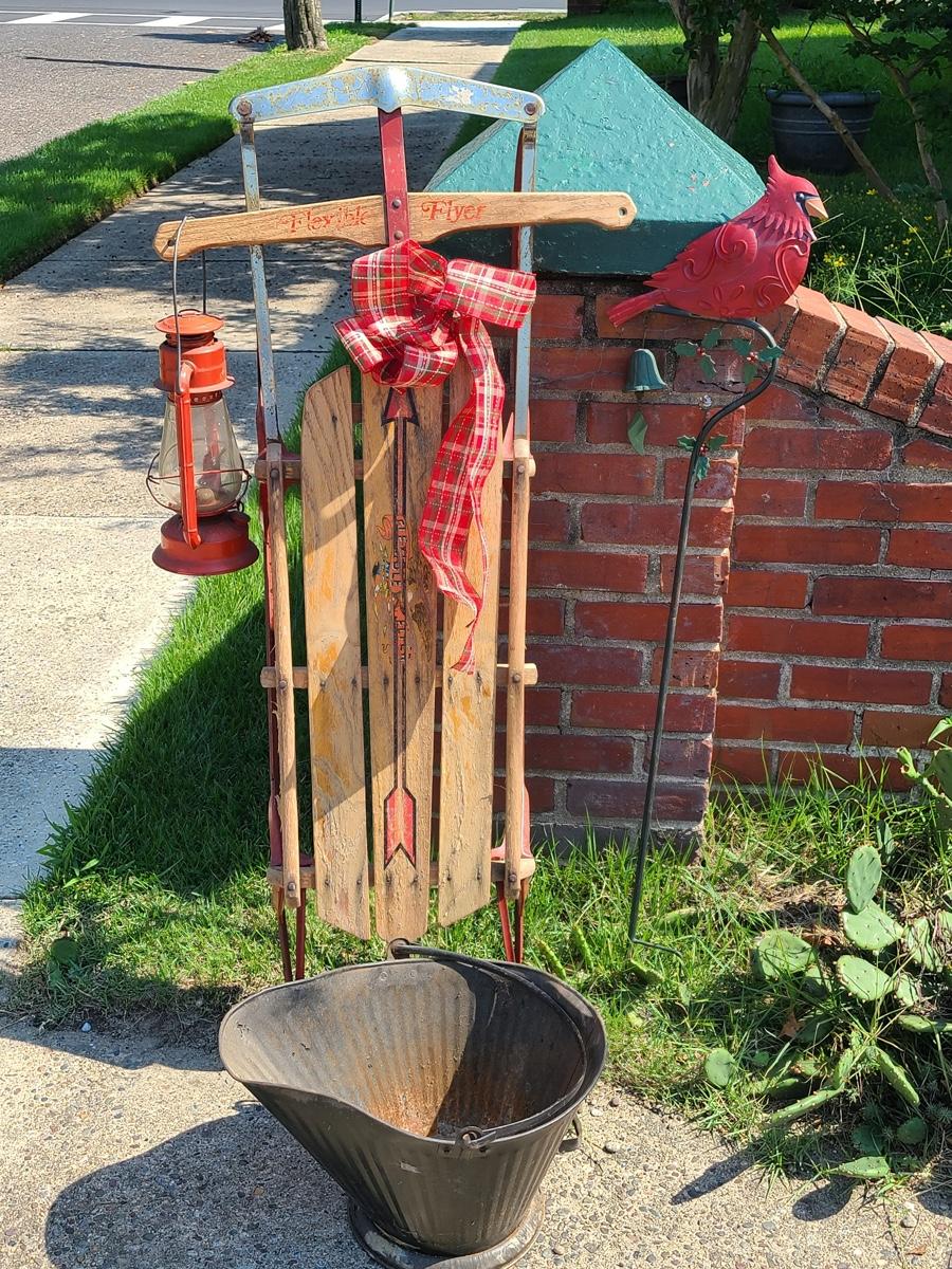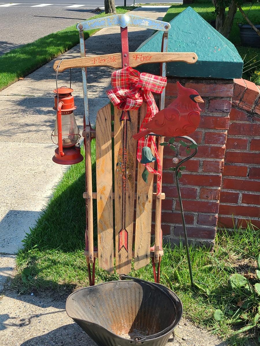 Lot 191: Vintage Flexible Flyer Sled, Dietz Red Lantern, Cardinal Yard Stake and More