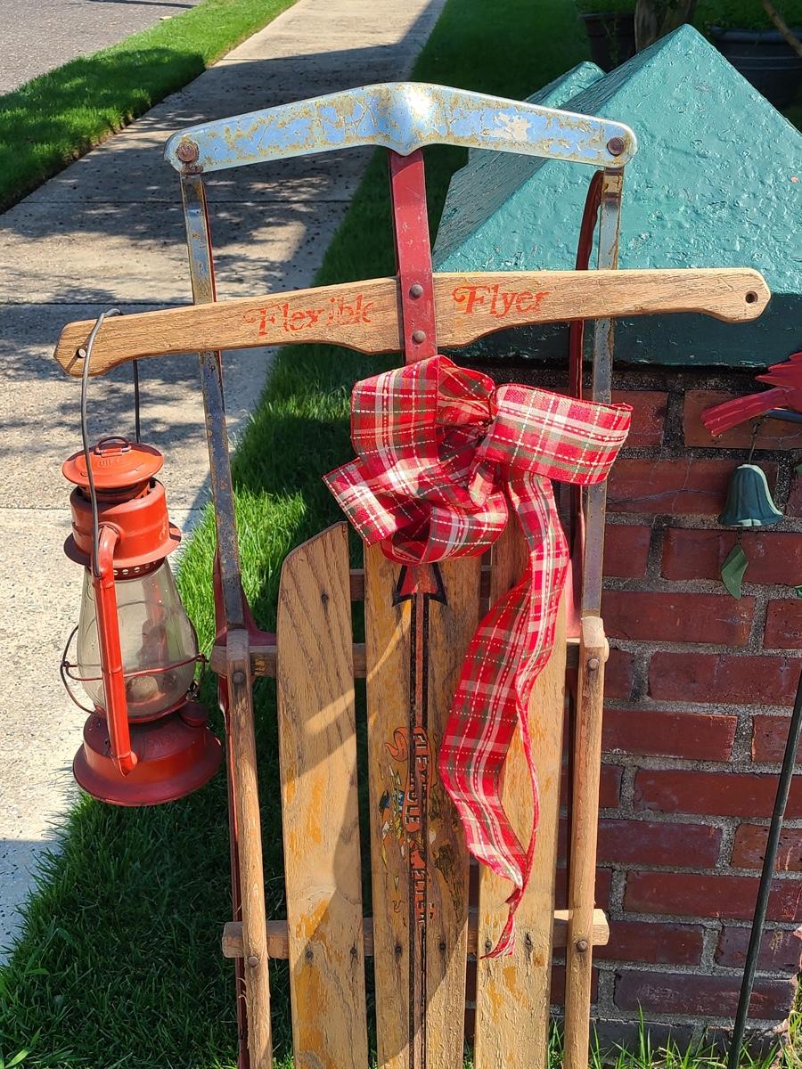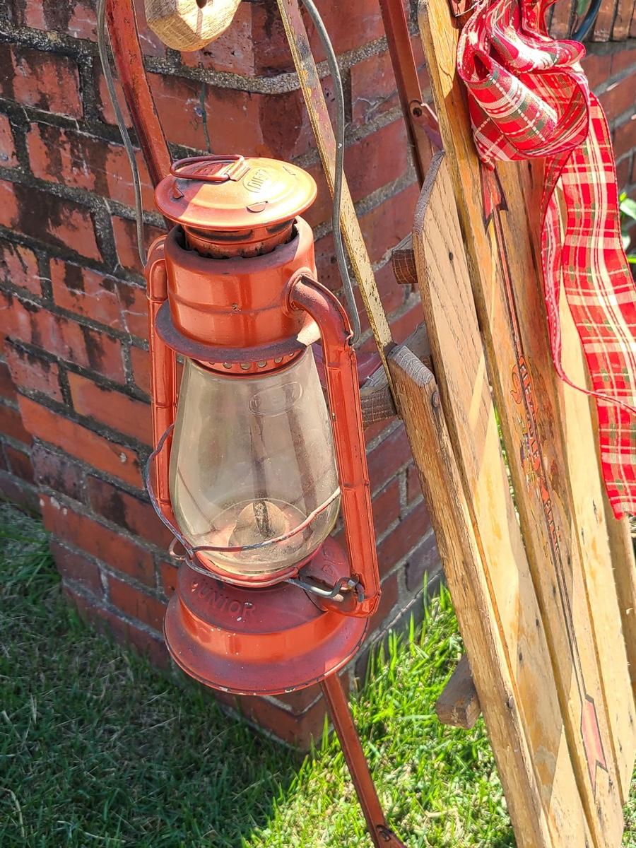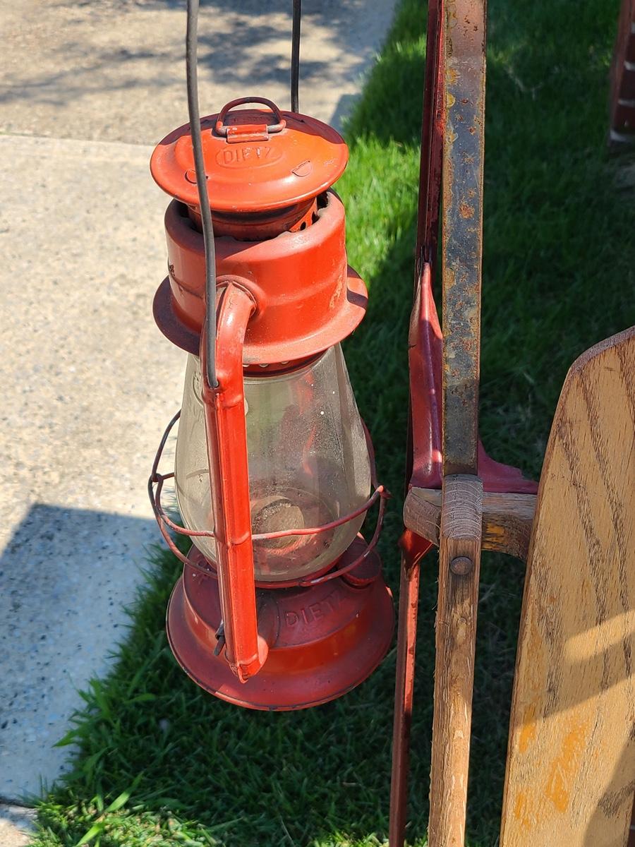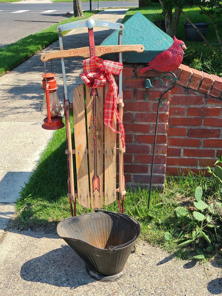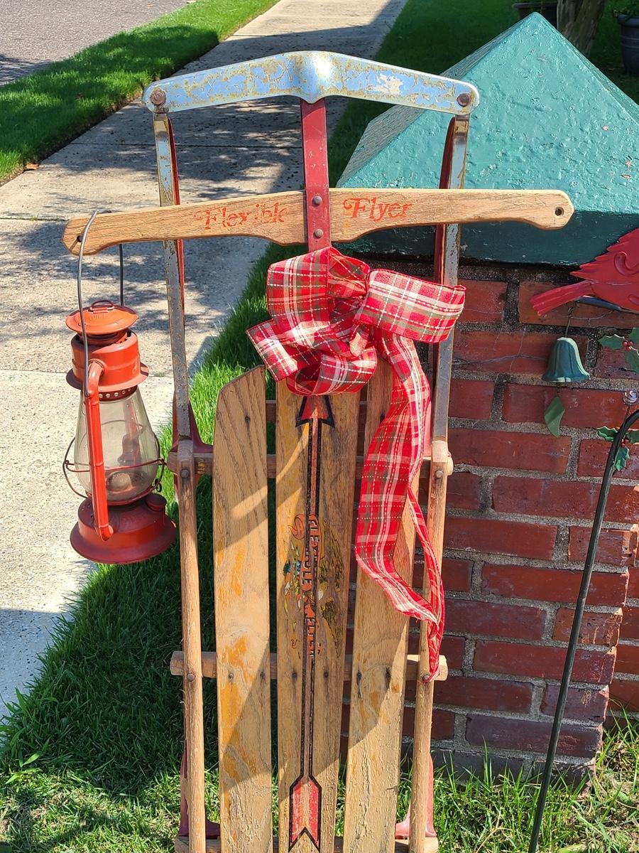Lot 191: Vintage Flexible Flyer Sled, Dietz Red Lantern, Cardinal Yard Stake and More