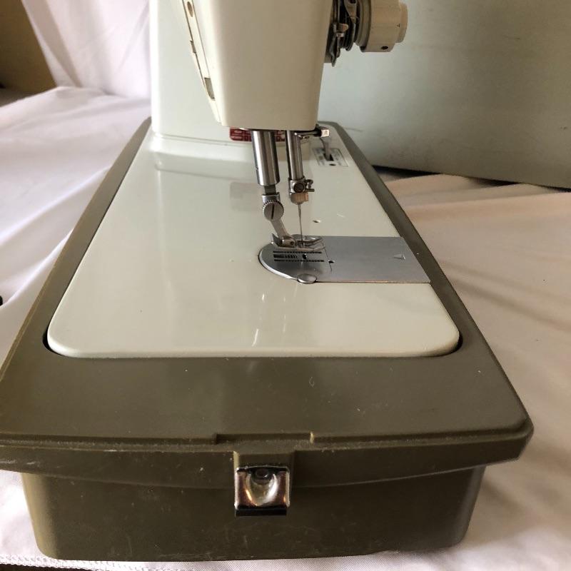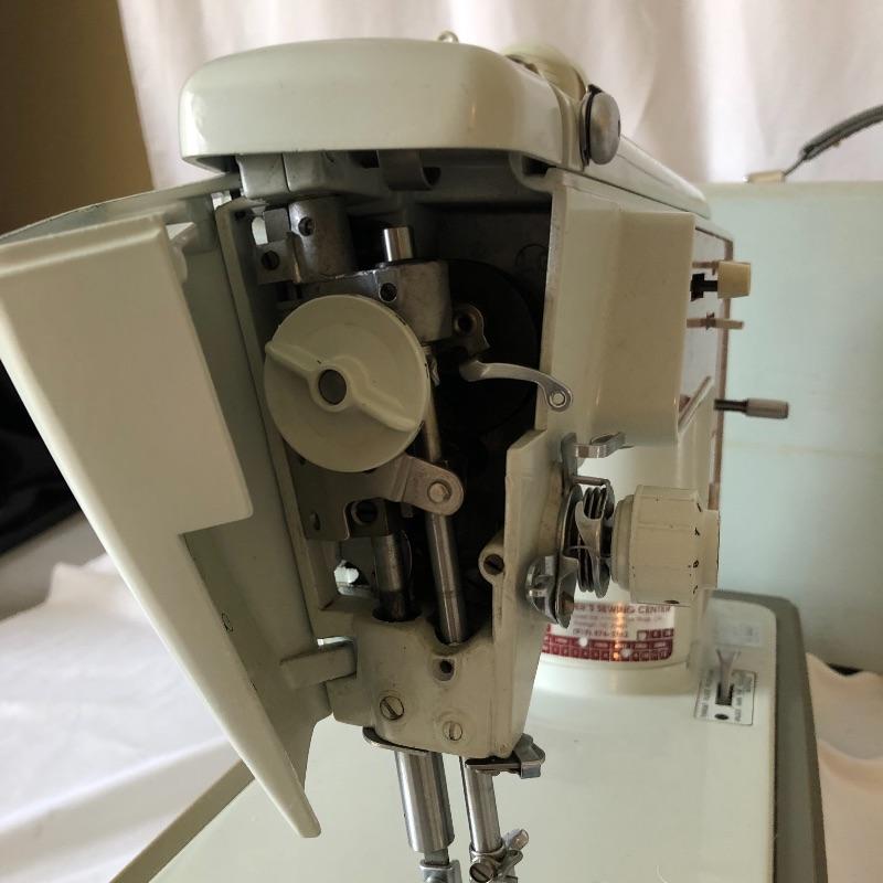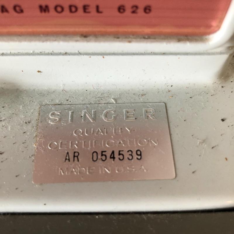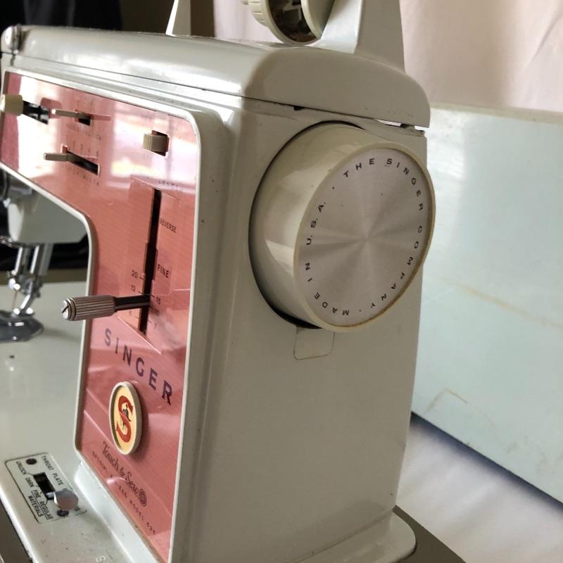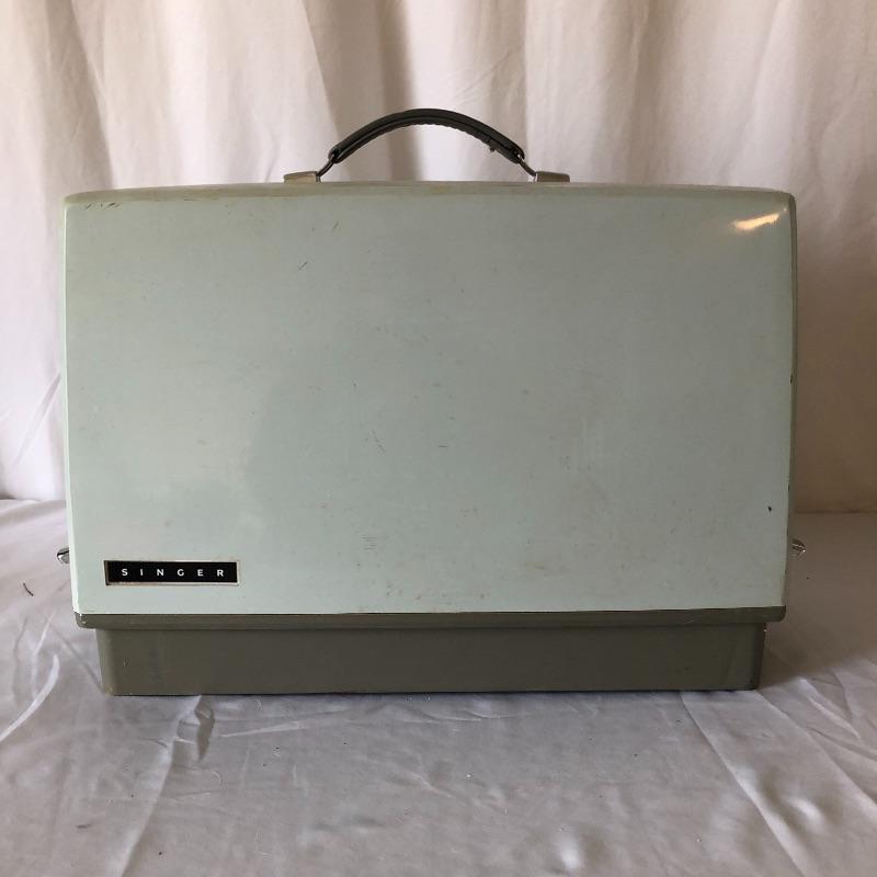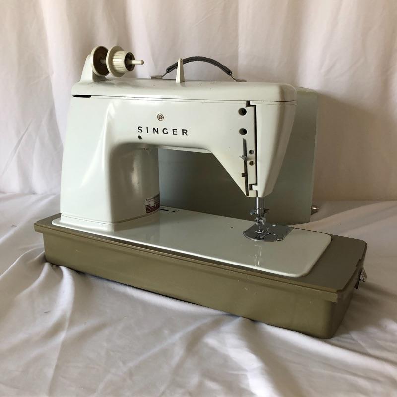 This Singer sewing machine is model number 626, it’s in great condition but it is missing its foot pedal (often can be found on EBay) and therefore we were not able to try it. It measures 7” deep x 18” wide x 14” tall.