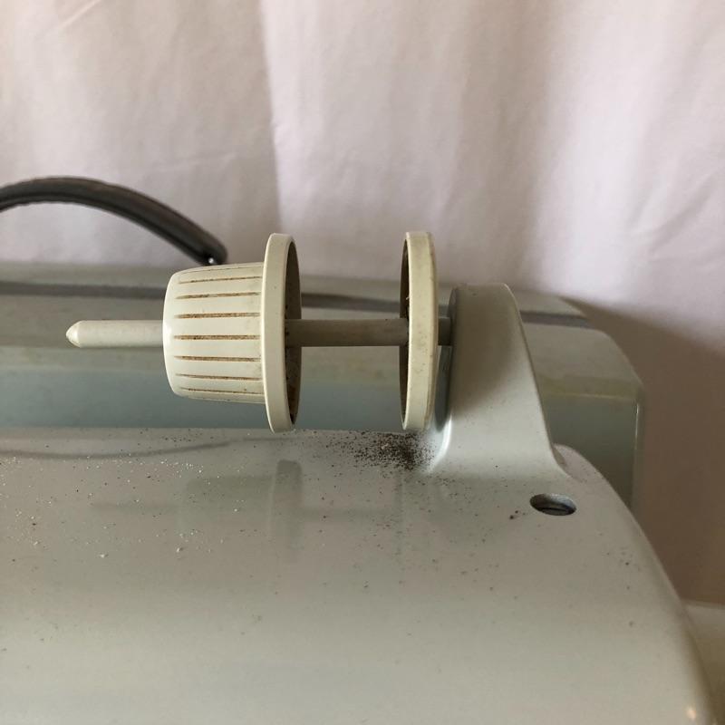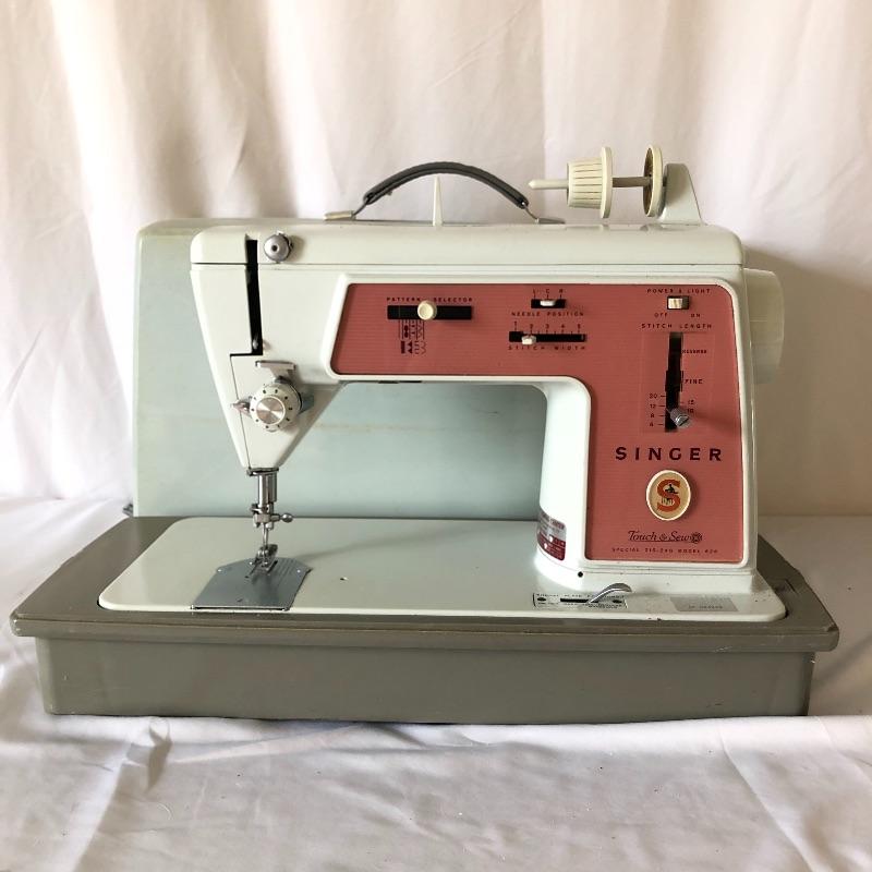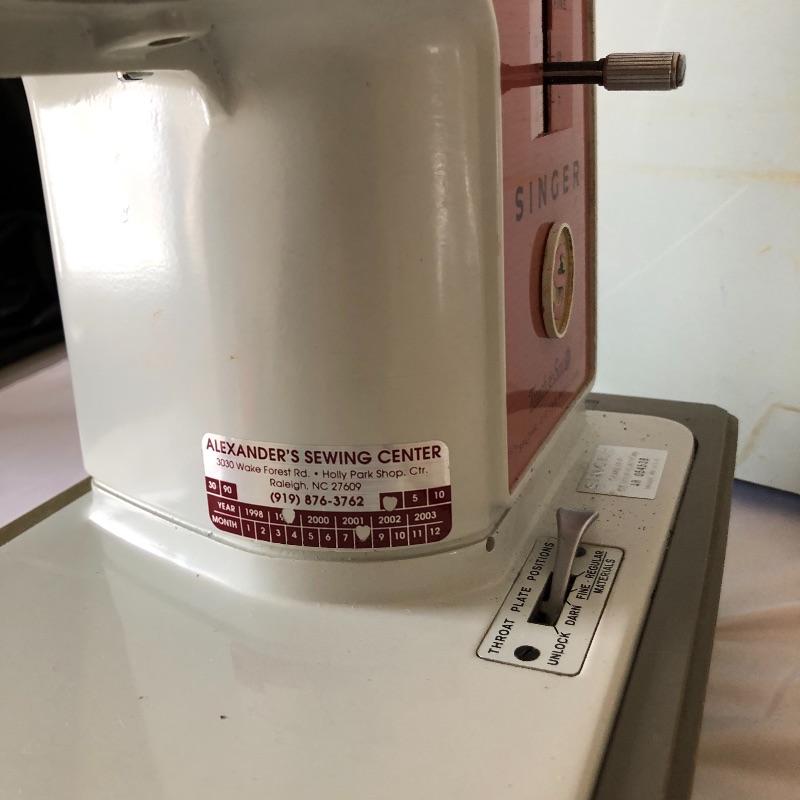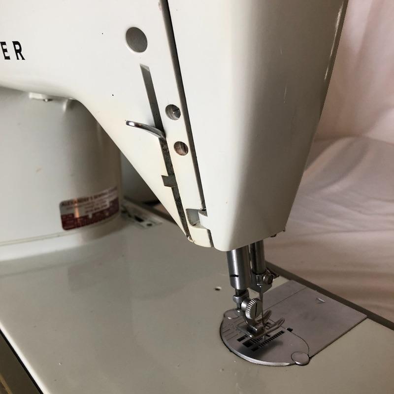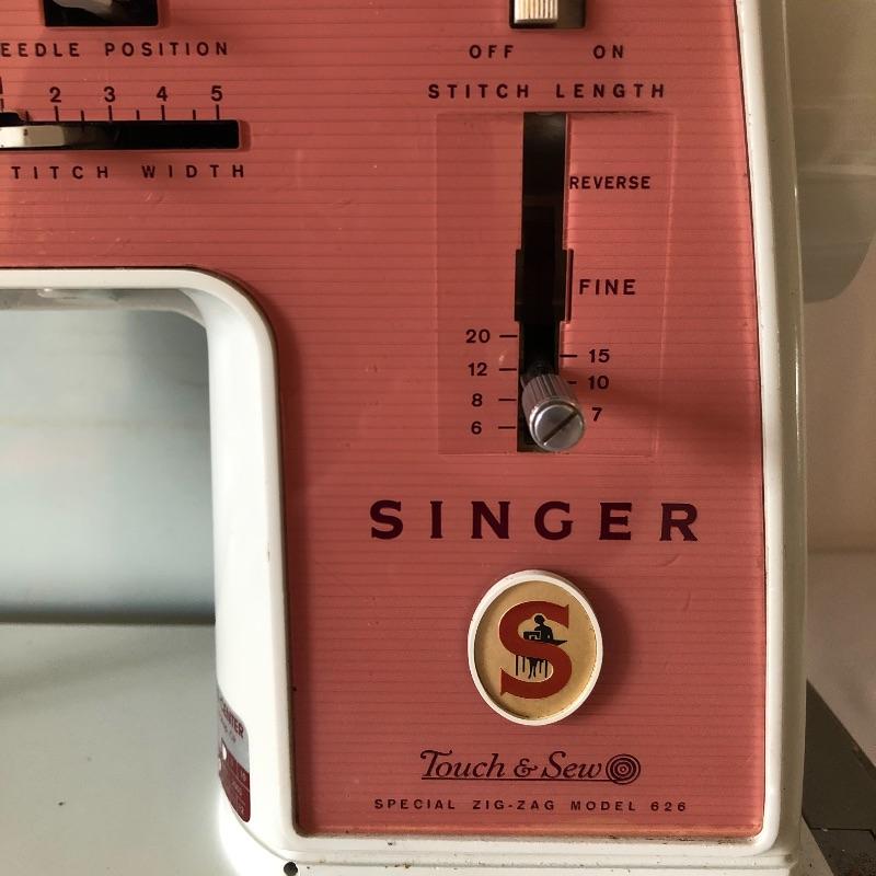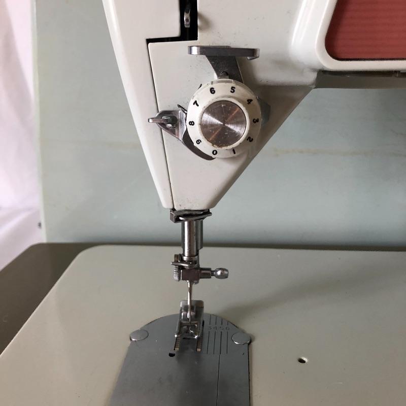 This Singer sewing machine is model number 626, it’s in great condition but it is missing its foot pedal (often can be found on EBay) and therefore we were not able to try it. It measures 7” deep x 18” wide x 14” tall.