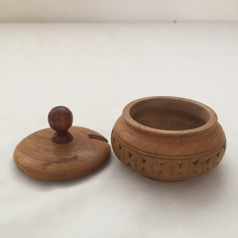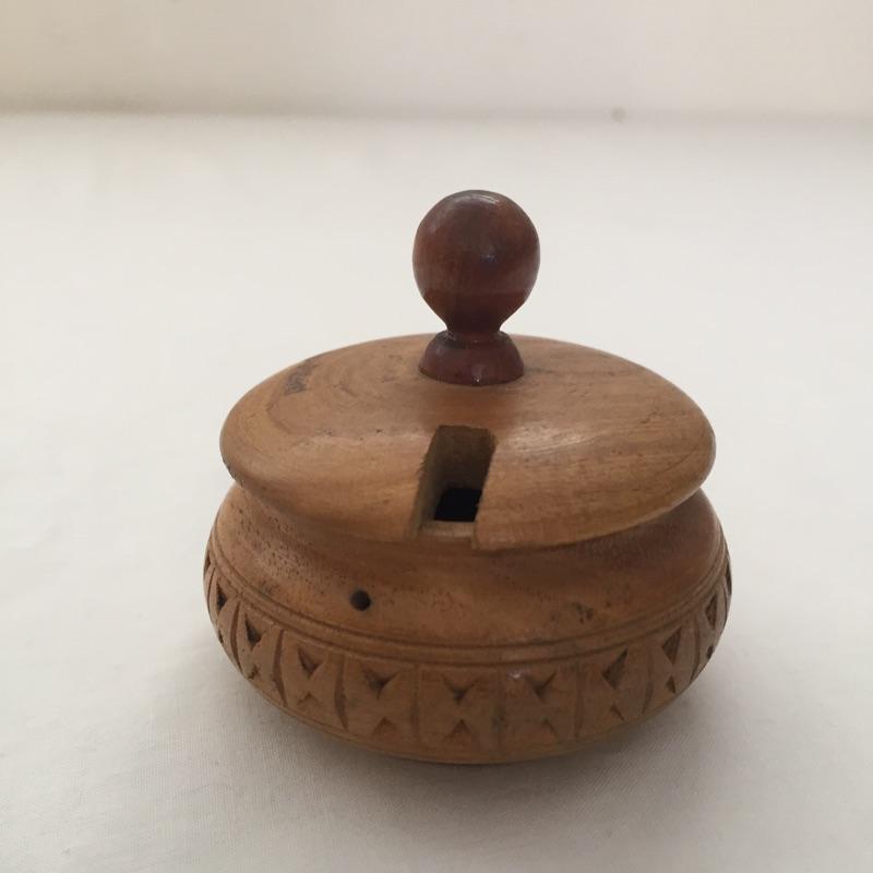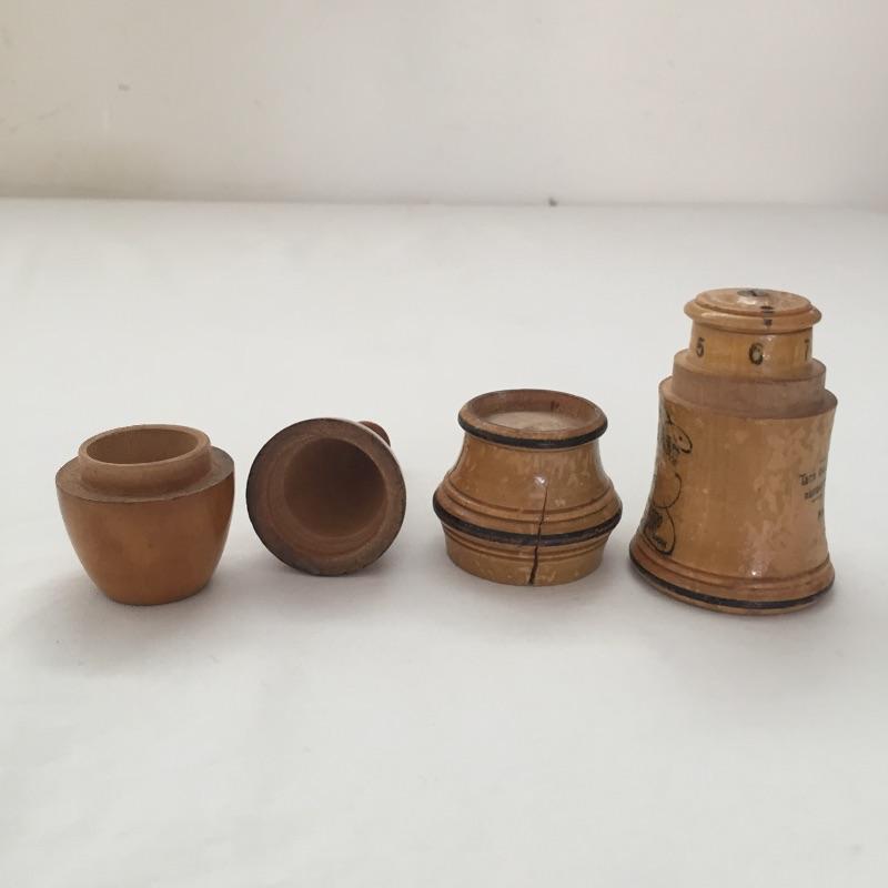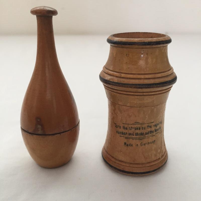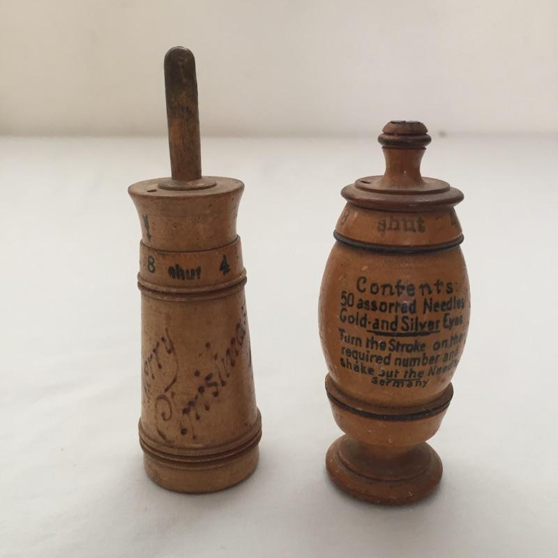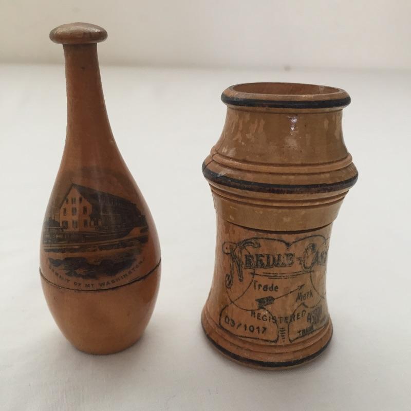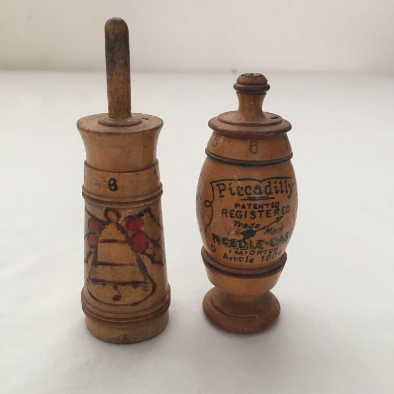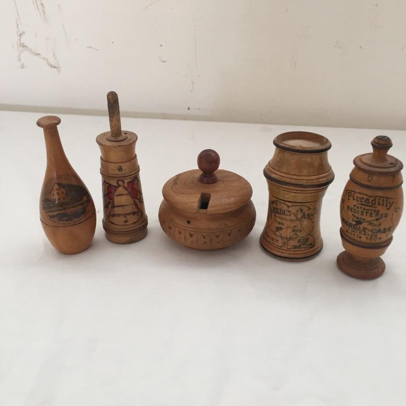 Five wooden needle cases with advertisements and other adornments. Tallest holder measures 3.5” tall. One top has small split - see pictures.