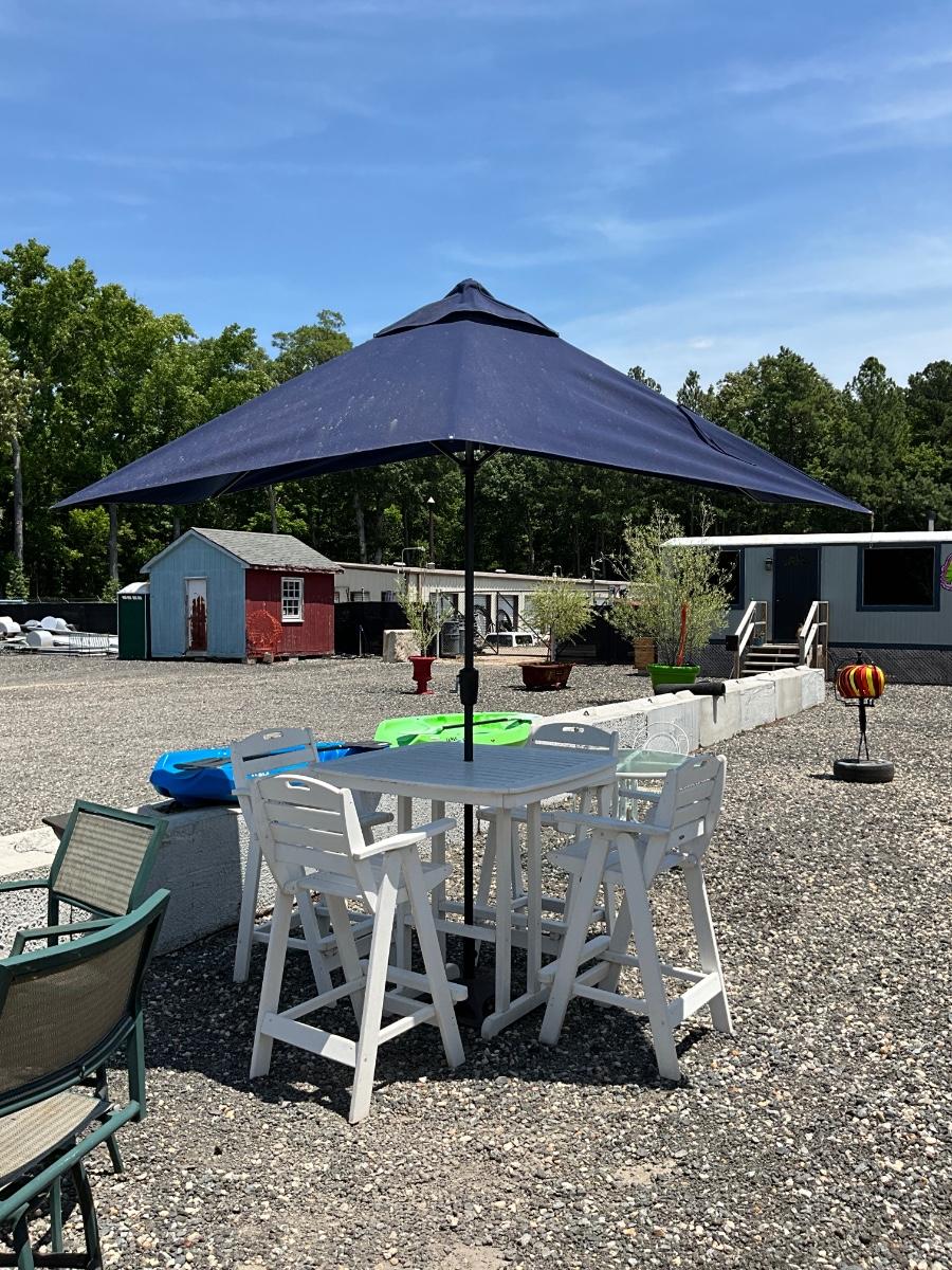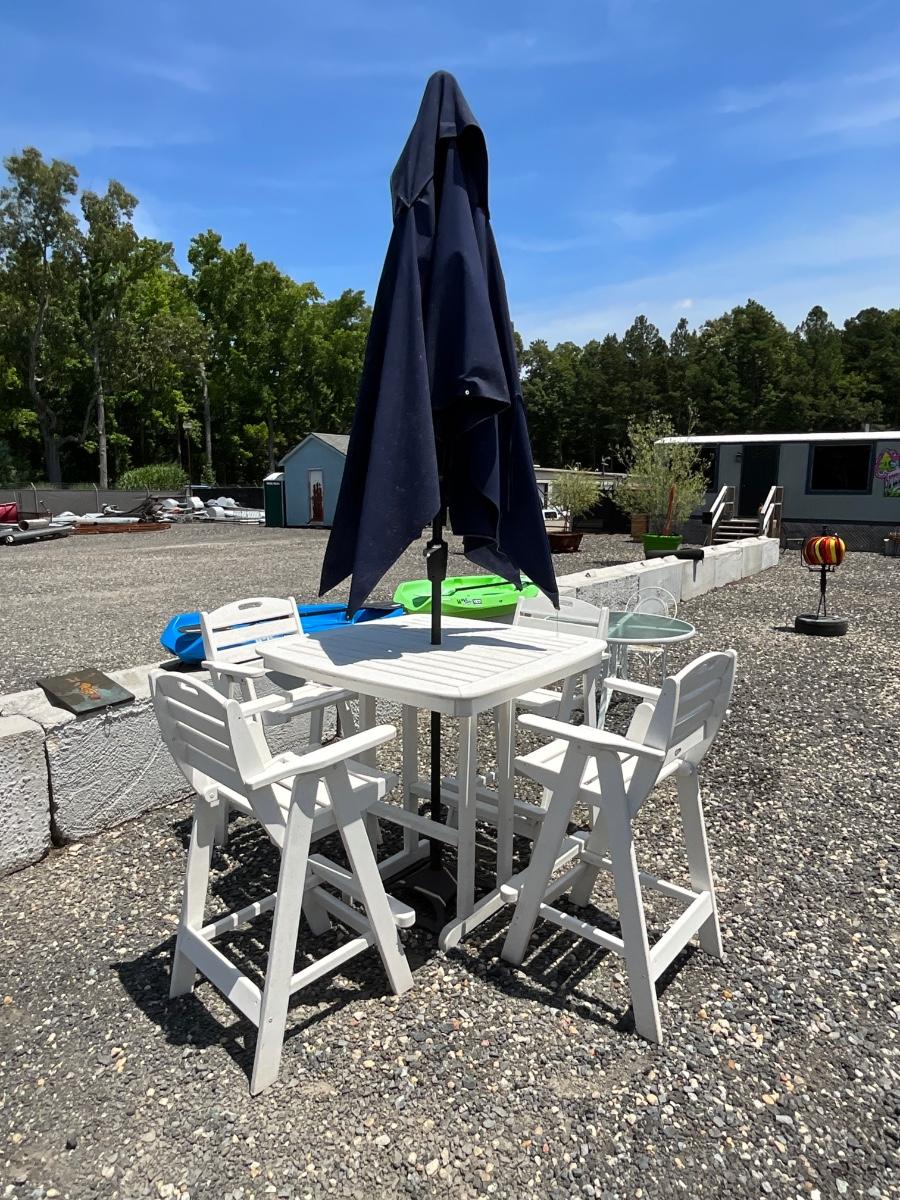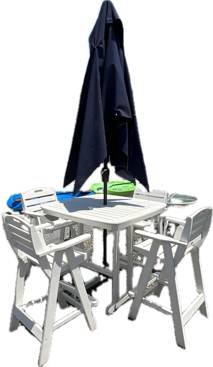 Lot# 191 White High Top Poly-Wood Table with Four High Top Chairs &. Umbrella